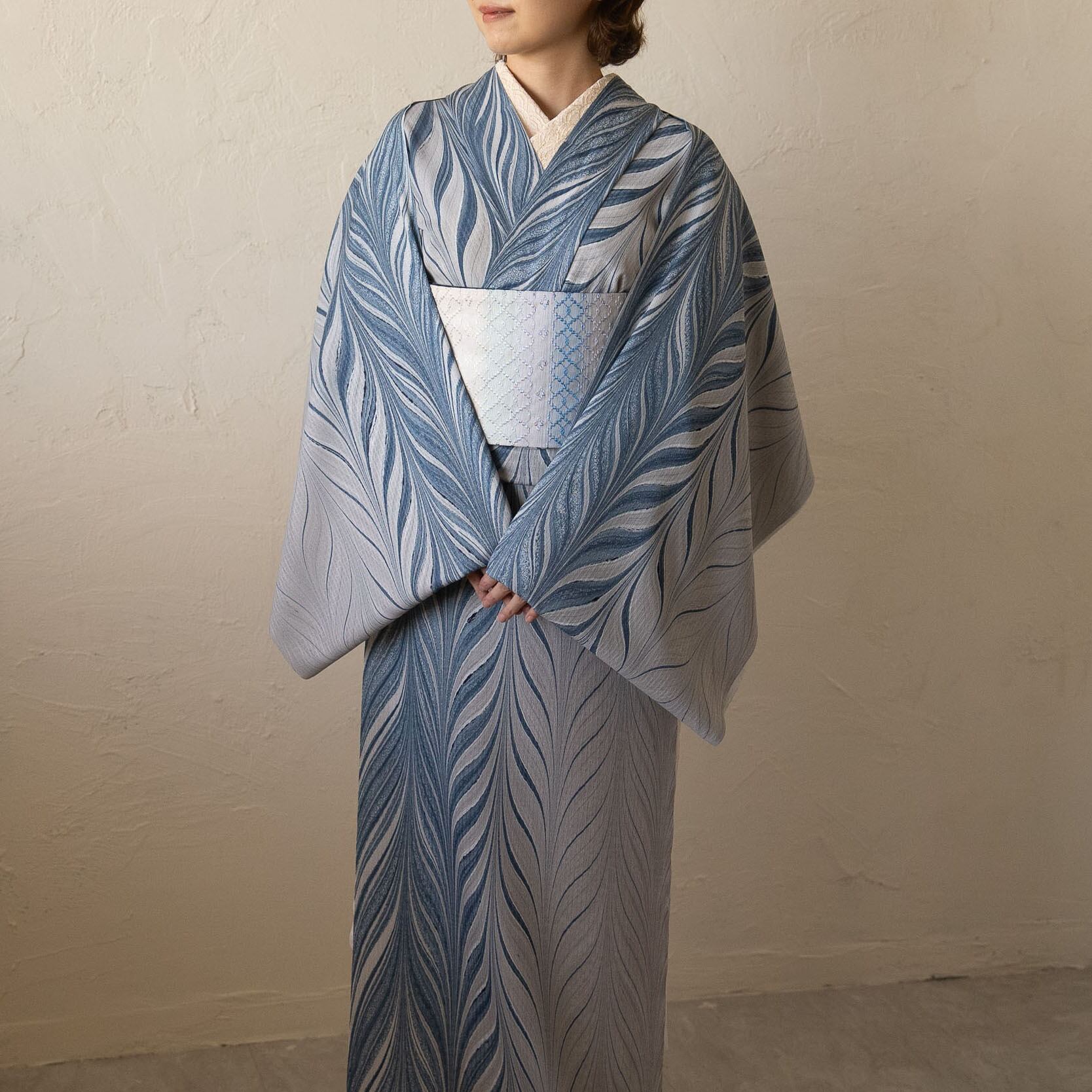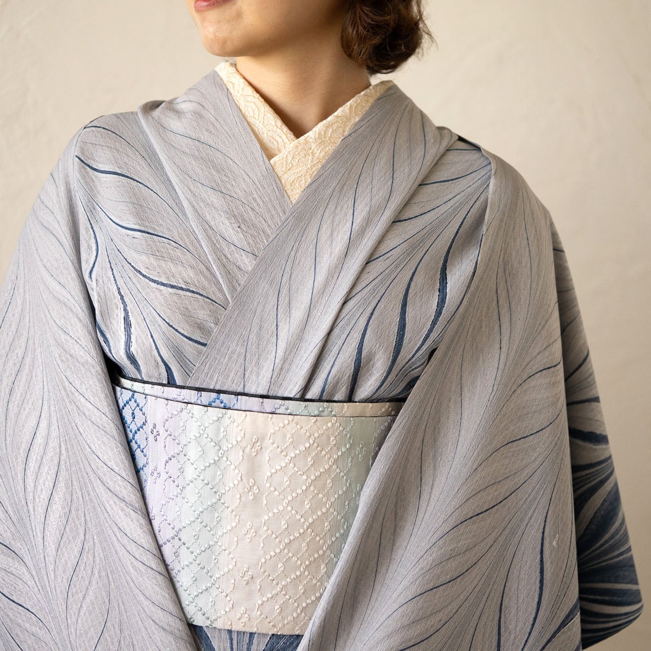 微細な艶のある格子とちりめん調の織りを加えることで、よりやわらかく、シルキーな質感と奥行きのある艶感を実現しています。