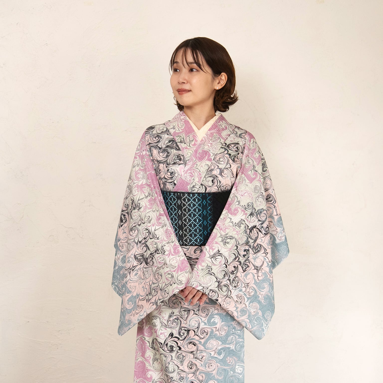 配色は、水色・ピンクベージュ・紫ピンク・淡いグリーン・ブラックの5色を用い、多色使いによる染め分けを施しました。落ち着きのある色合いの中に、なめらかなグラデーションが溶け合い、蜜に溶ける夢を思わせる幻想的な表情を生み出しています。