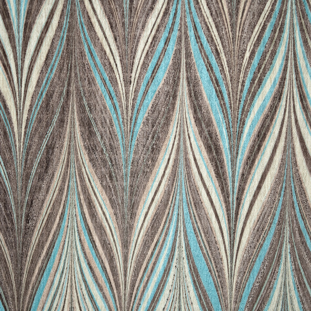 ブラウン、ベージュ、クリームなどのやわらかなニュアンスカラーをベースに、ターコイズブルーのアクセントが全体に程よい抜け感と爽やかさを添えています。