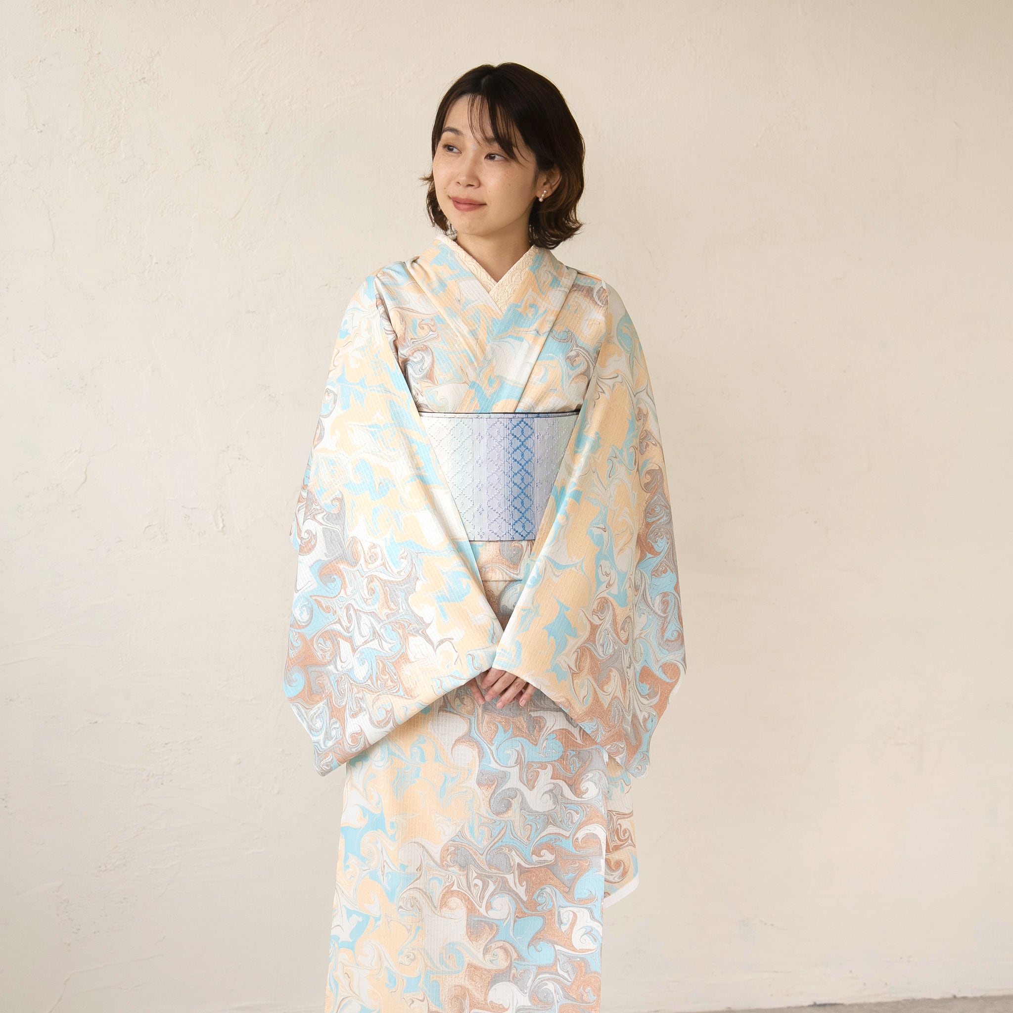 「Cinderella beige〜キャラメリゼ〜」マーブル柄❤︎洗えるきもの(シルジェリー格子柄)〜