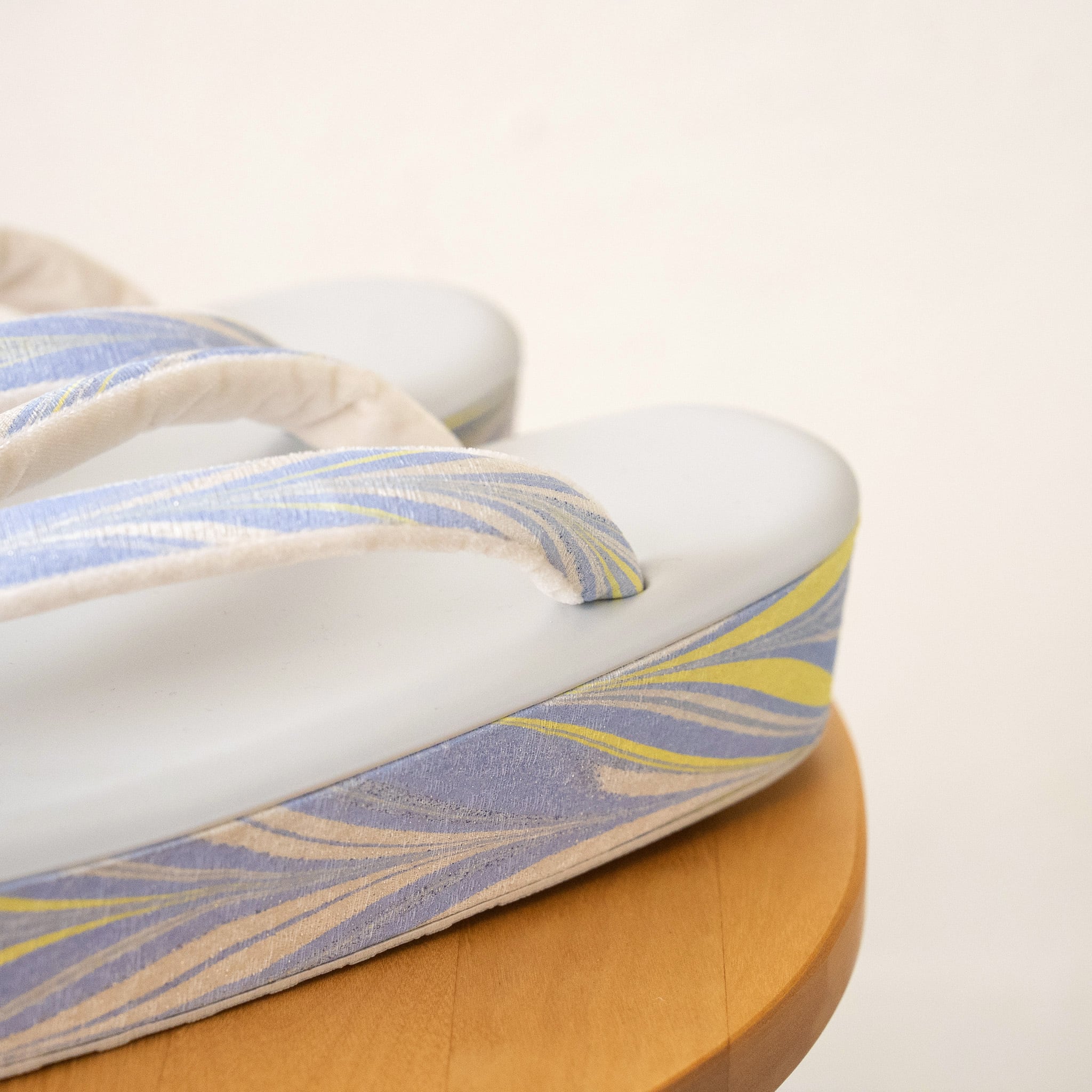 墨流し技法で一点ずつ手染めされた生地を、鼻緒と側面にあしらった草履です。