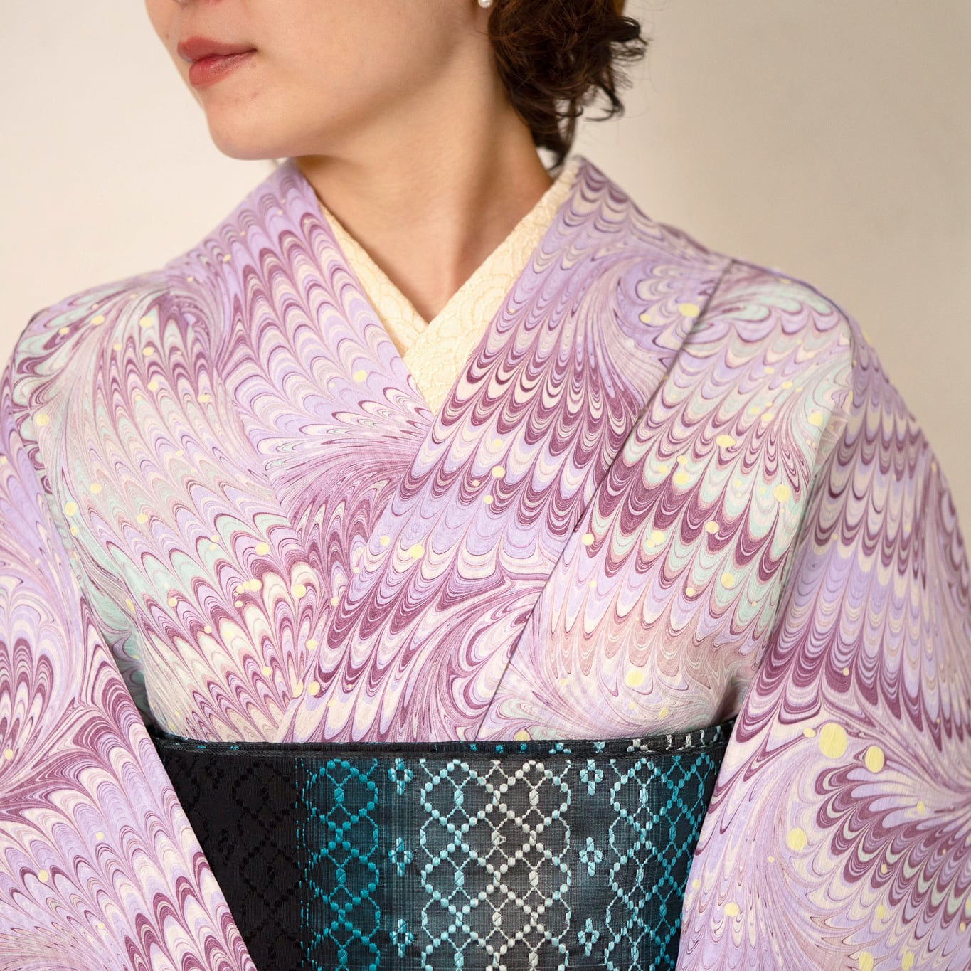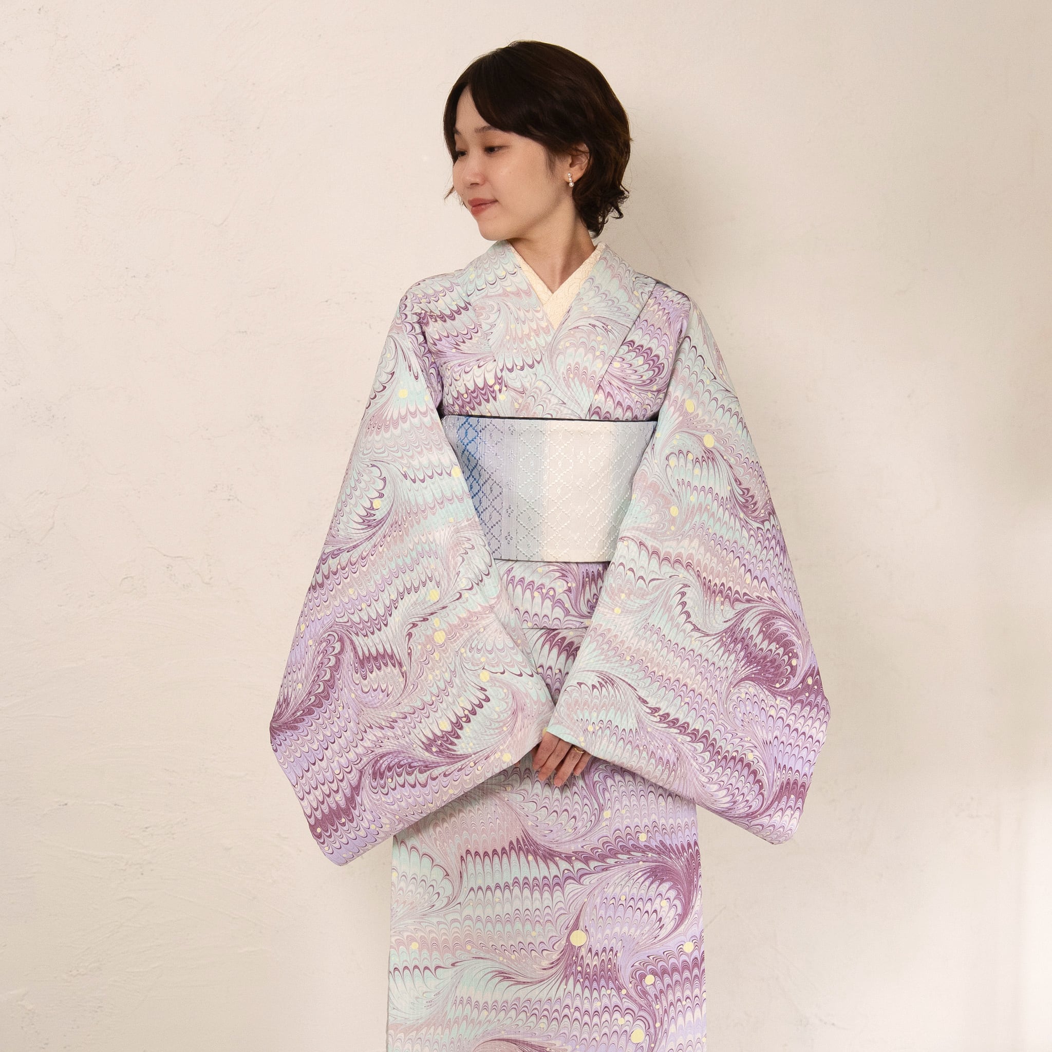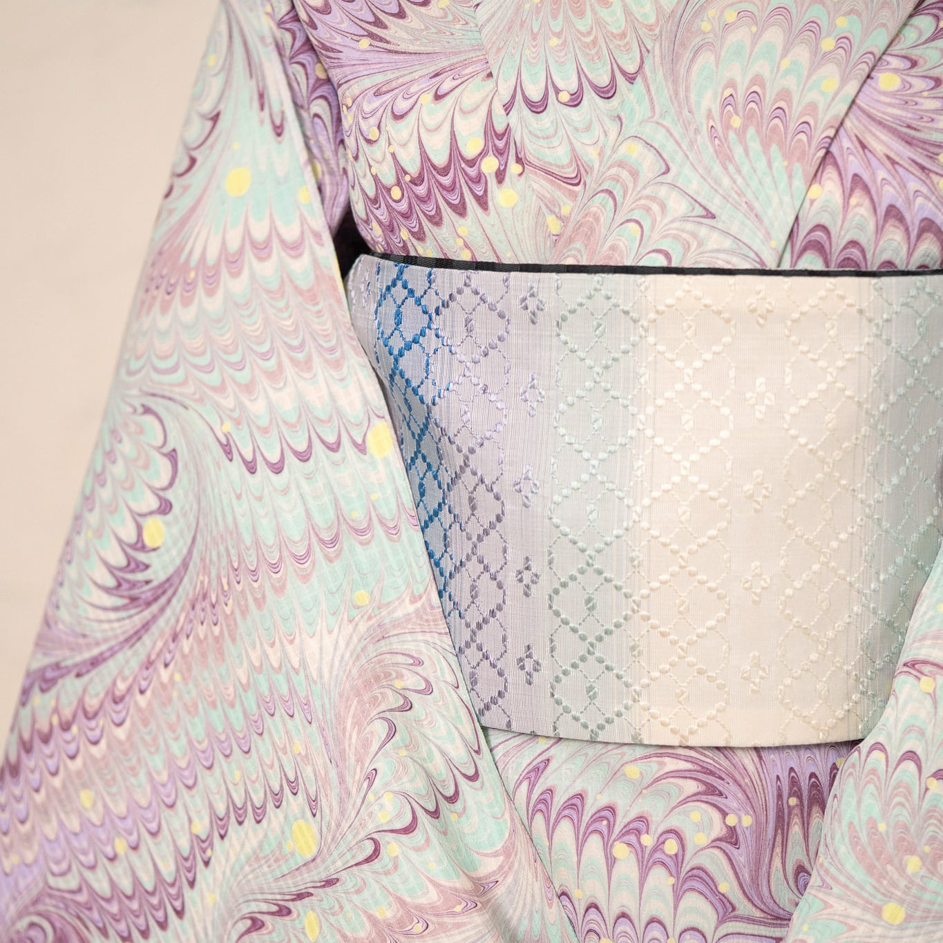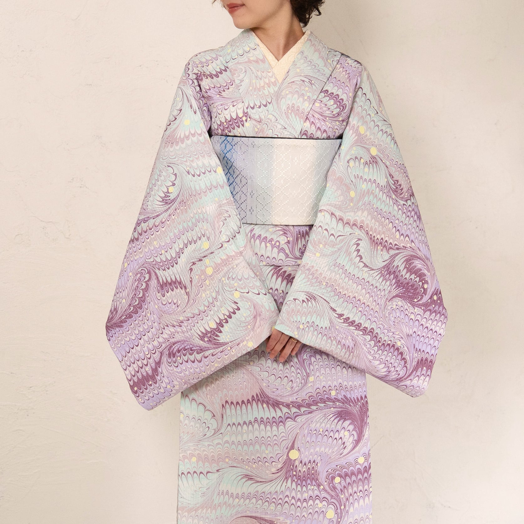 淡い藤色とミントグリーンをベースに、モーブピンクや深い葡萄色など、いくつもの色を重ね、