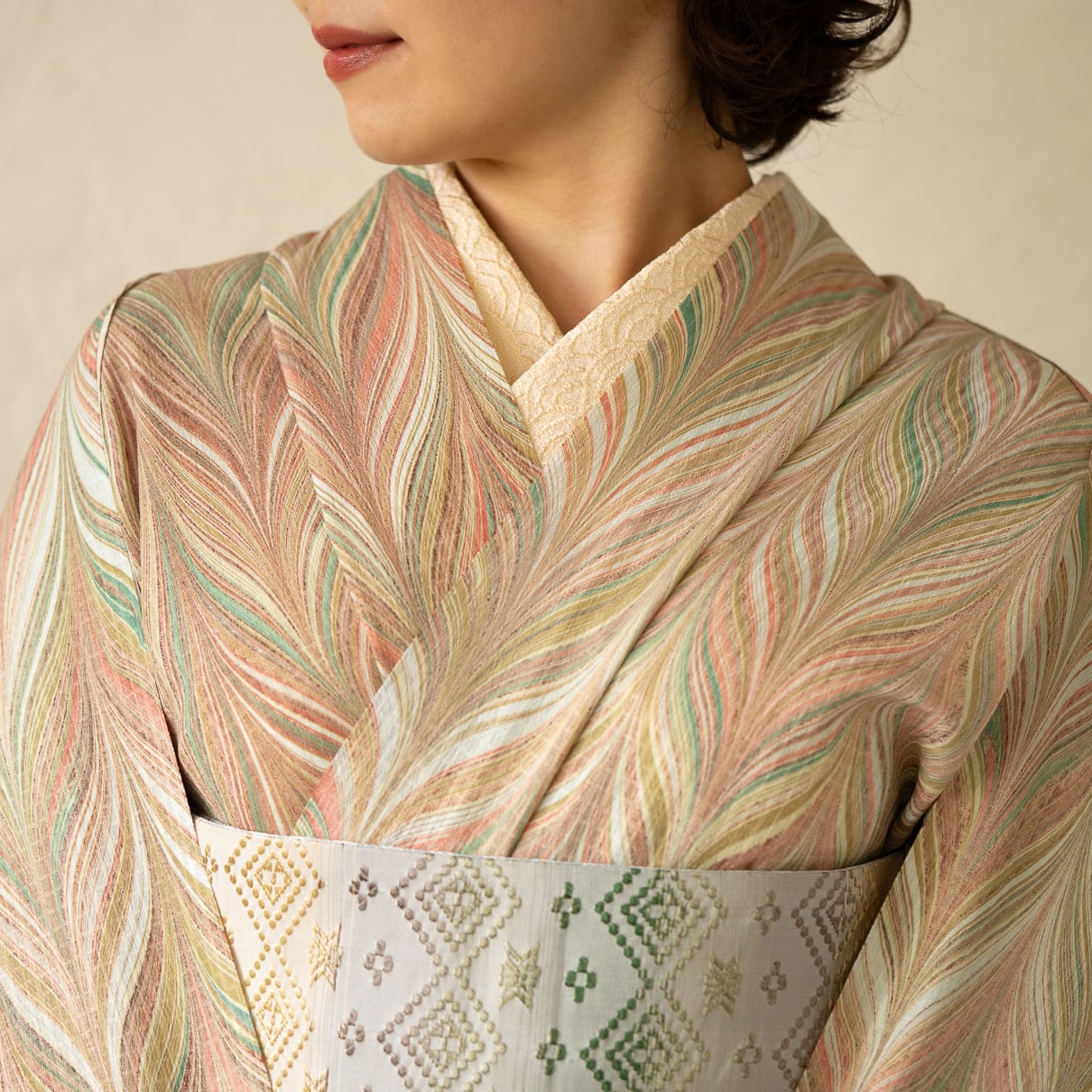 微細な艶のある格子とちりめん調の織りを加えることで、よりやわらかく、シルキーな質感と奥行きのある艶感を実現しています。