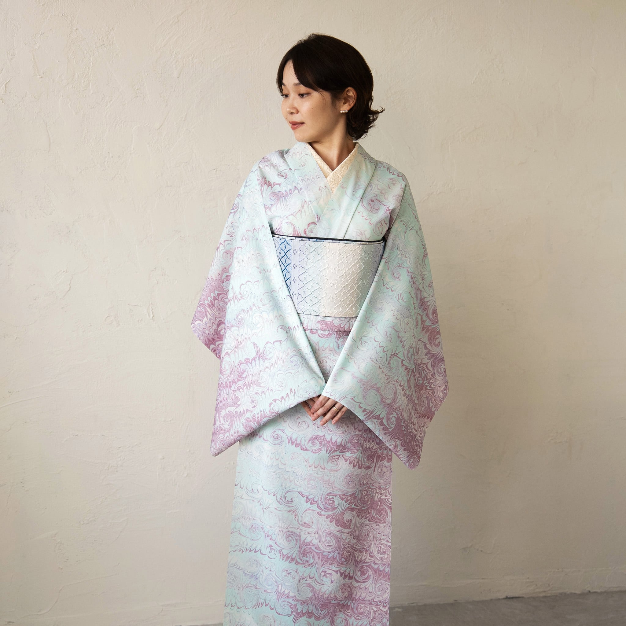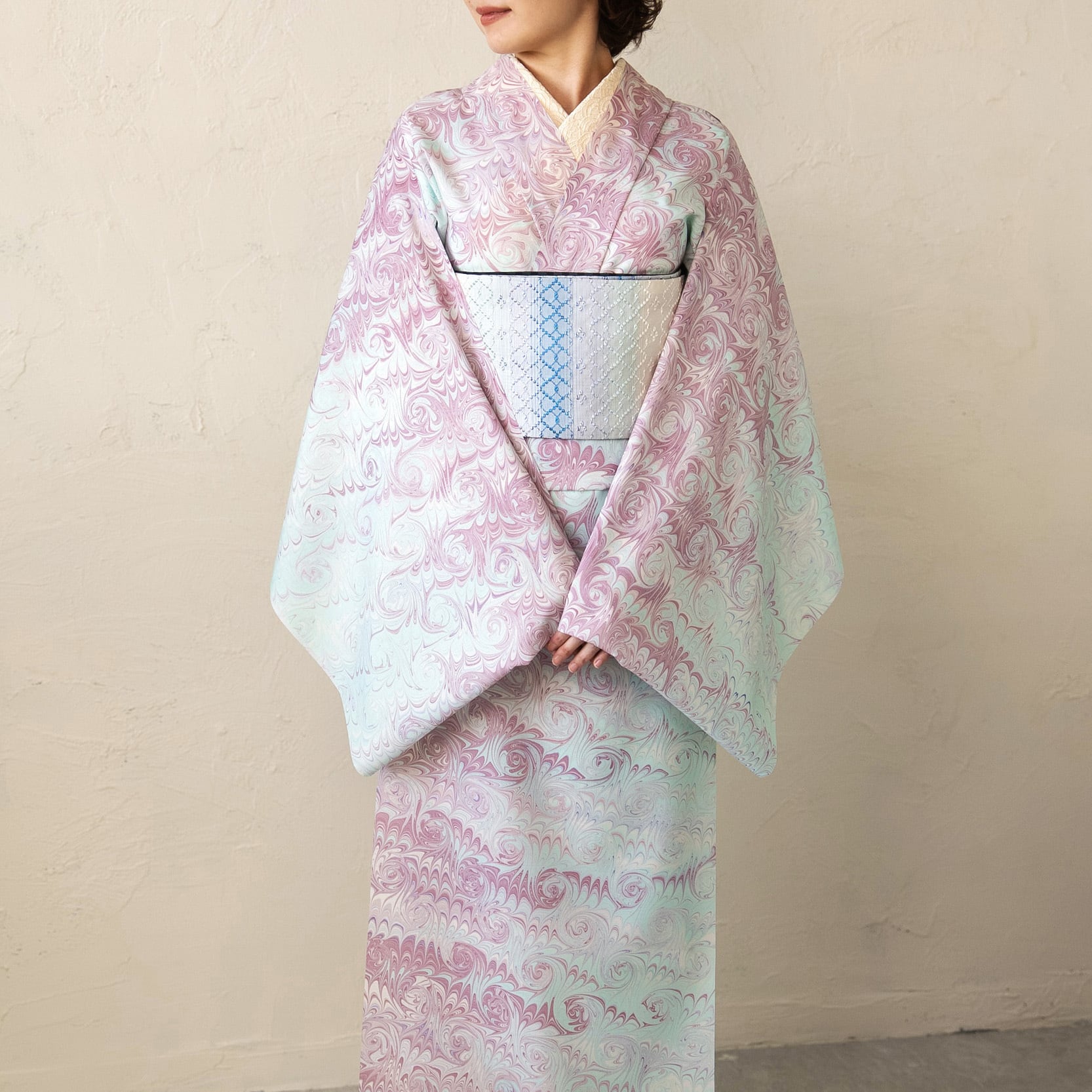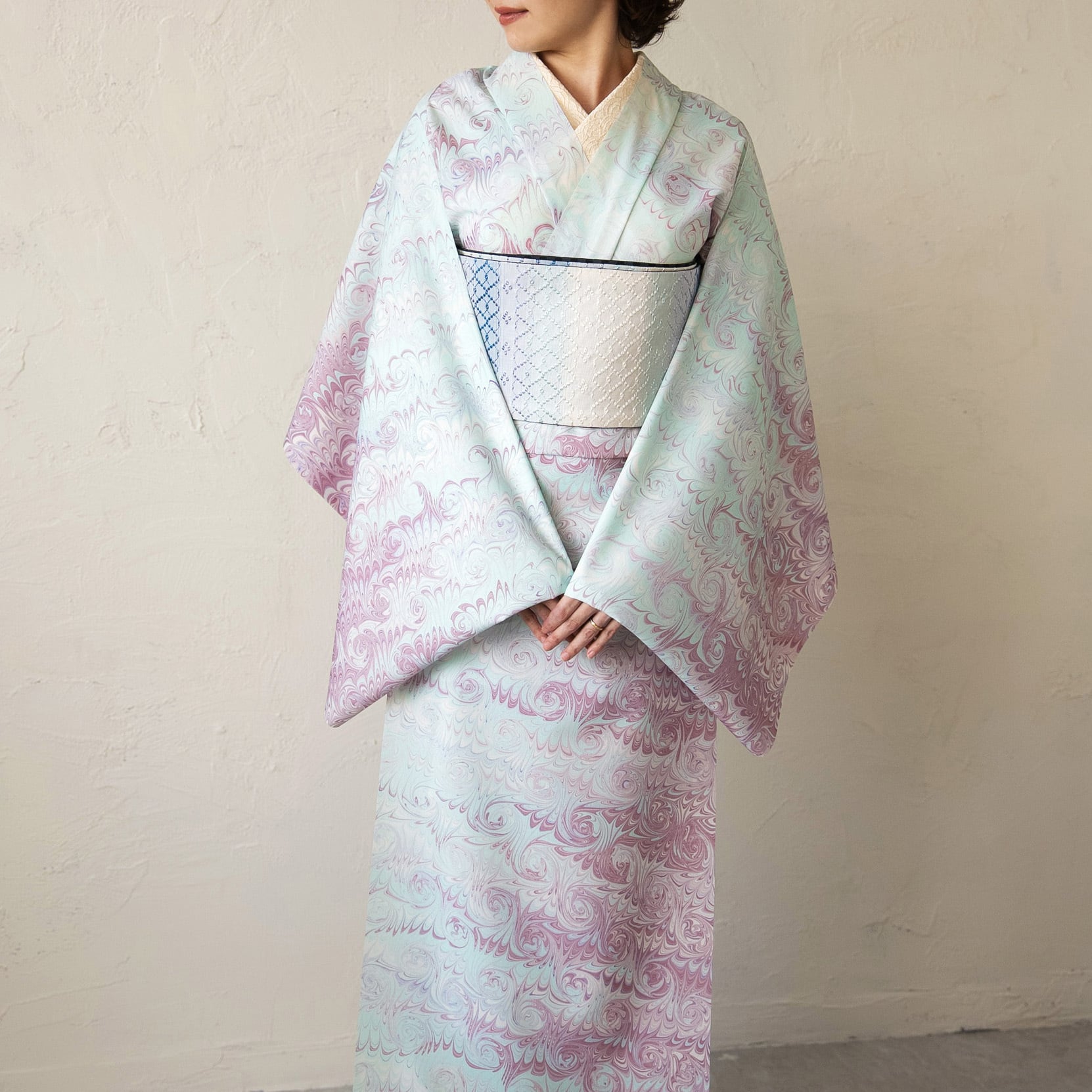 淡い藤色とミントグリーンが溶け合うように染め分けられた「花揺れ」は、