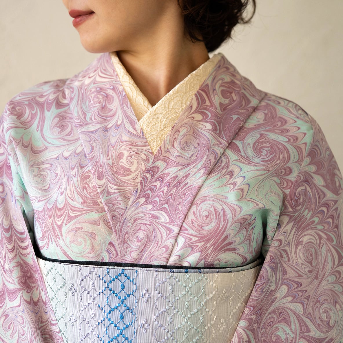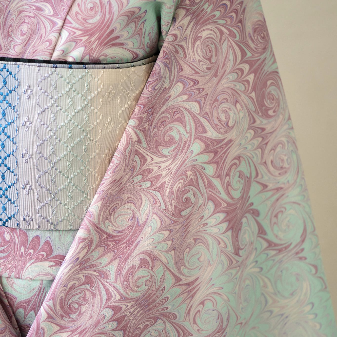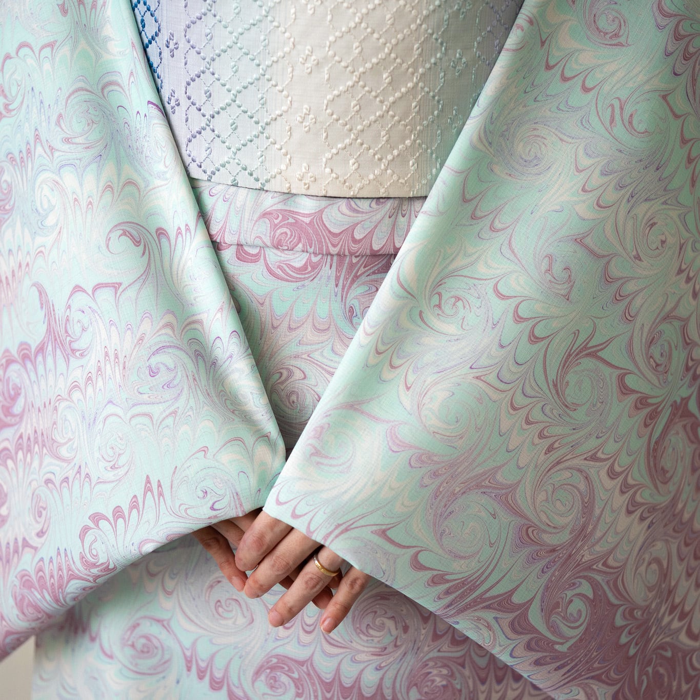 淡い藤色とミントグリーンが溶け合うように染め分けられた「花揺れ」は、
