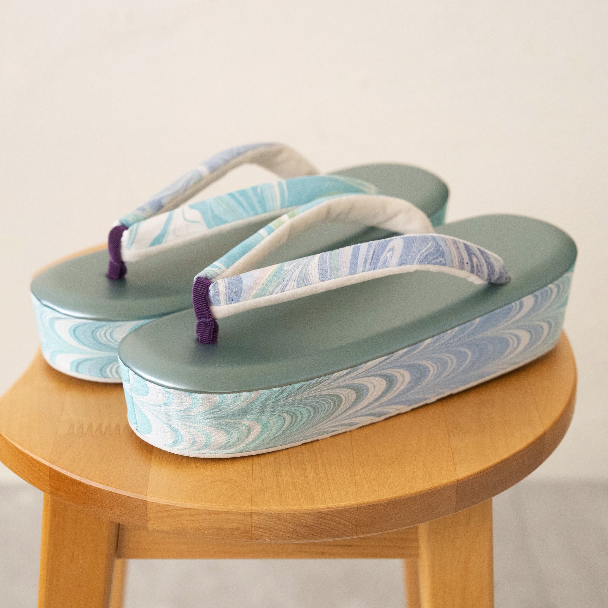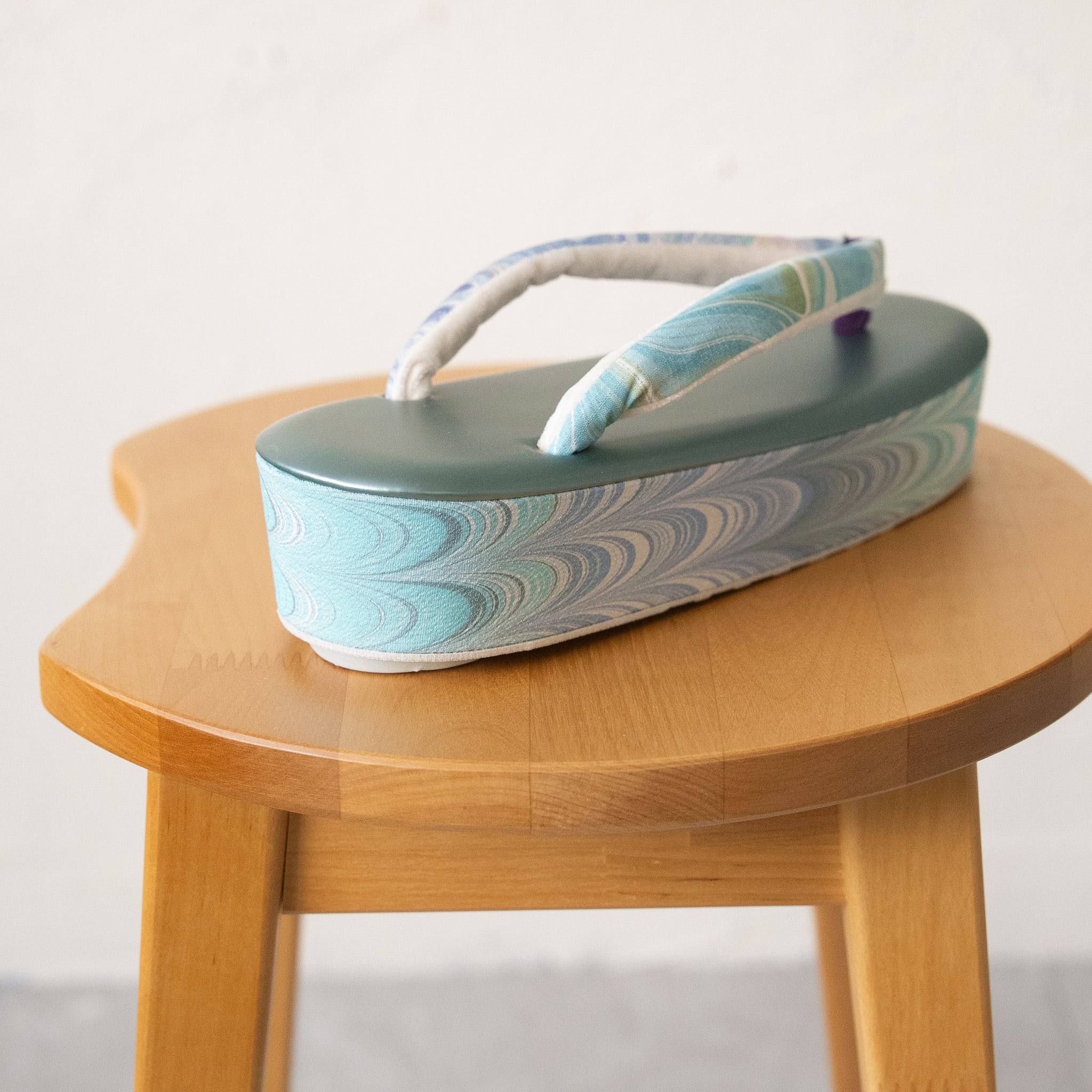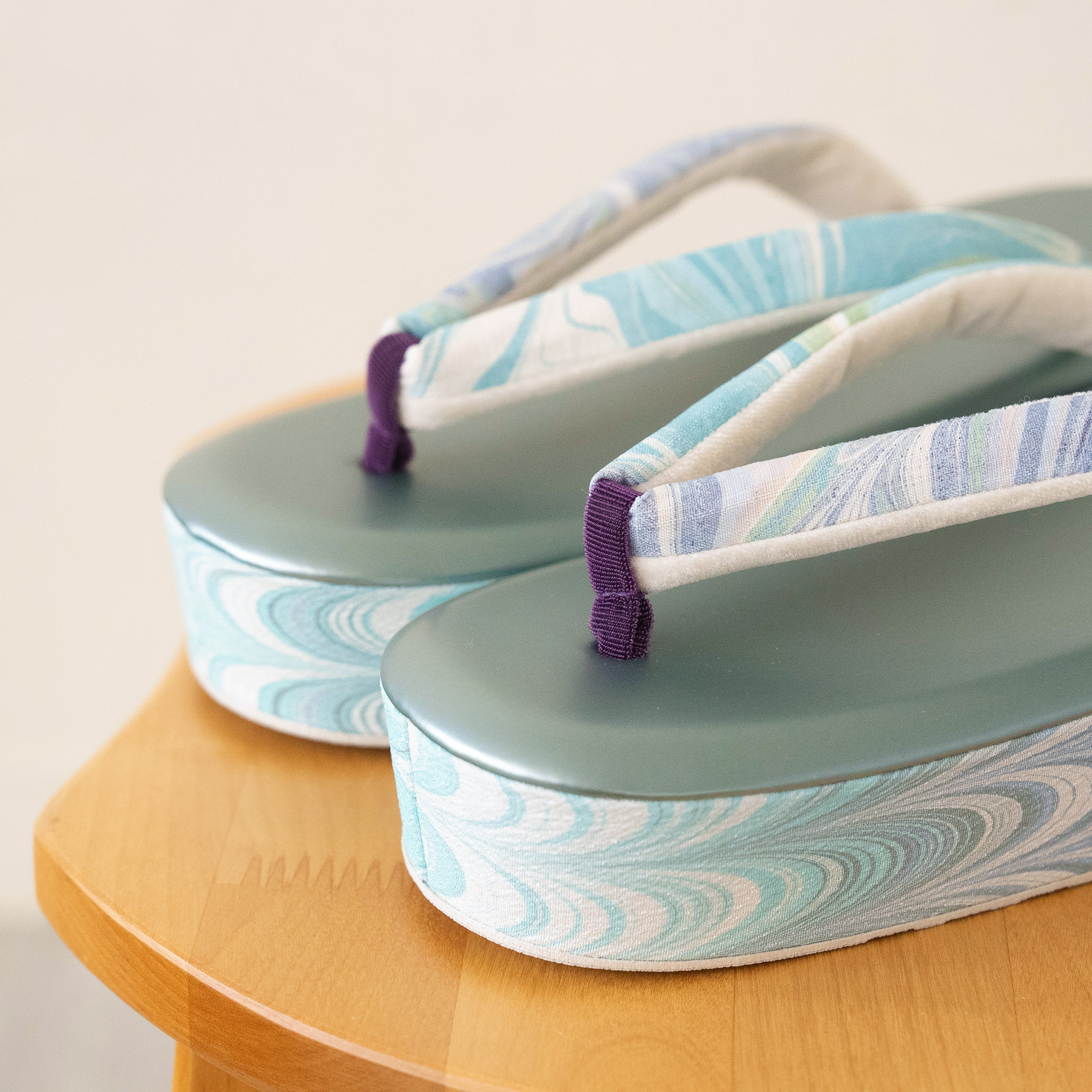 墨流し技法で一点ずつ手染めされた生地を、鼻緒と側面にあしらった草履です。