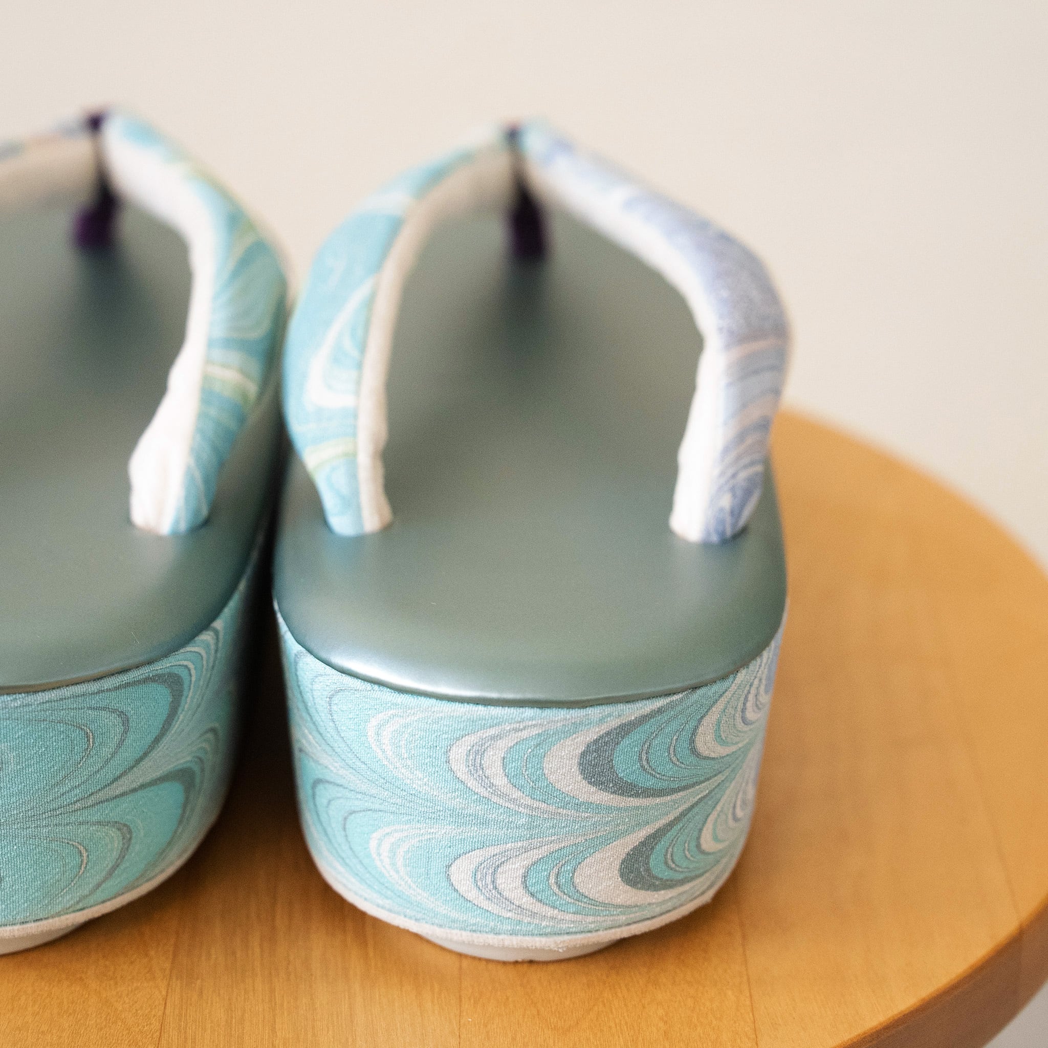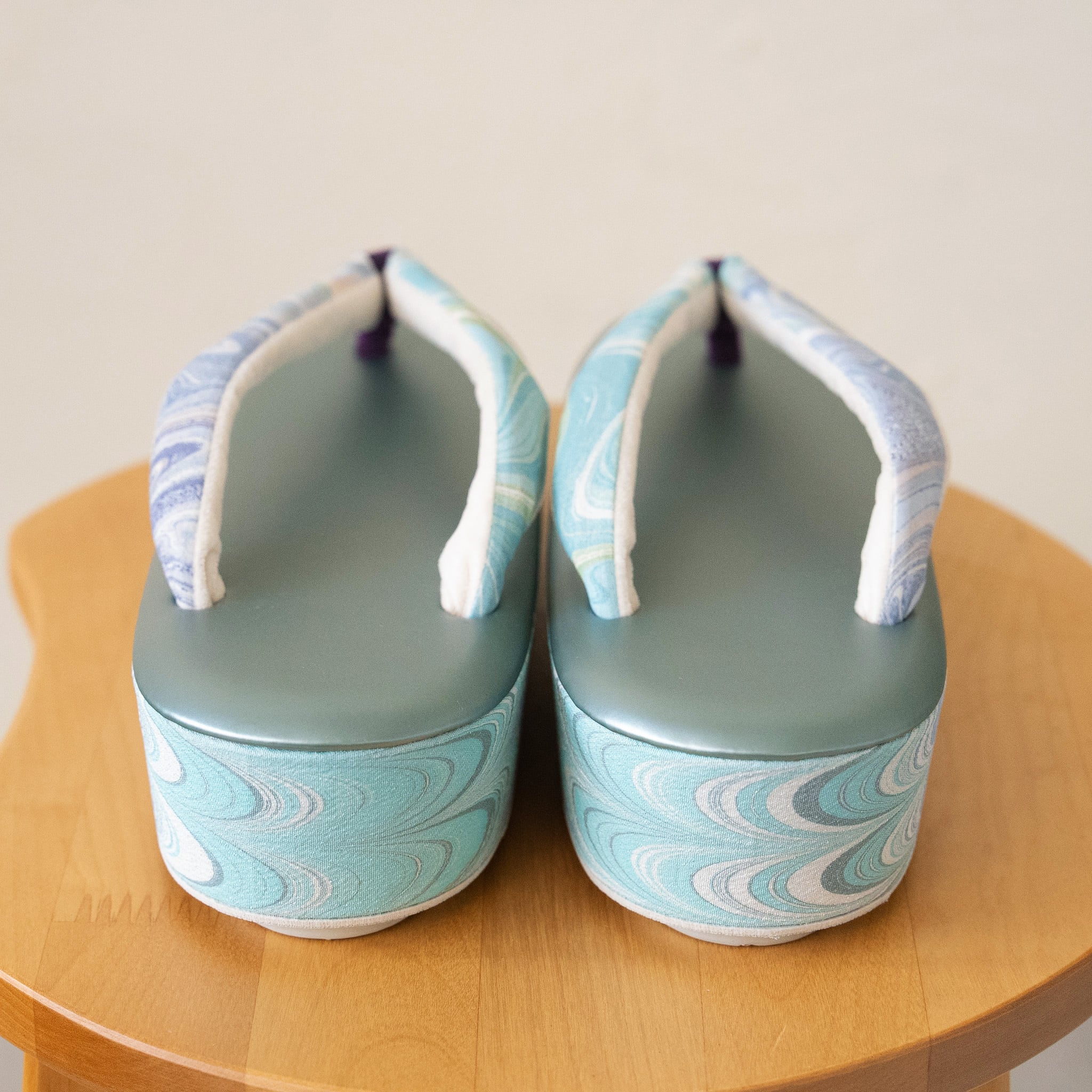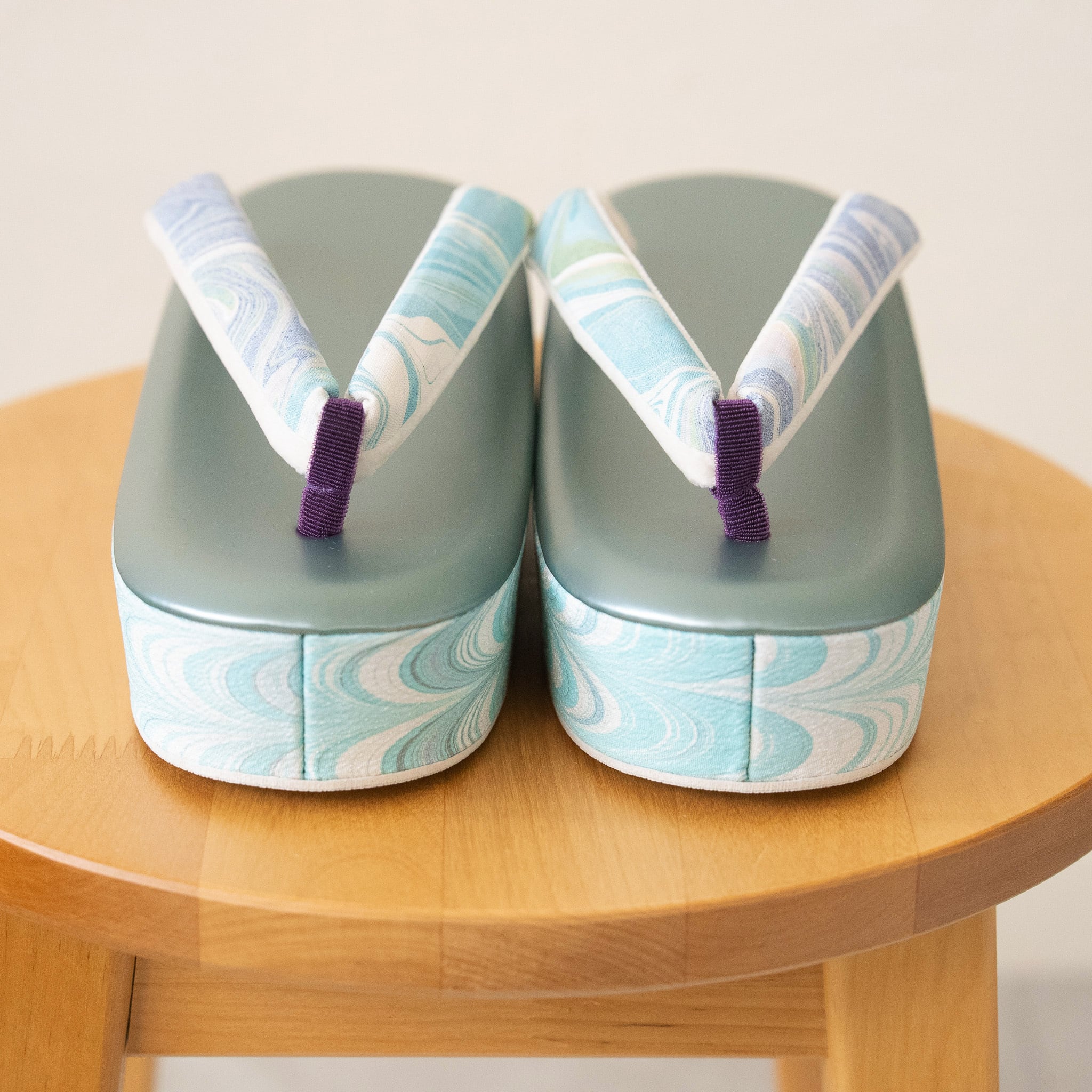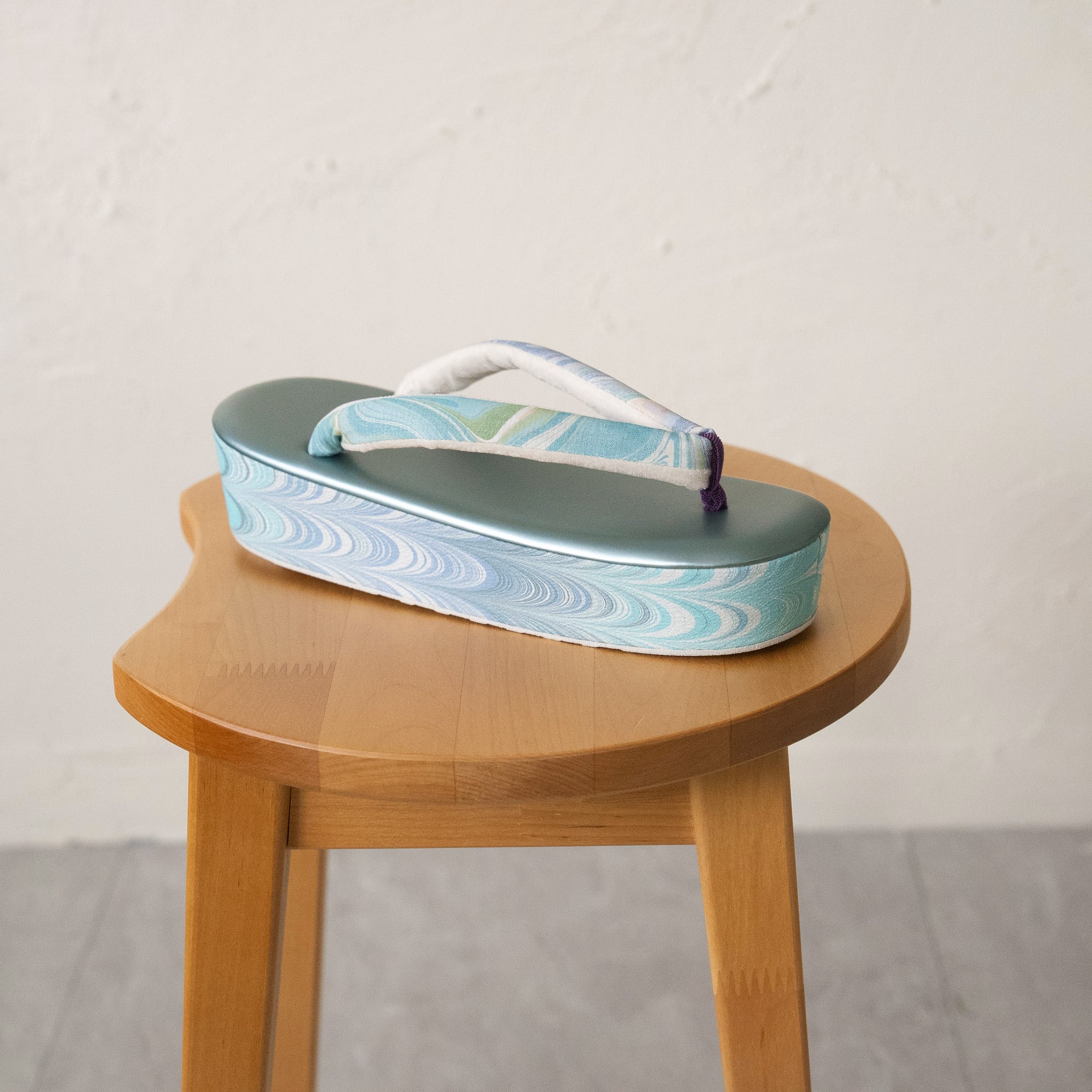 墨流し技法で一点ずつ手染めされた生地を、鼻緒と側面にあしらった草履です。