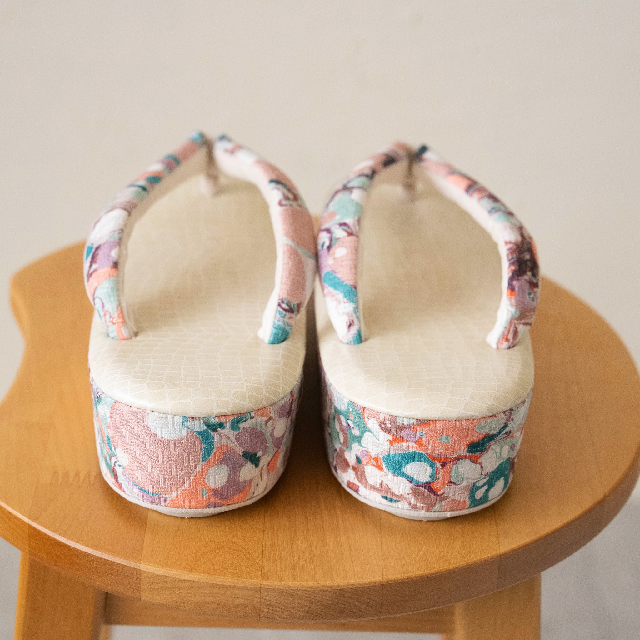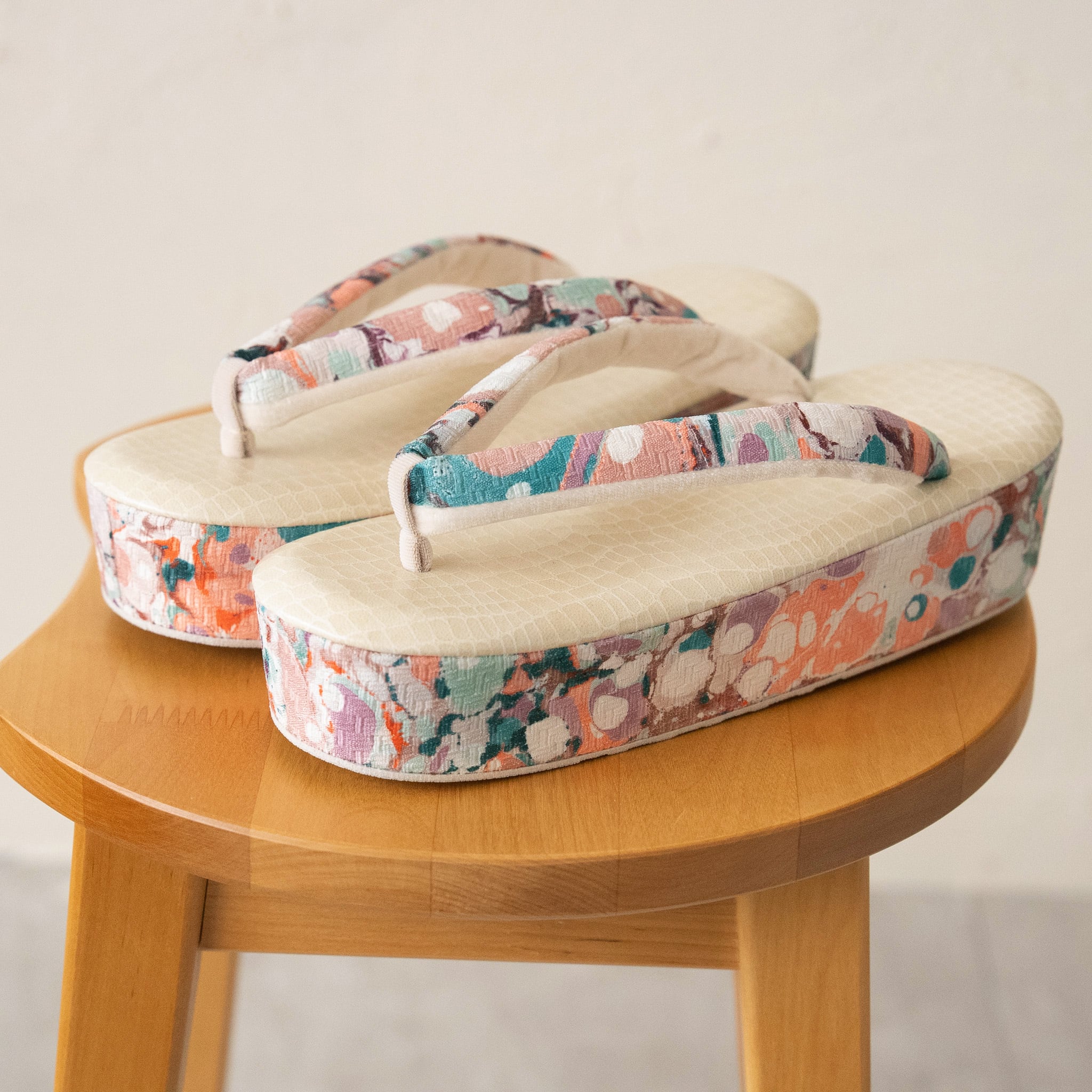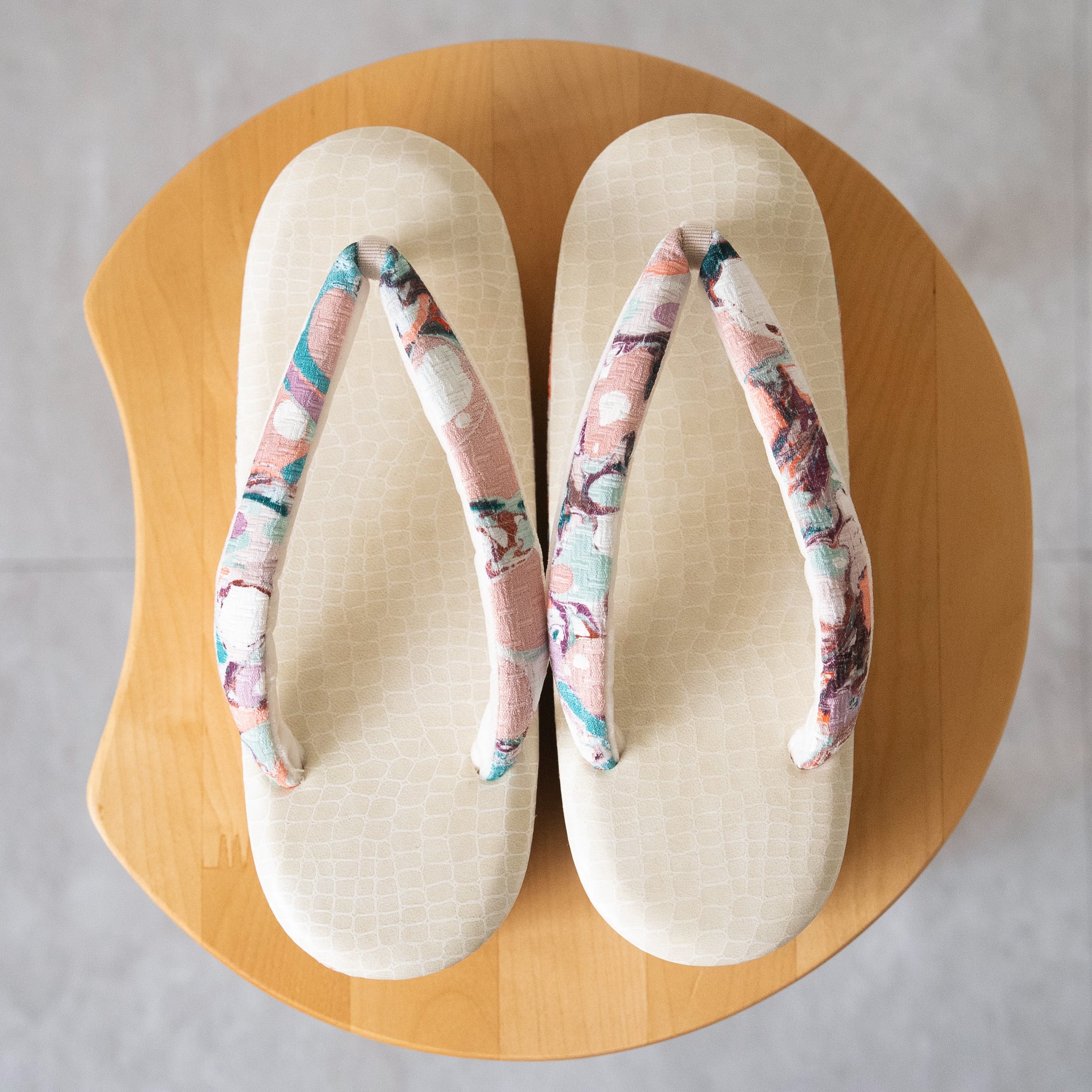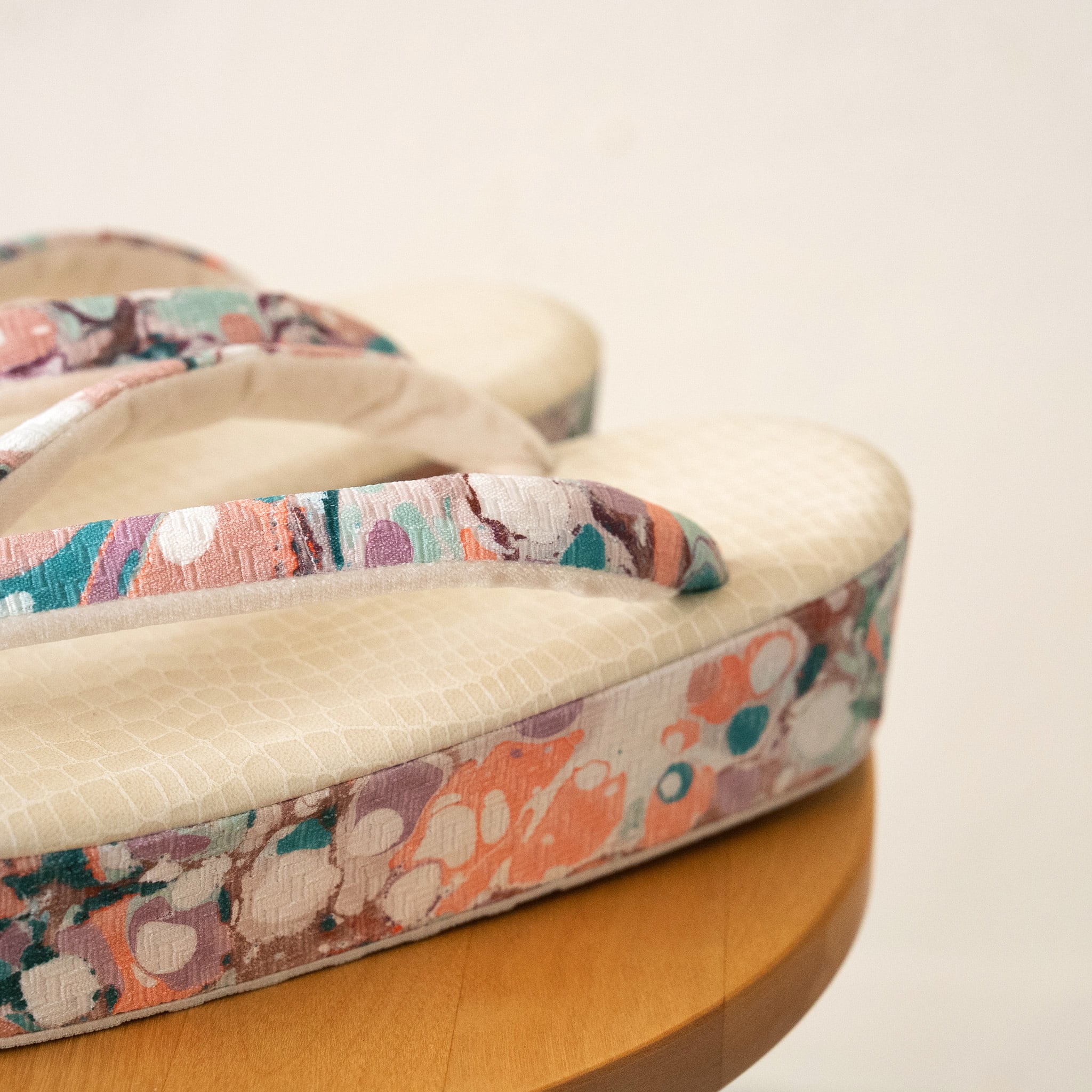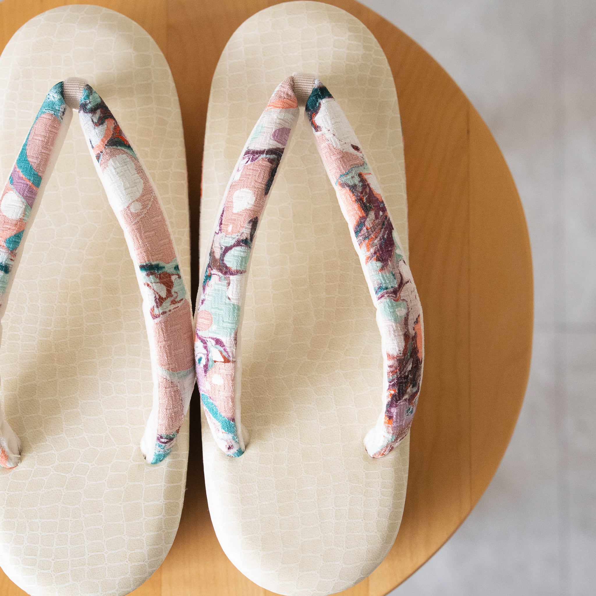 墨流し技法で一点ずつ手染めされた生地を、鼻緒と側面にあしらった草履です。