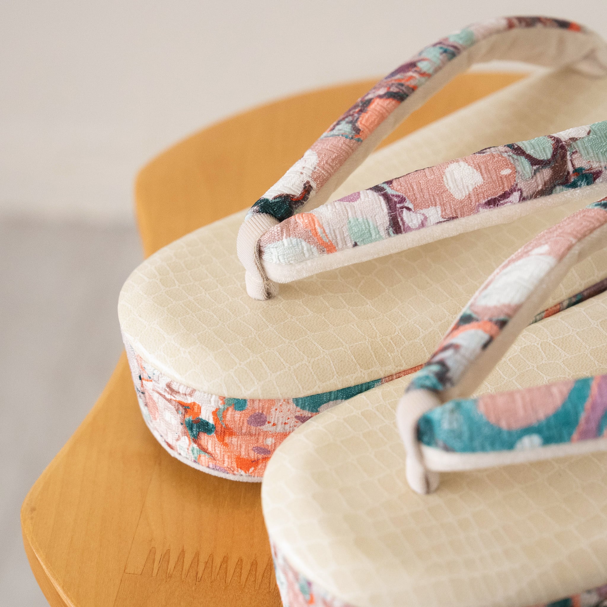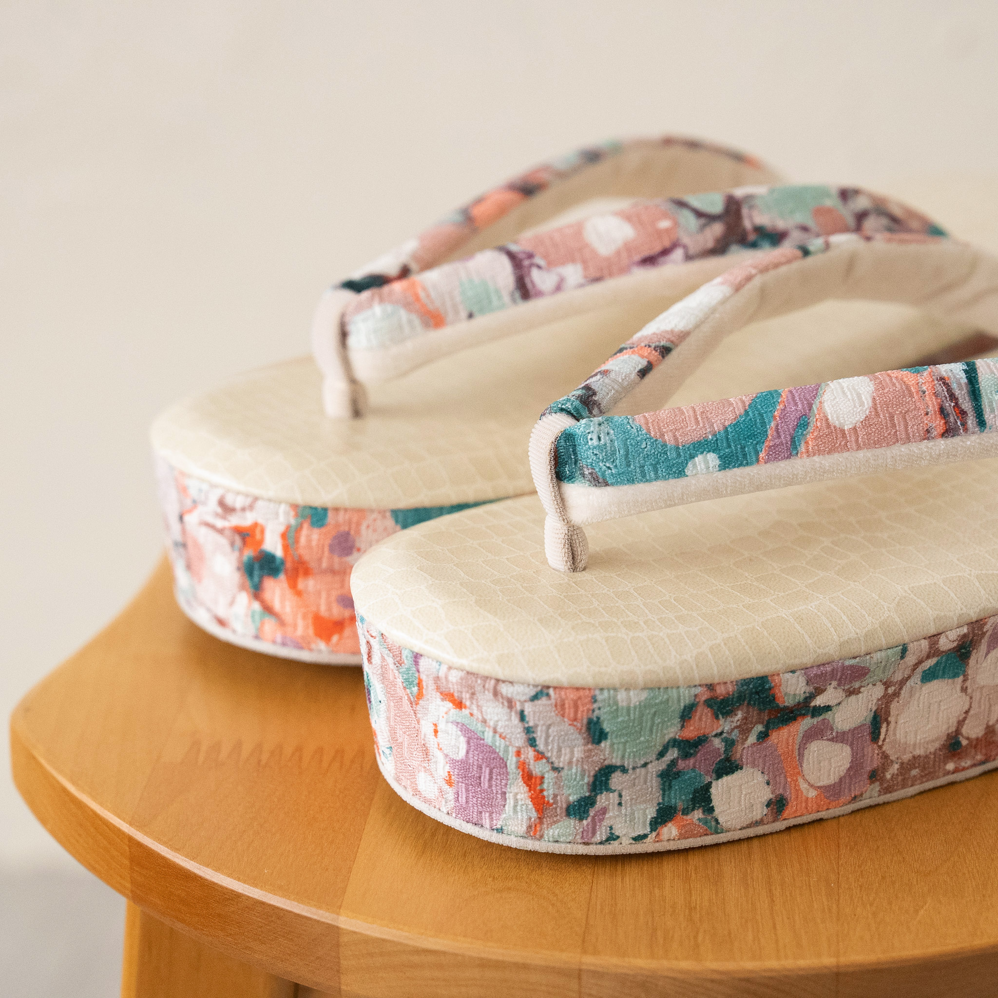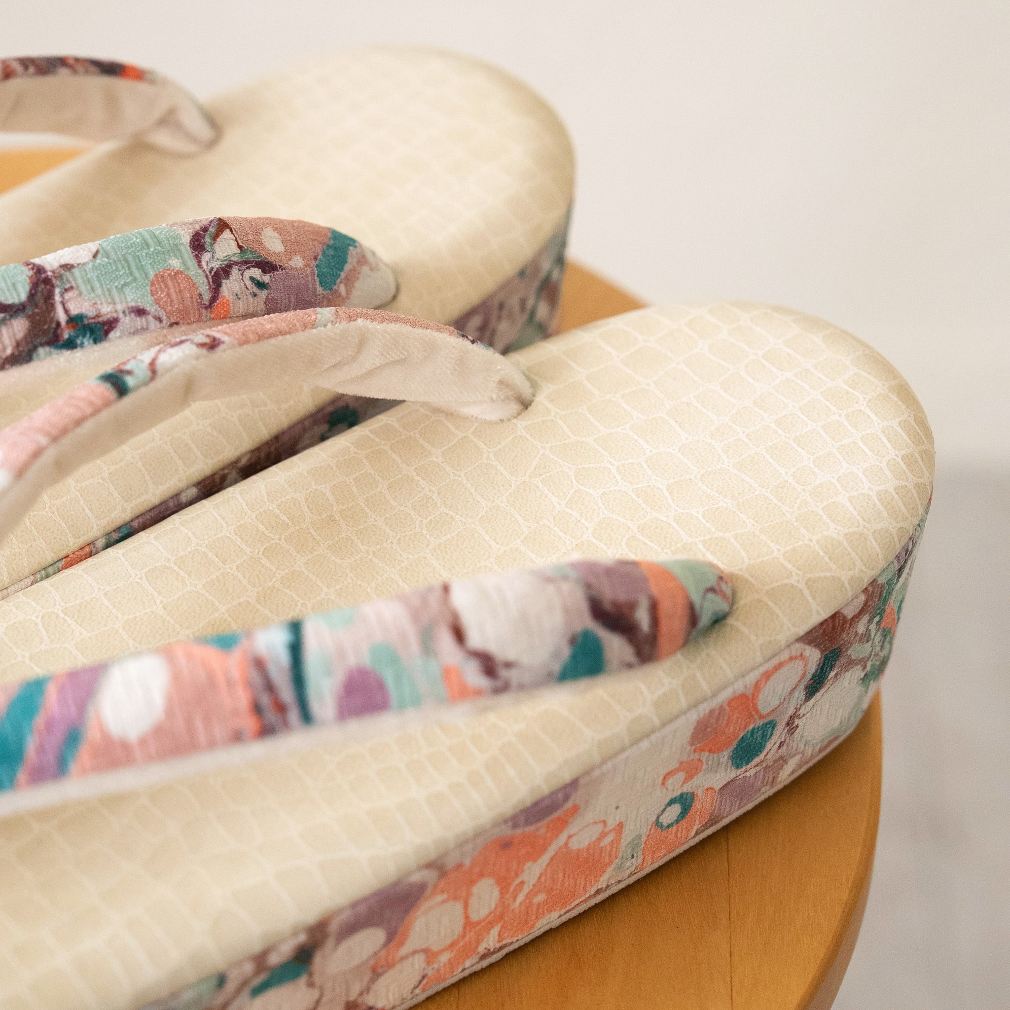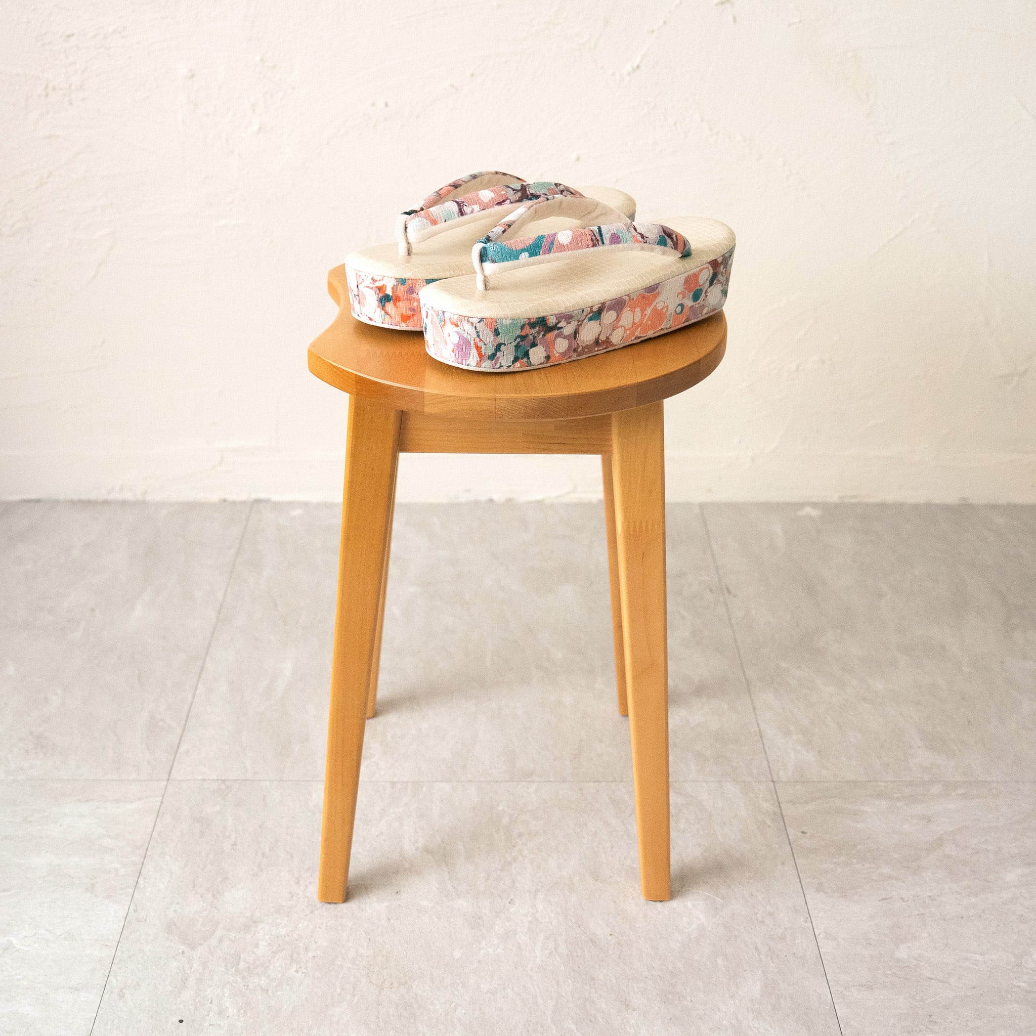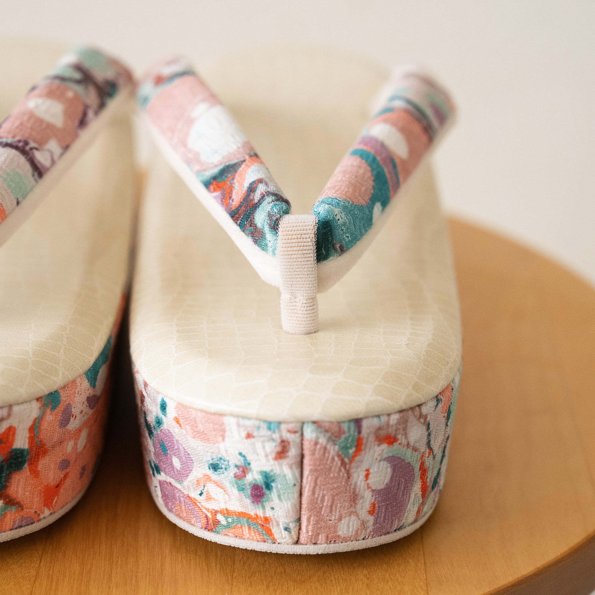 墨流し技法で一点ずつ手染めされた生地を、鼻緒と側面にあしらった草履です。