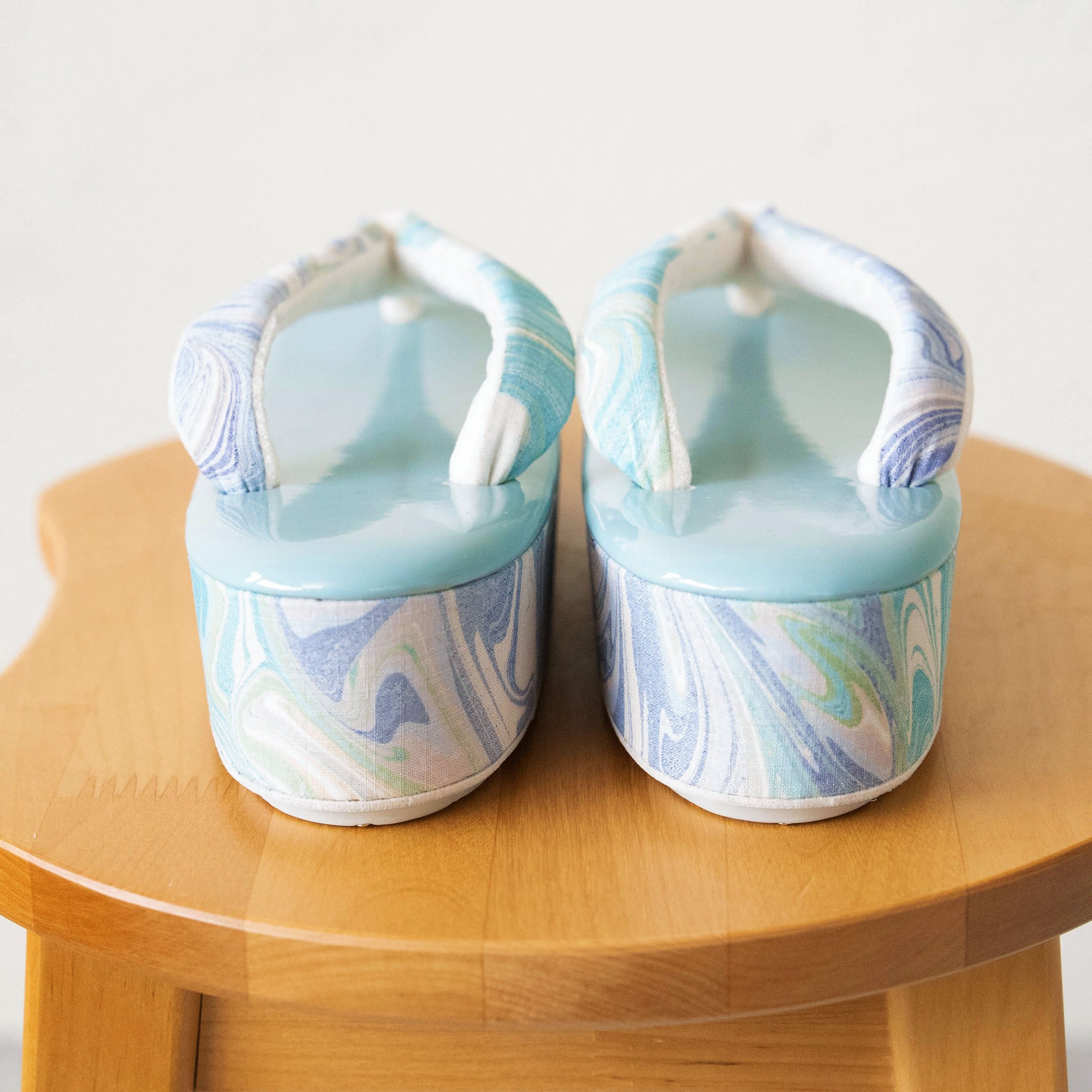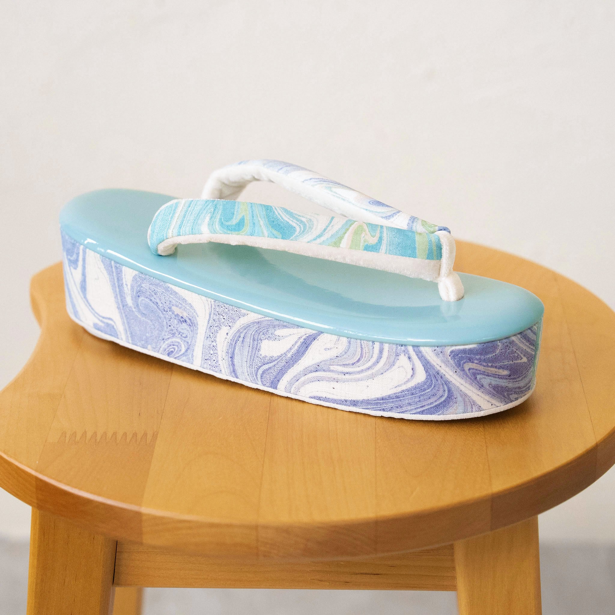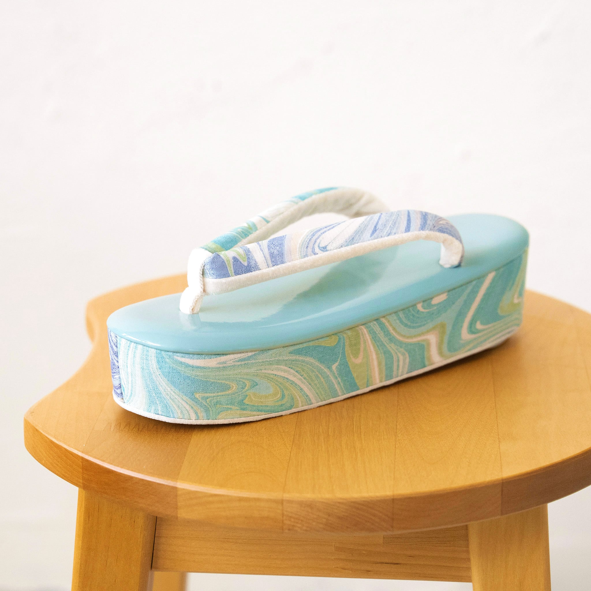 墨流し技法で一点ずつ手染めされた生地を、鼻緒と側面にあしらった草履です。