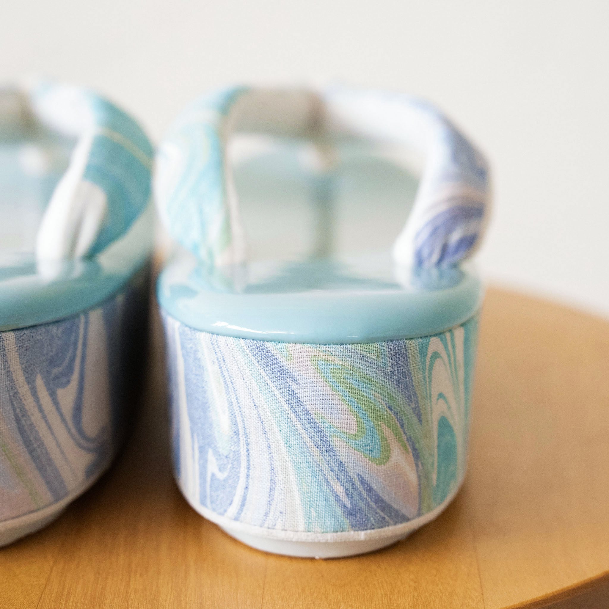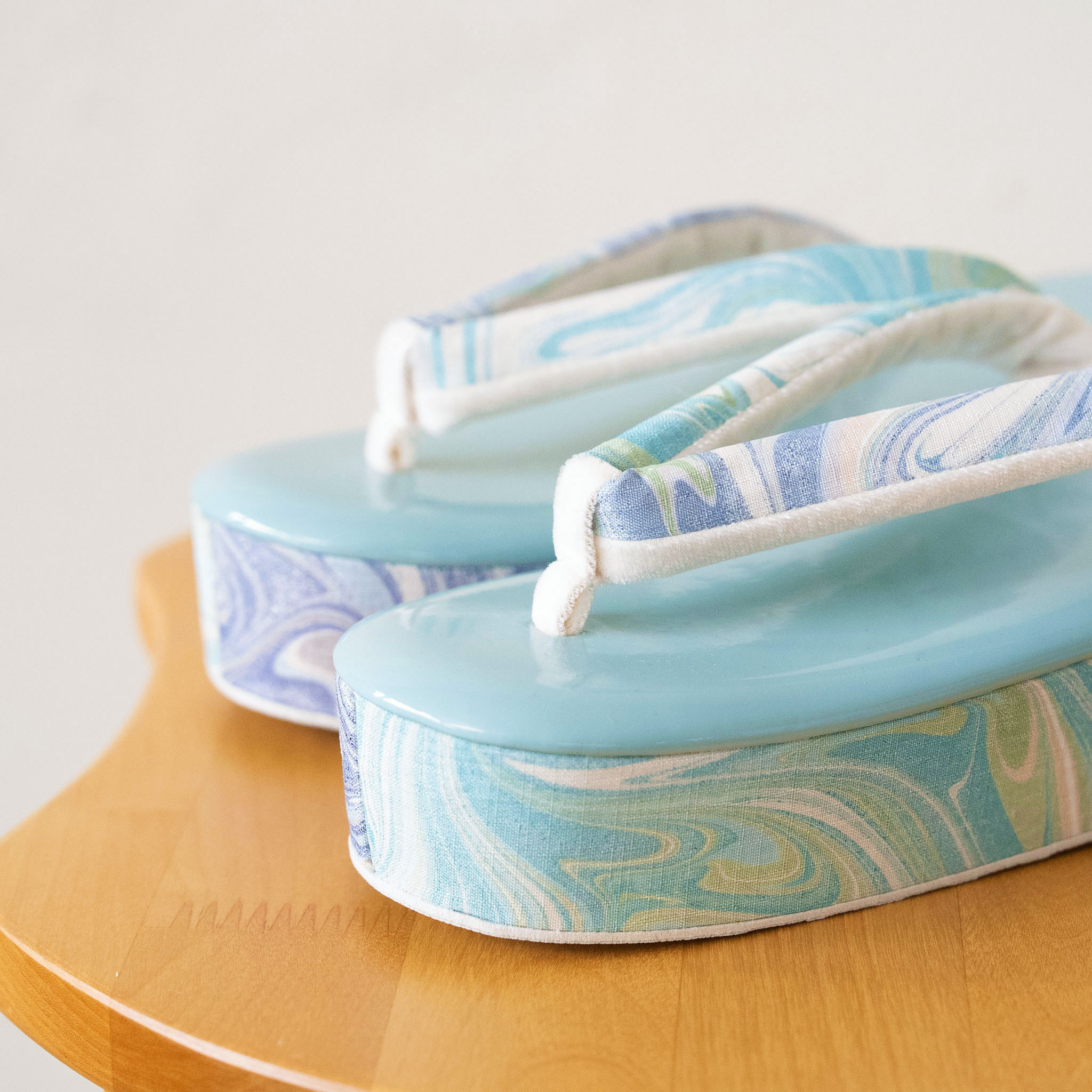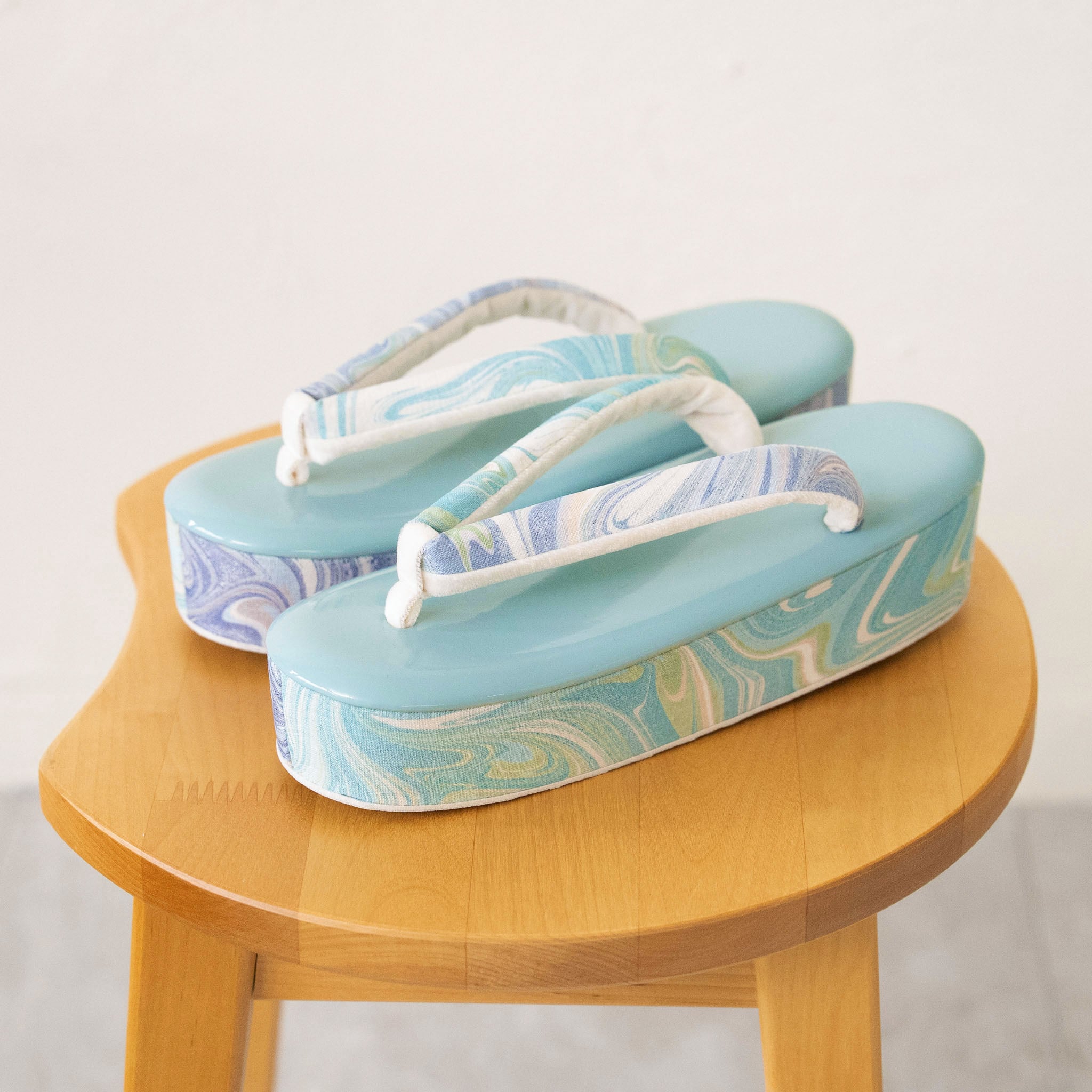 墨流し技法で一点ずつ手染めされた生地を、鼻緒と側面にあしらった草履です。