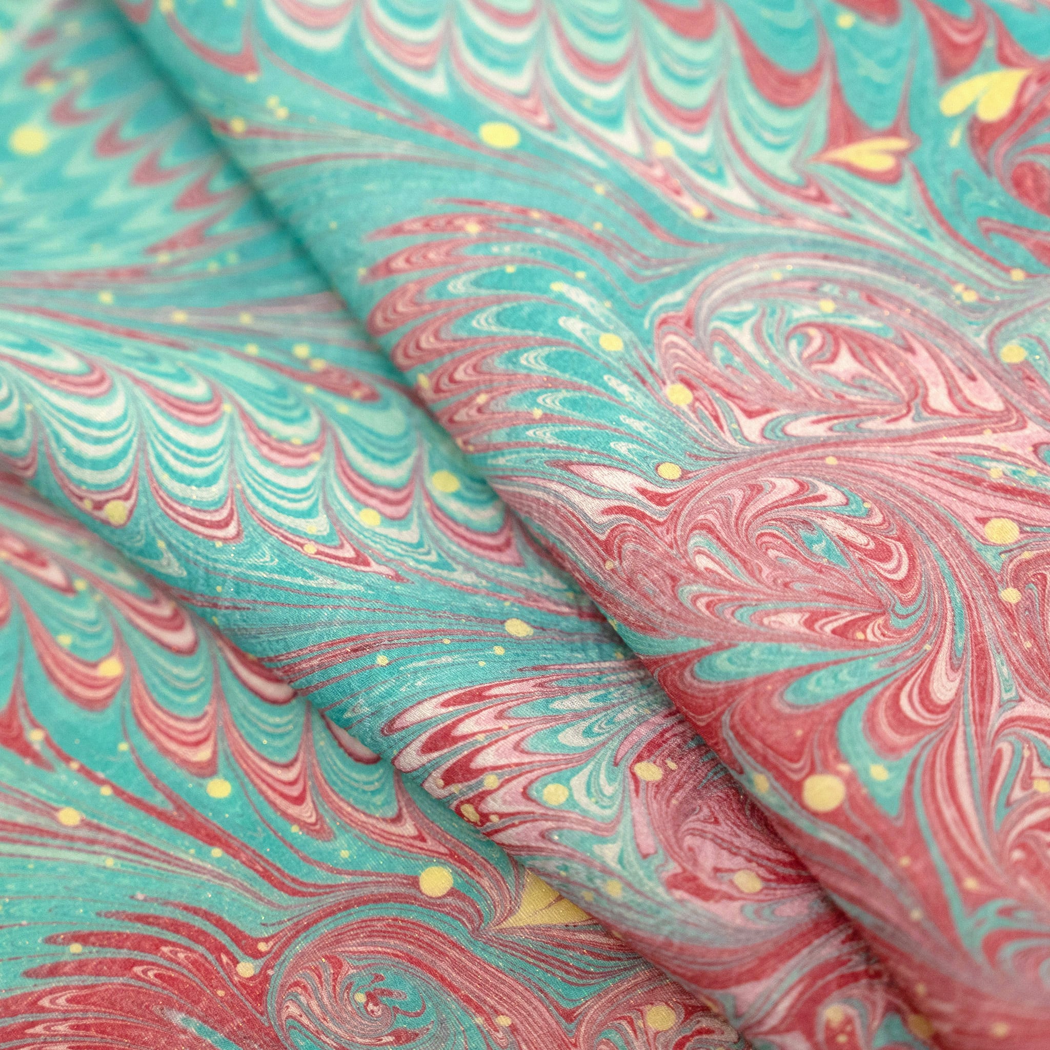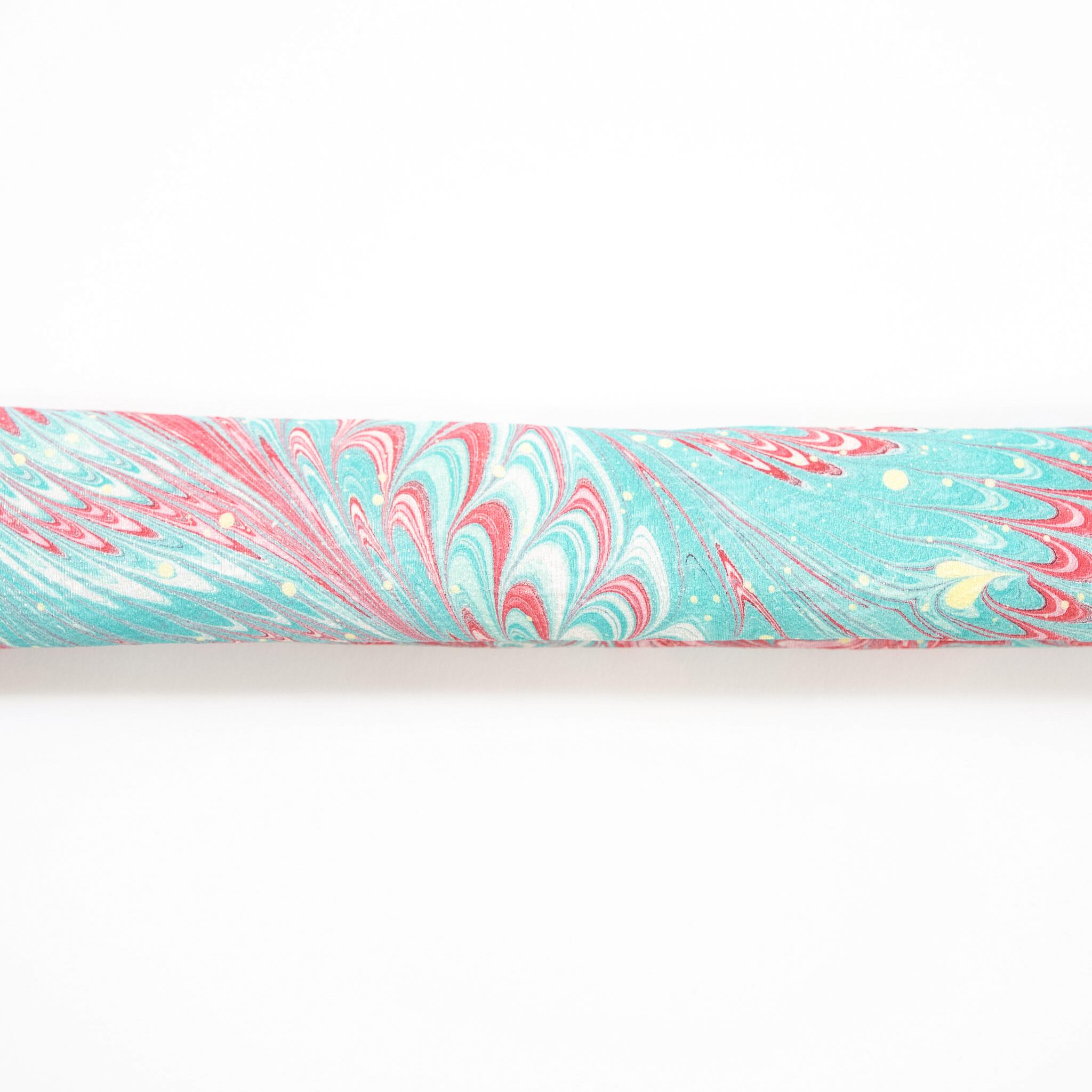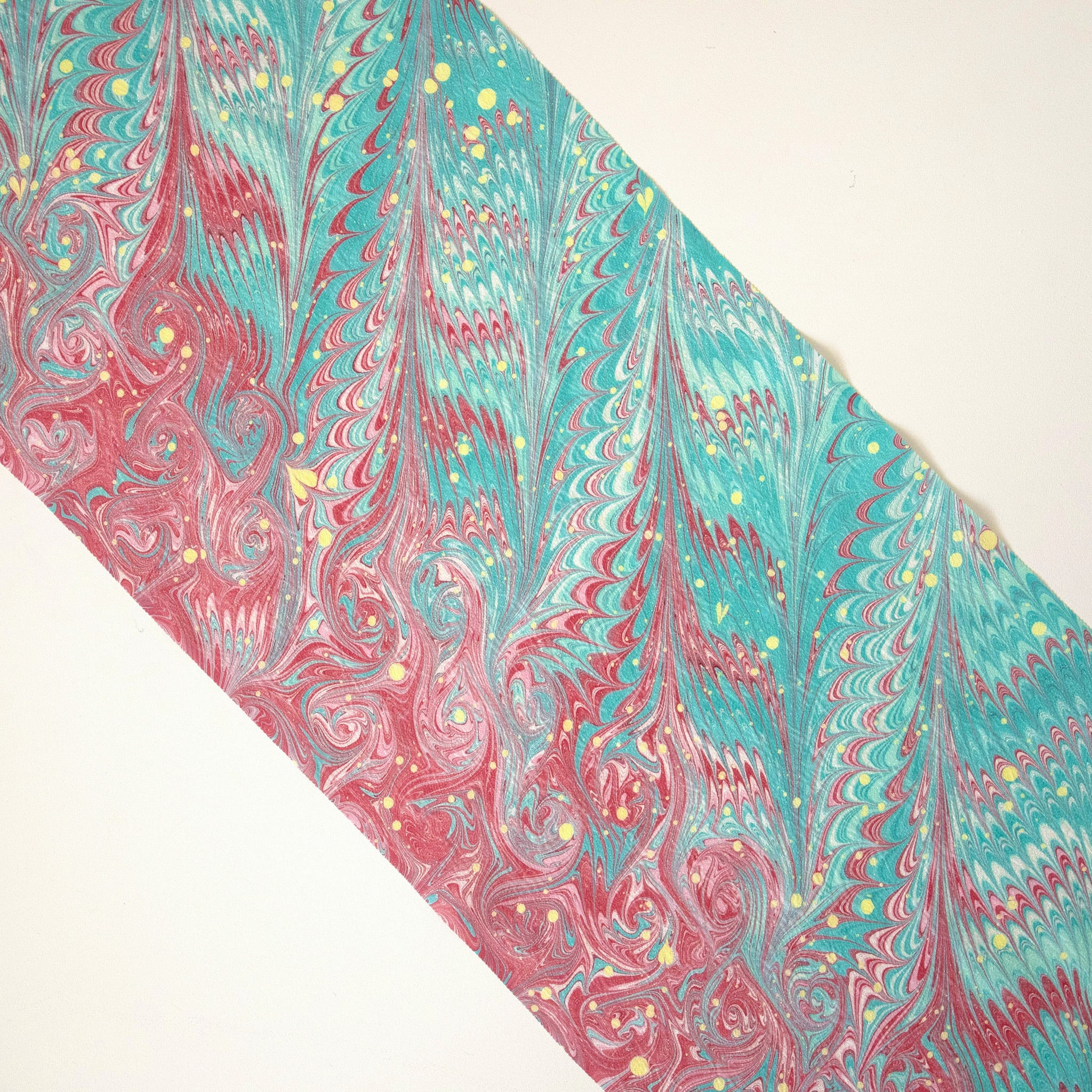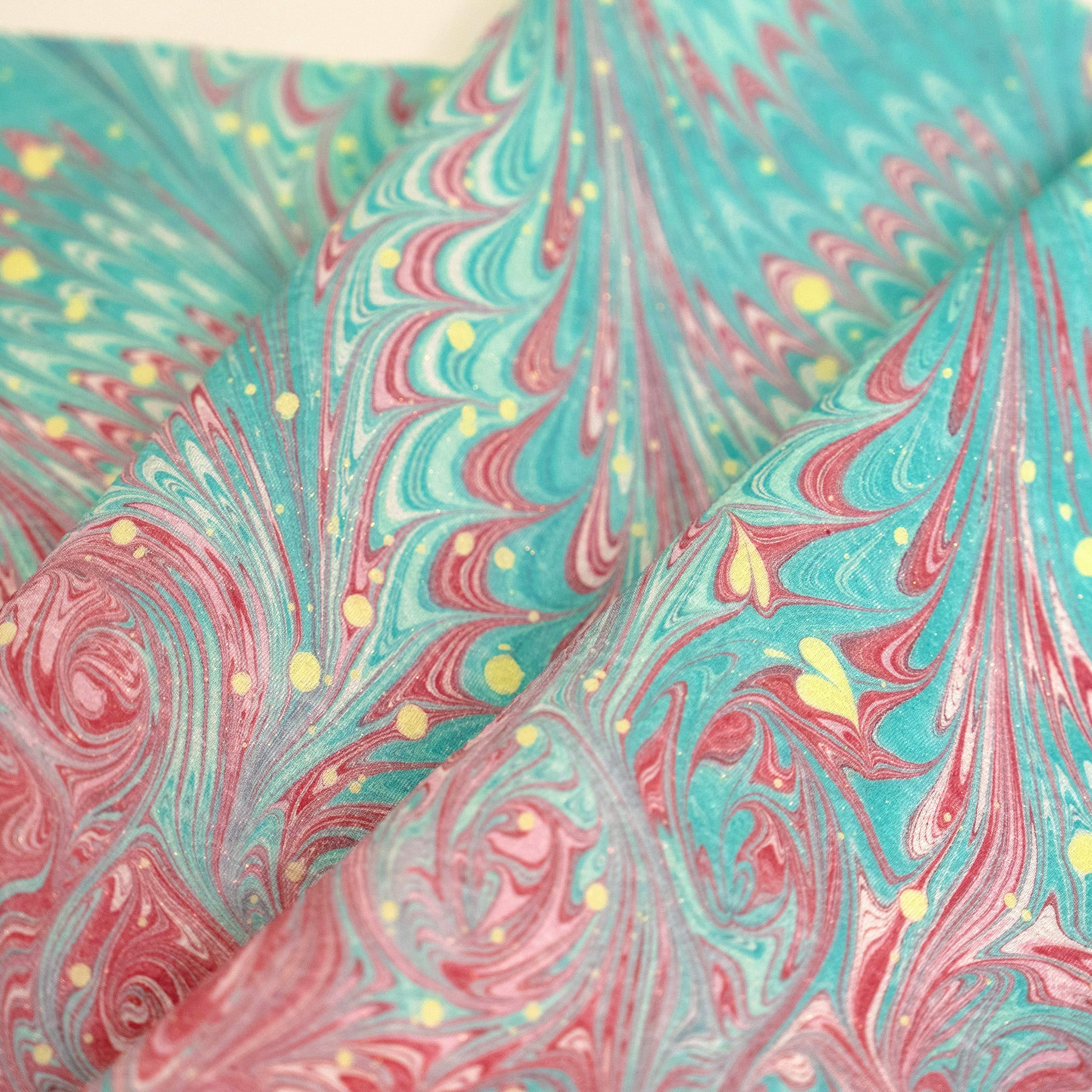 ・本作品は、手染めのため同じデザインでも、ドットの出方やハートの位置や個数などが一点ごとにわずかに異なります。水面の揺らぎをそのまま写し取る墨流しならではの自然な個体差であり、