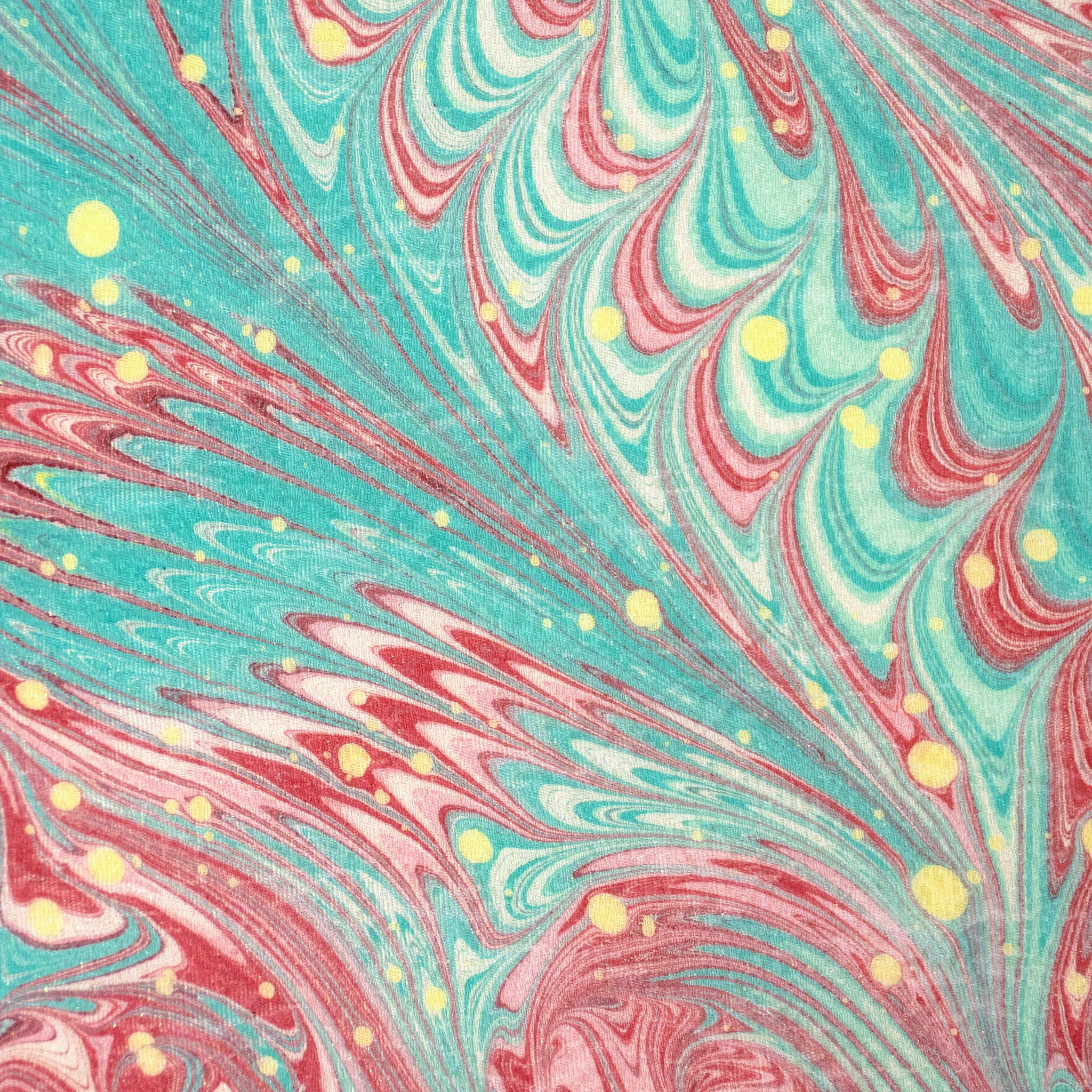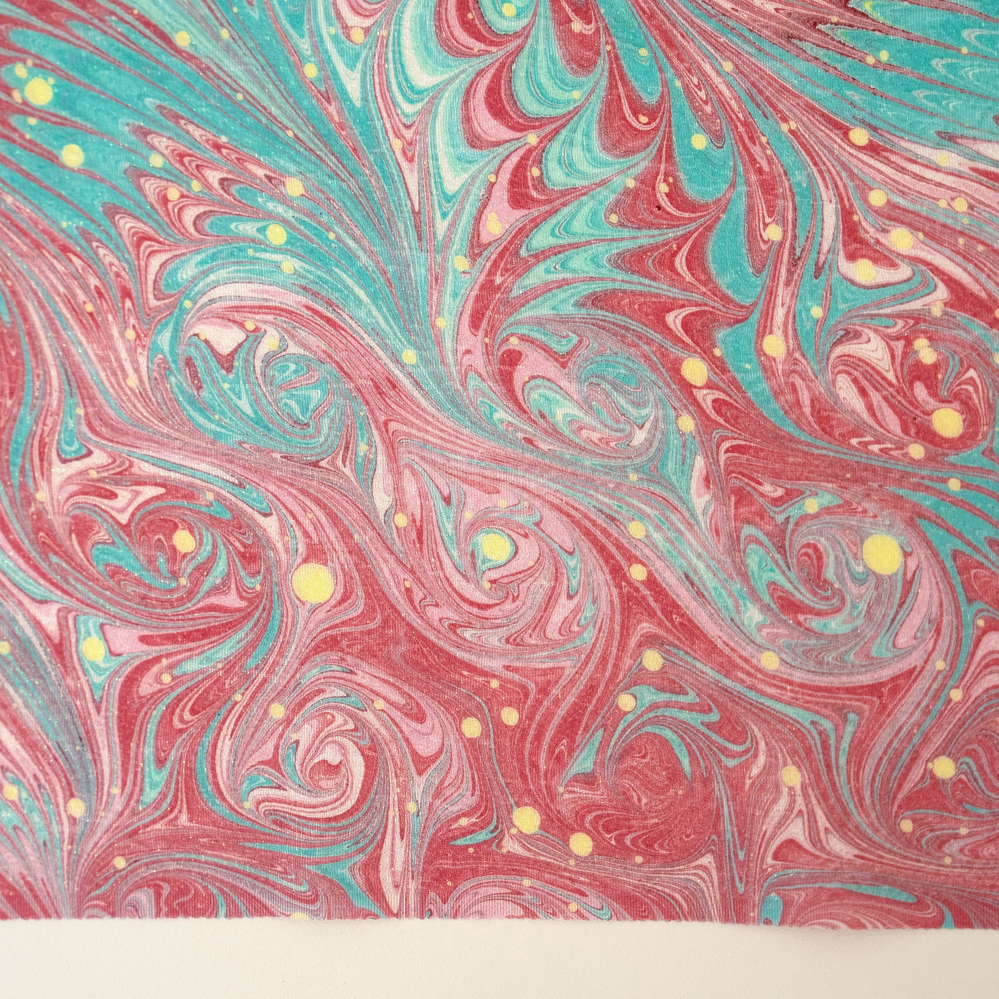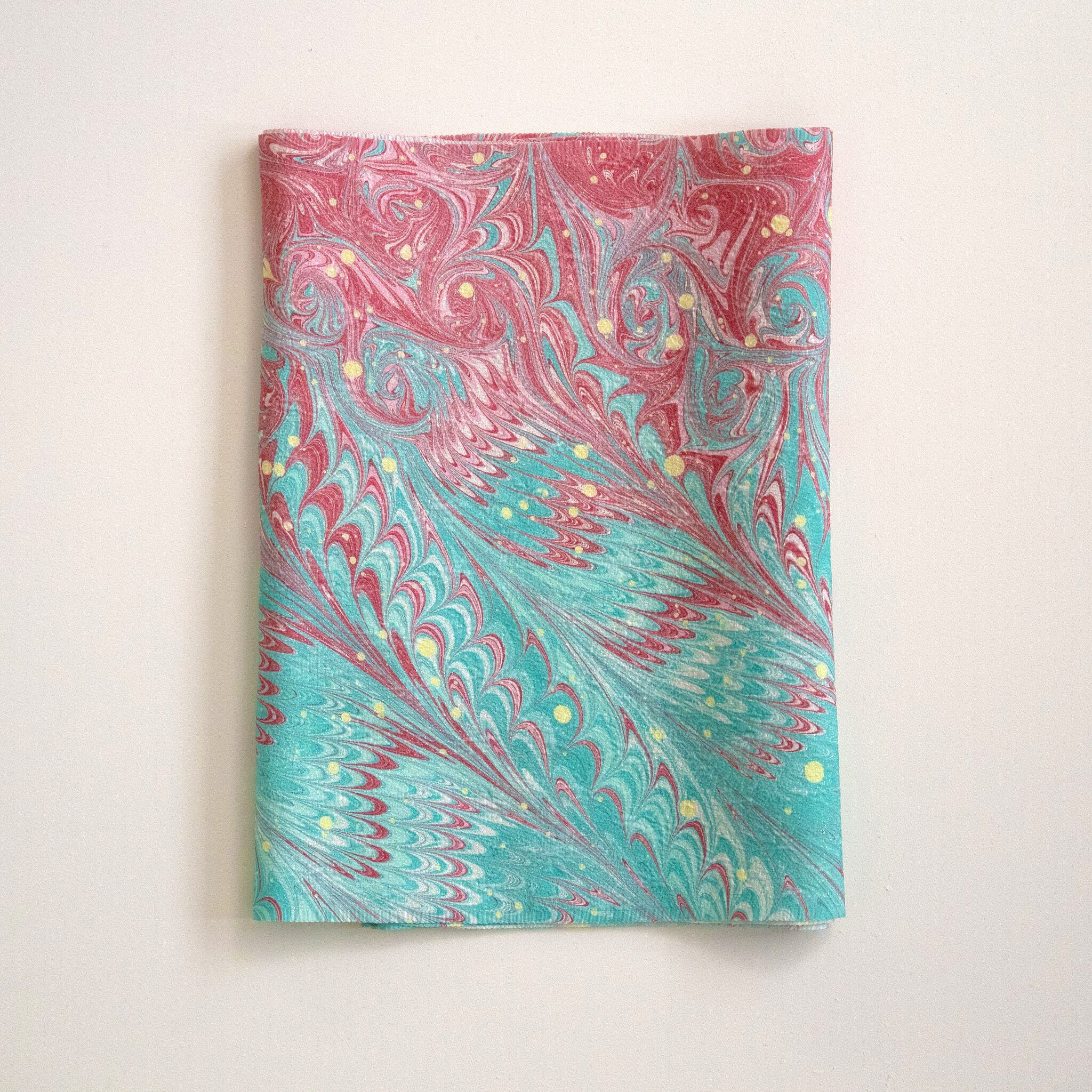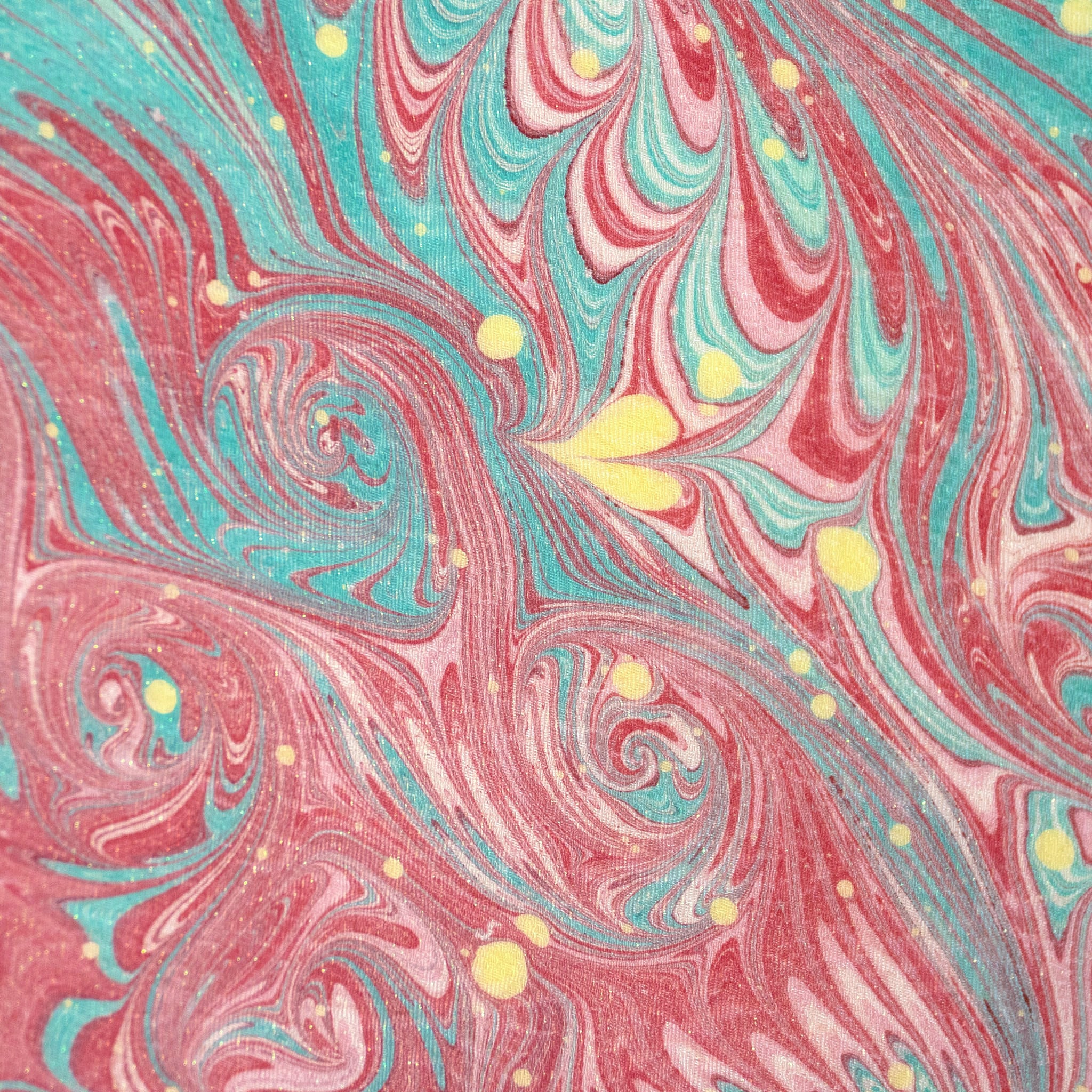 ・本作品は、手染めのため同じデザインでも、ドットの出方やハートの位置や個数などが一点ごとにわずかに異なります。水面の揺らぎをそのまま写し取る墨流しならではの自然な個体差であり、
