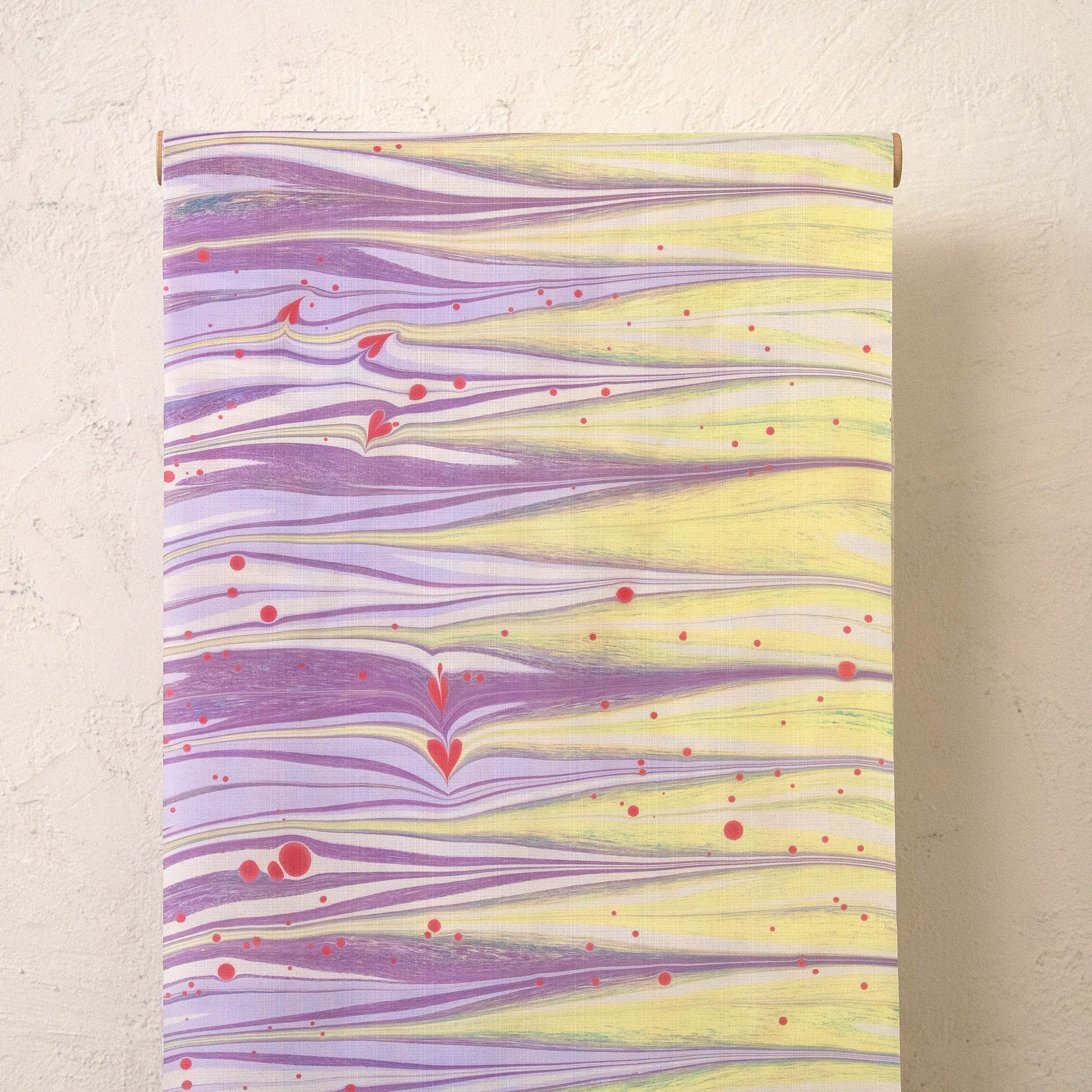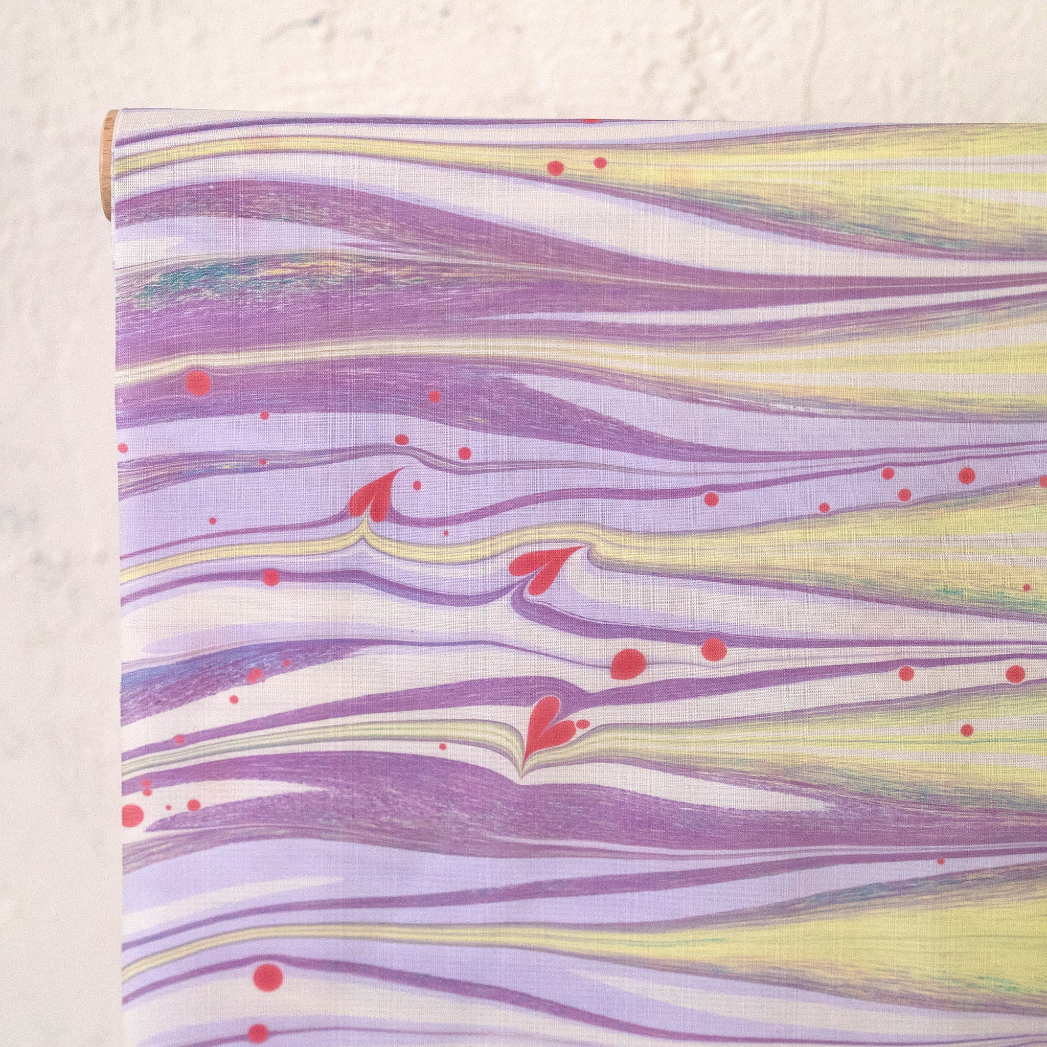 散りばめられたドットと、ひとつひとつ丁寧に描かれたハートが、作品全体に愛らしい表情を添えています。