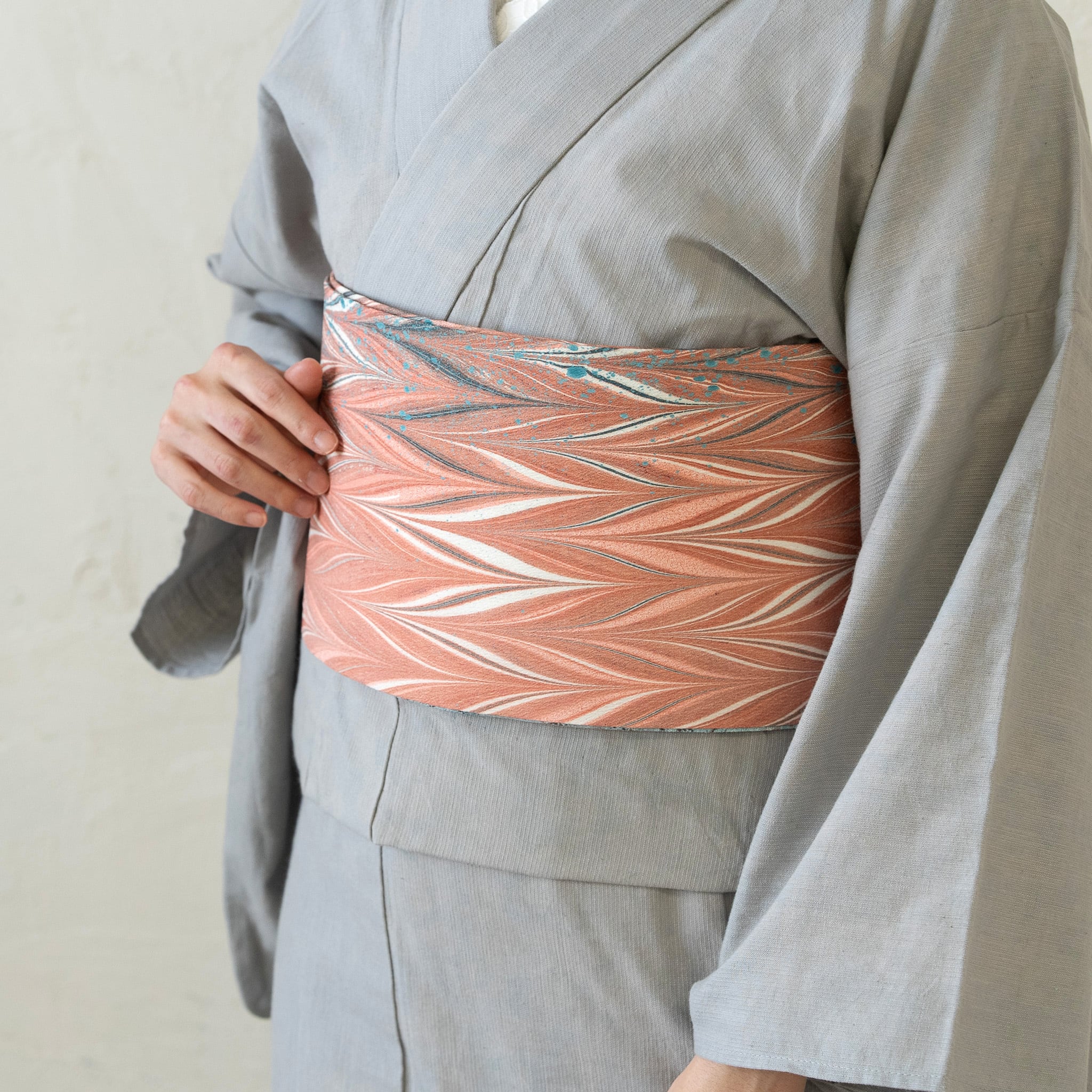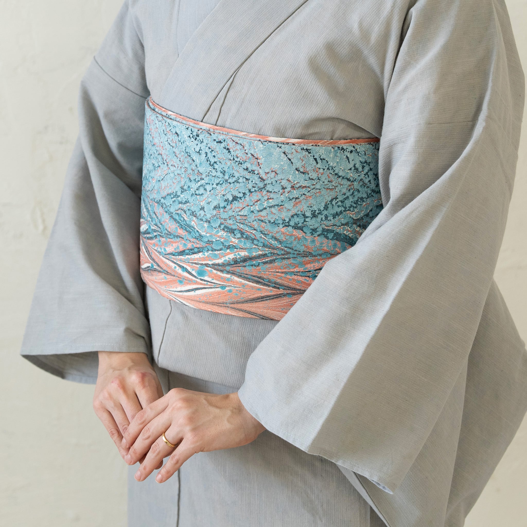 染色家恭平が墨流し技法で染め上げた、リバーシブル仕様の半巾帯です。