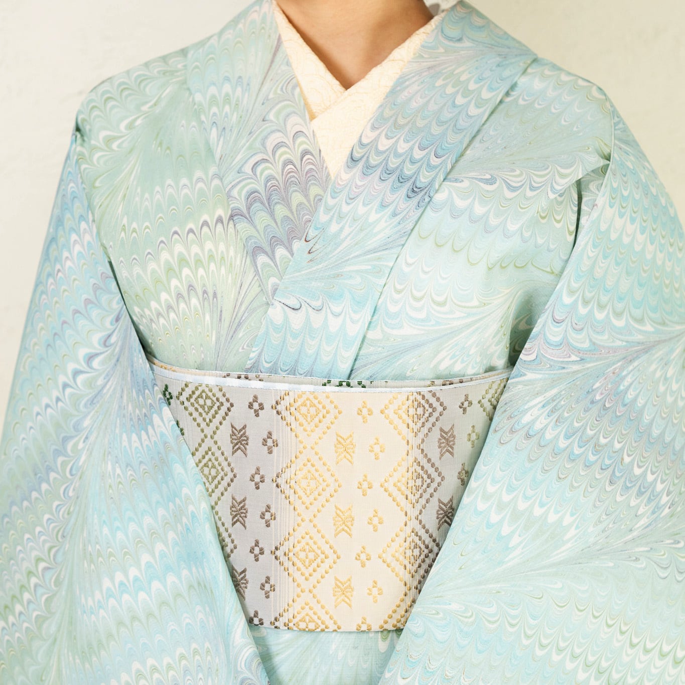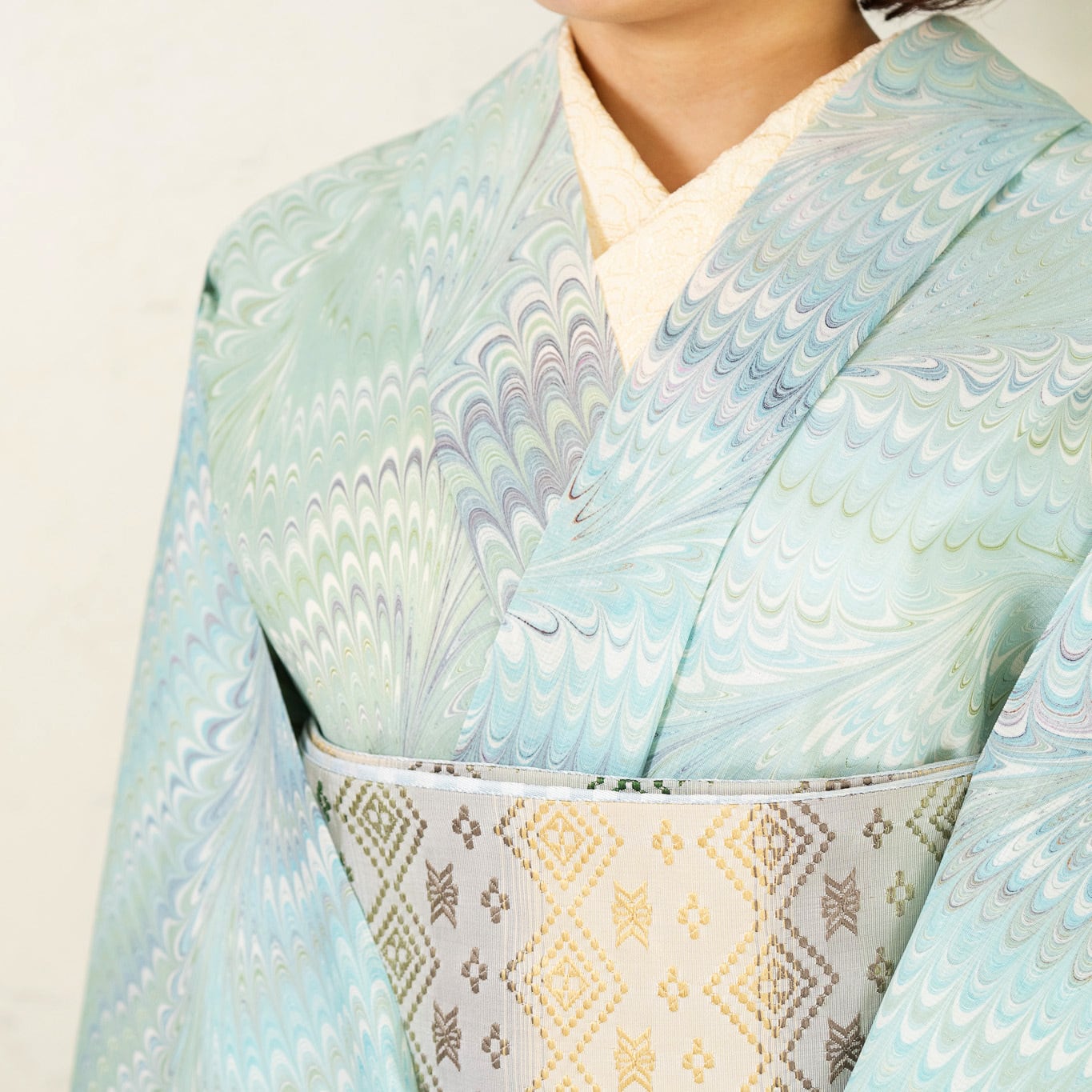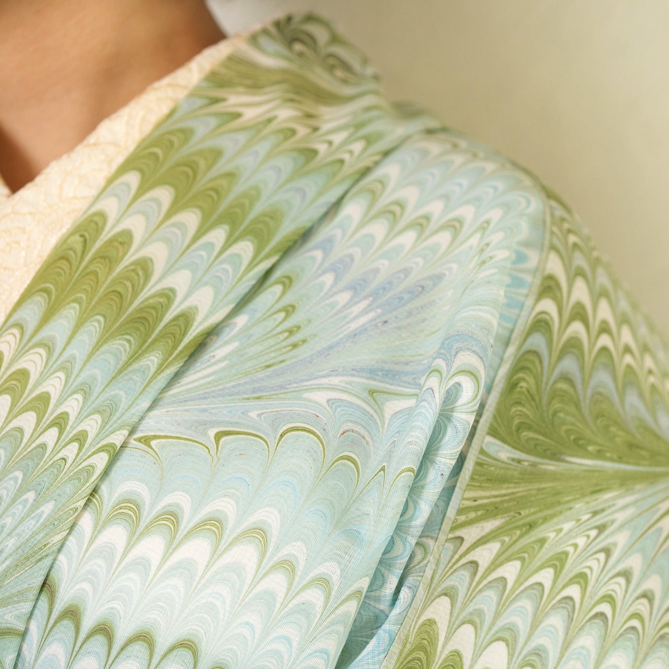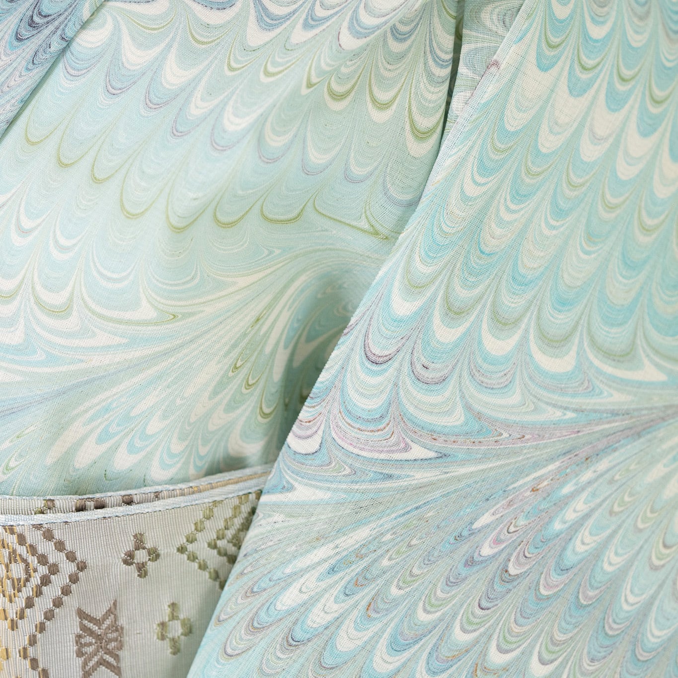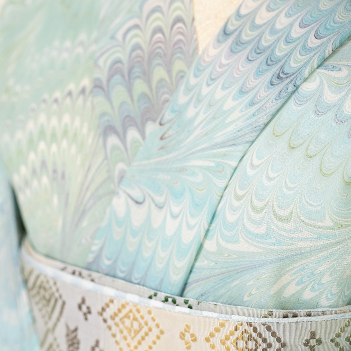 ピーコック崩し柄の繊細な流れが布全体に広がり、細やかな模様の重なりが静かな奥行きを生み出しています。