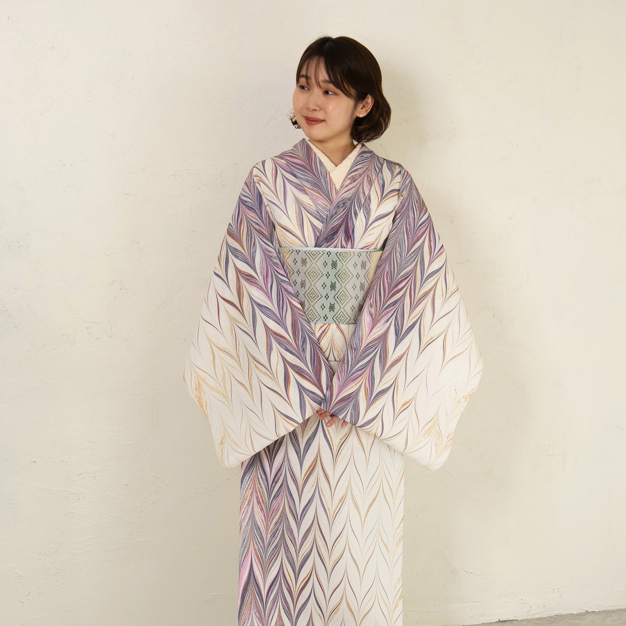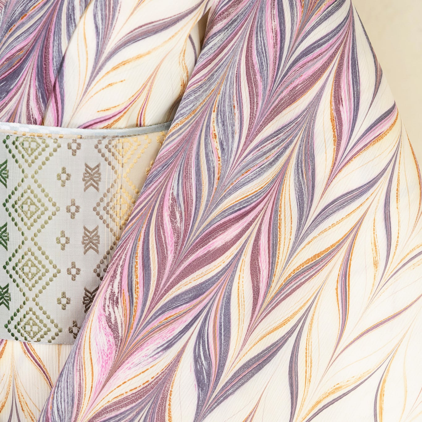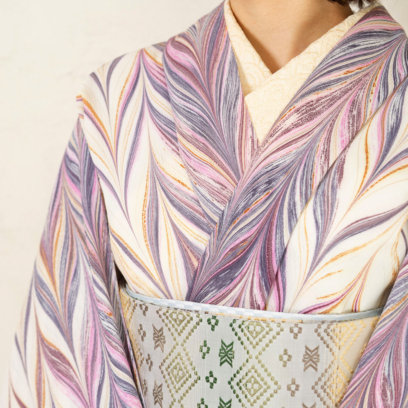 生成りを基調に、紫やボルドーの流れを重ね、紫みを帯びたピンク色のアクセント。