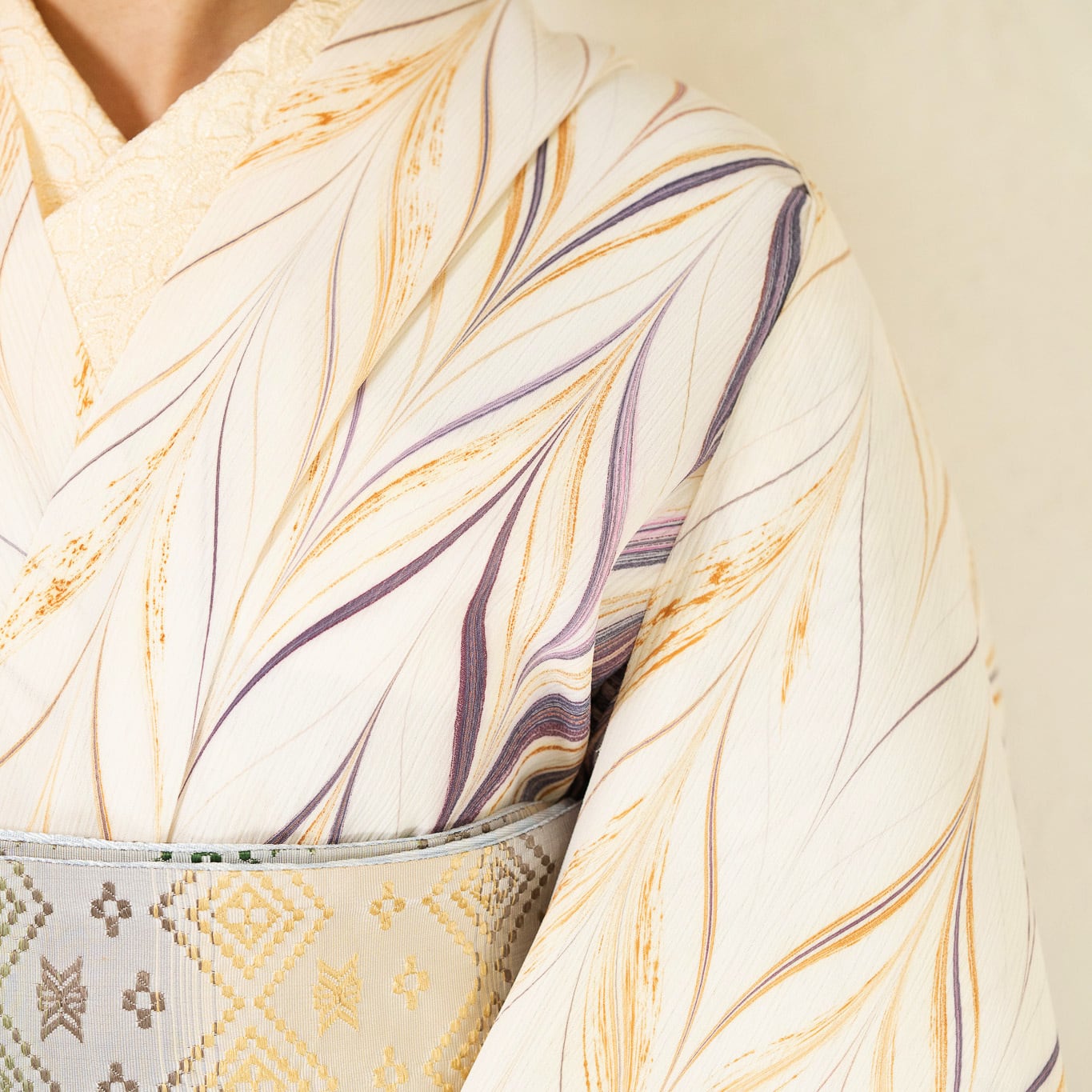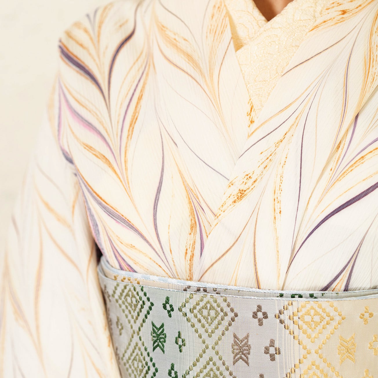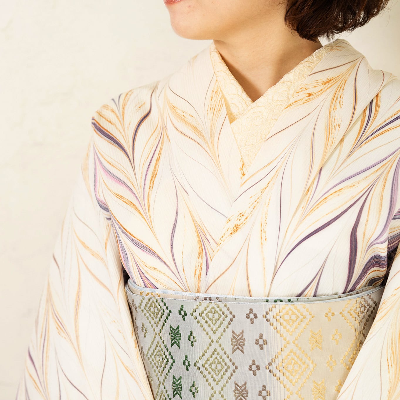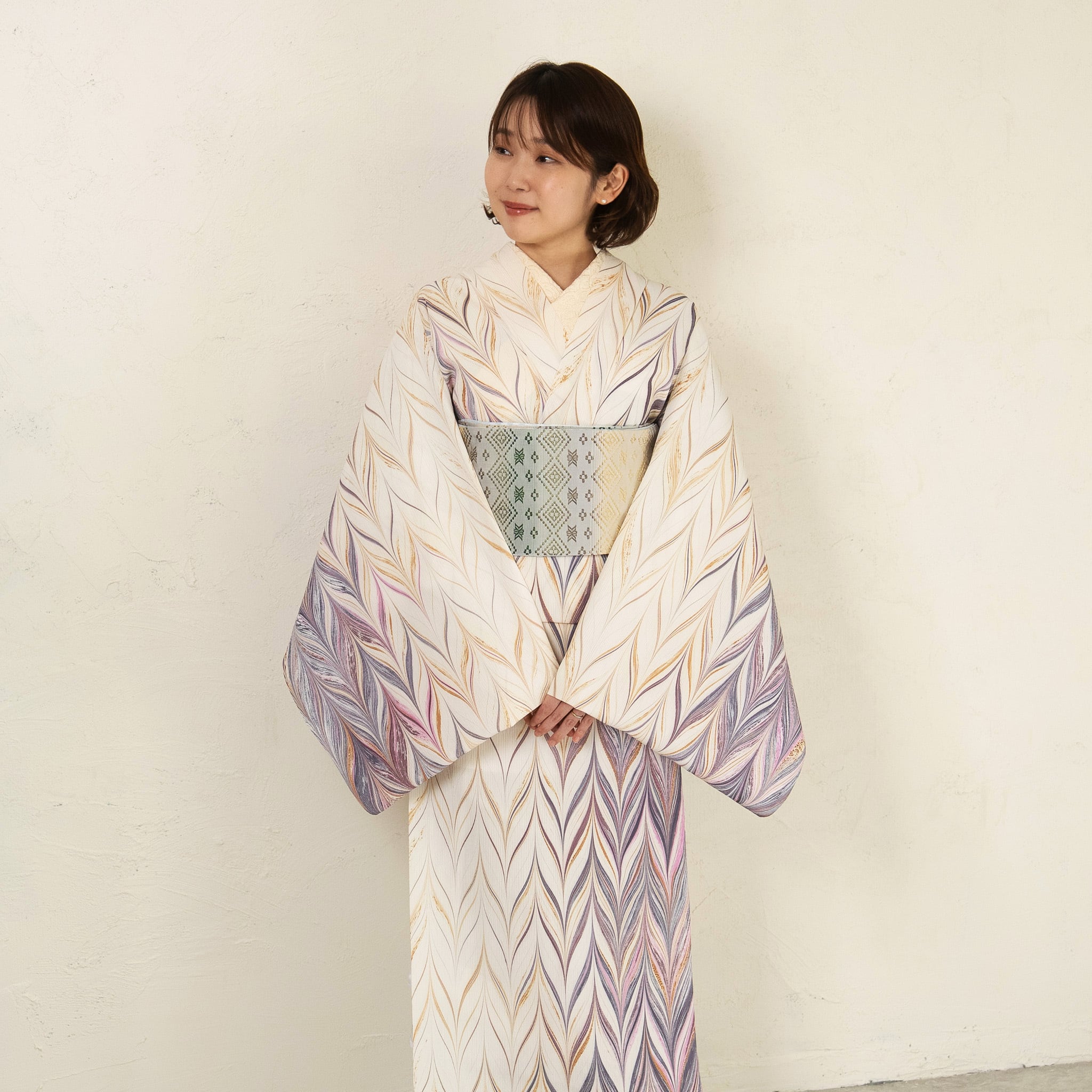 生成りを基調に、紫やボルドーの流れを重ね、紫みを帯びたピンク色のアクセント。