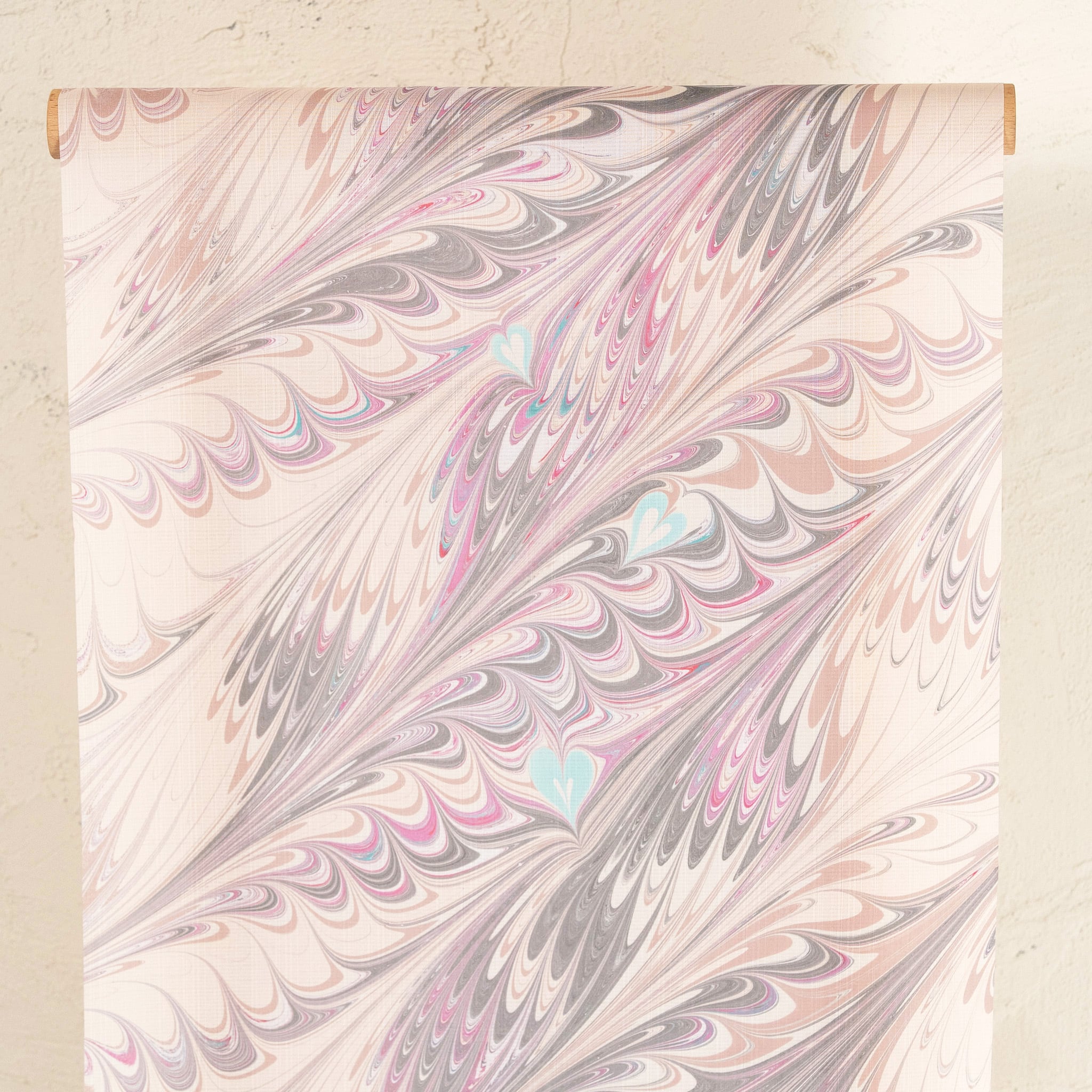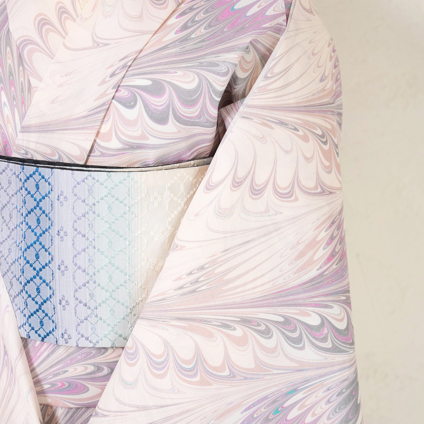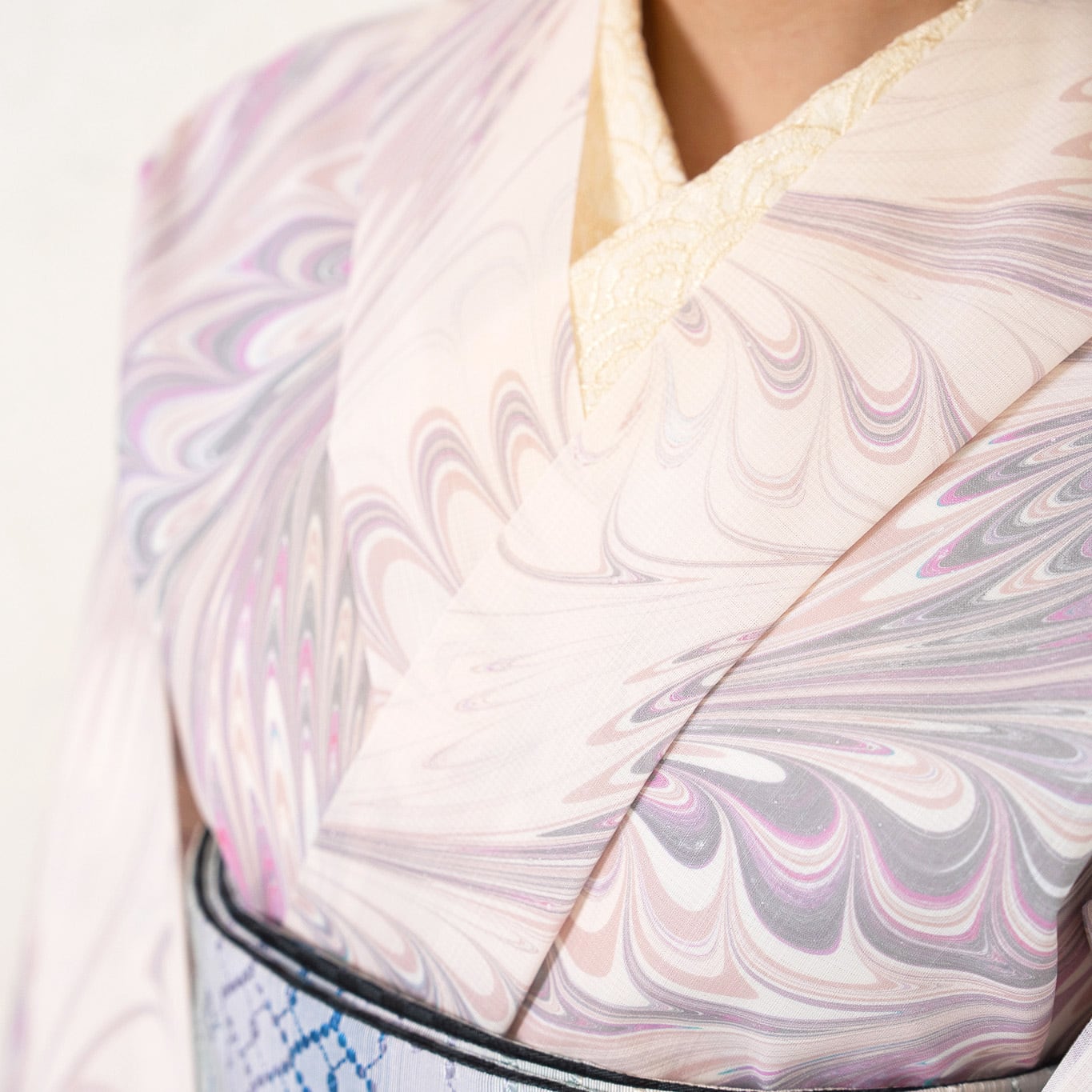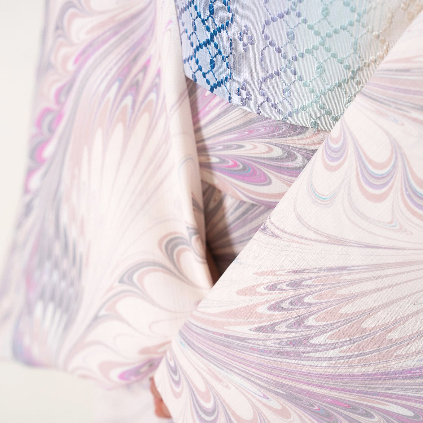細やかなピーコック崩しの模様は、墨流しならではの偶然性と、それを導く高度なコントロールの積み重ねによって生まれたもの。近くで見るほどに、線の密度や色の重なりの豊かさを感じていただけます。