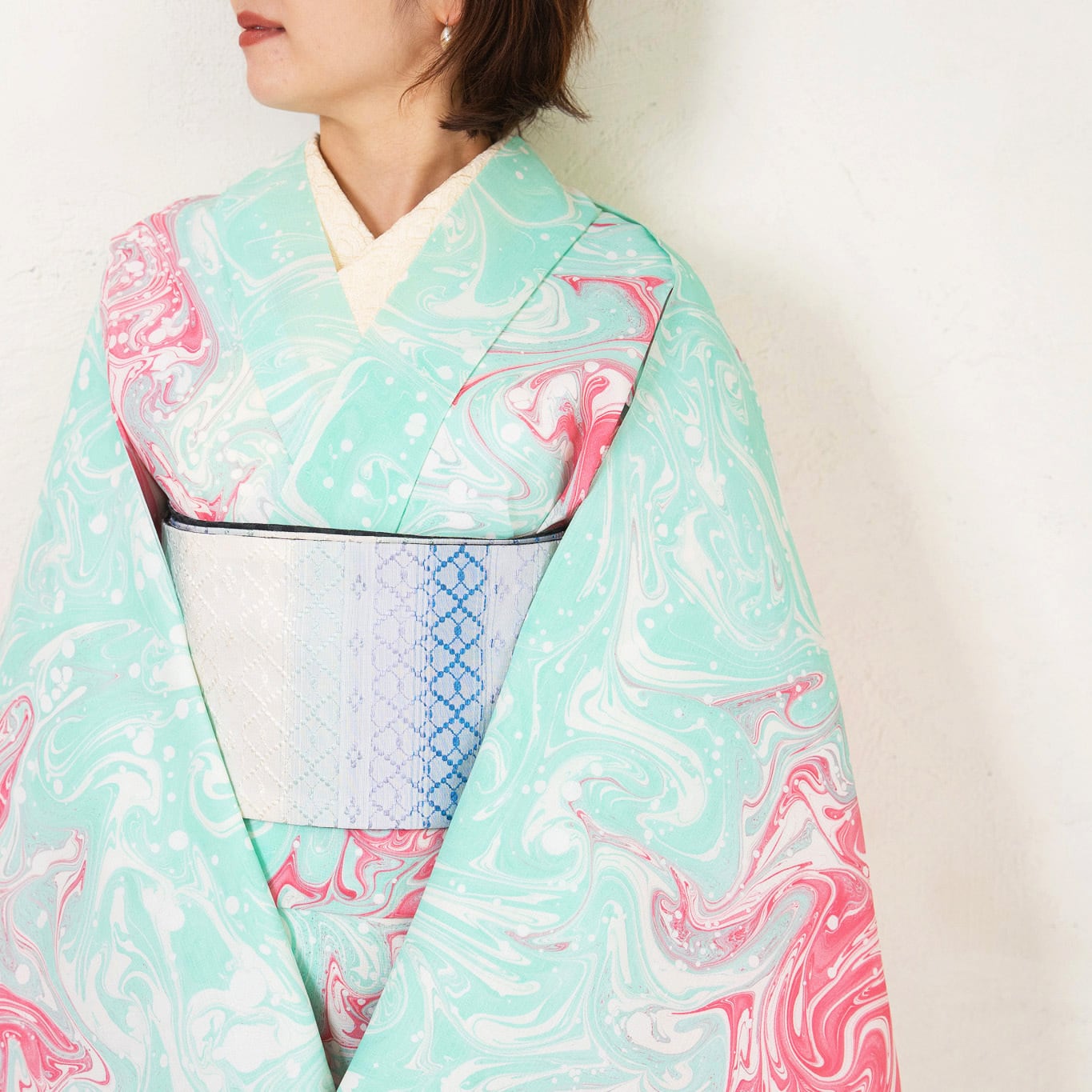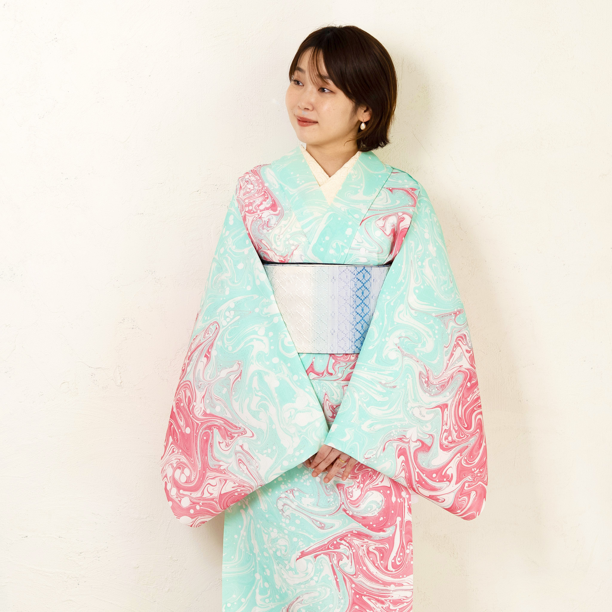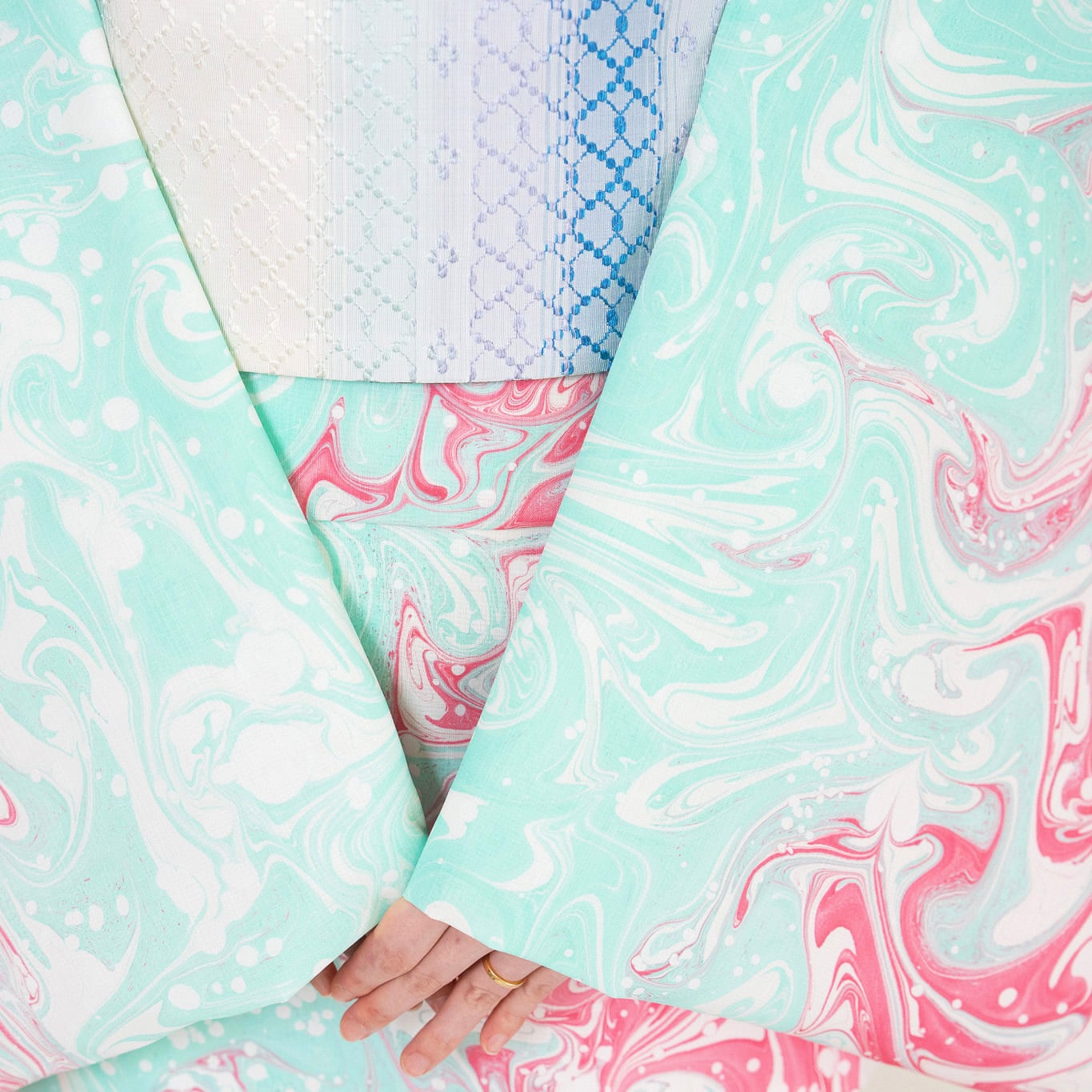 ミントを思わせる澄んだ色合いと、じゅわっとにじむような甘いピンク。
