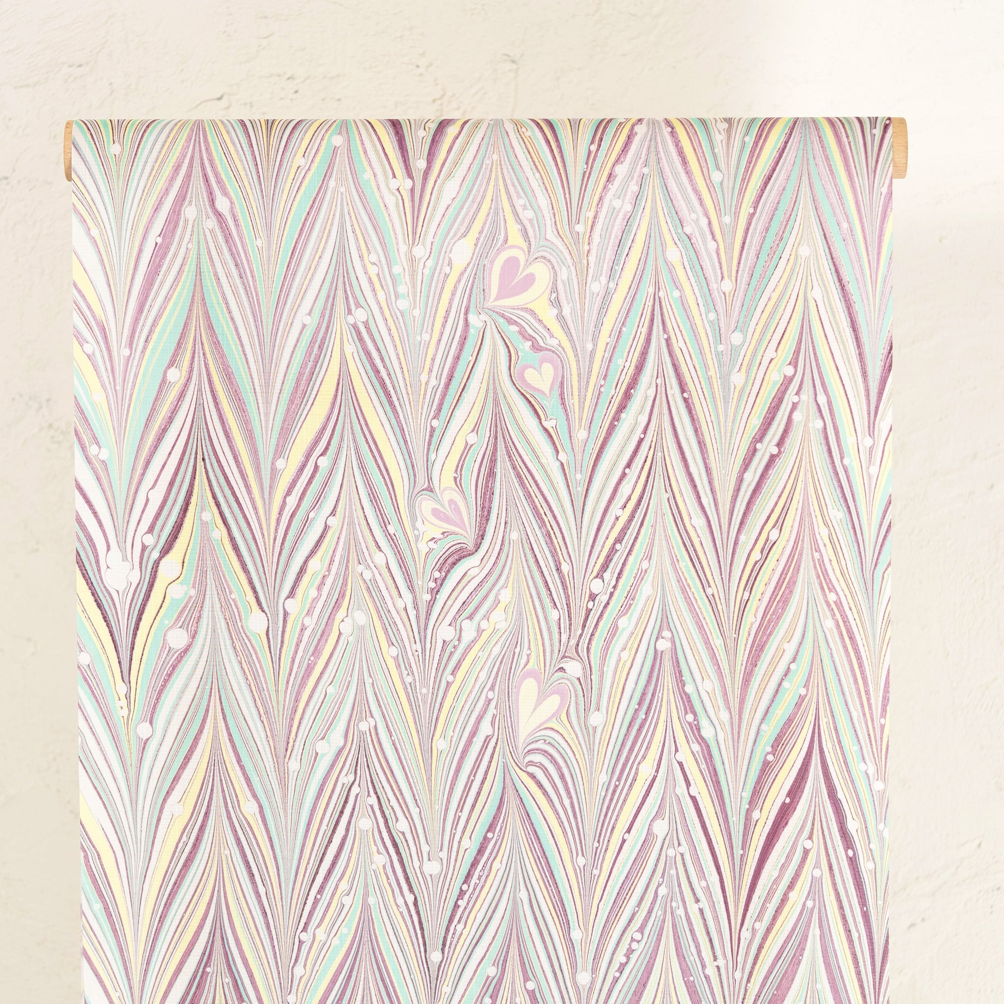 柄の中に散りばめられた白いドットは、水面に浮かぶ光の粒のような軽やかさを添え、さらに反物の端には、さりげなく小さなハートを忍ばせ、シャープな矢羽柄の中にやわらかな遊び心を加えました。