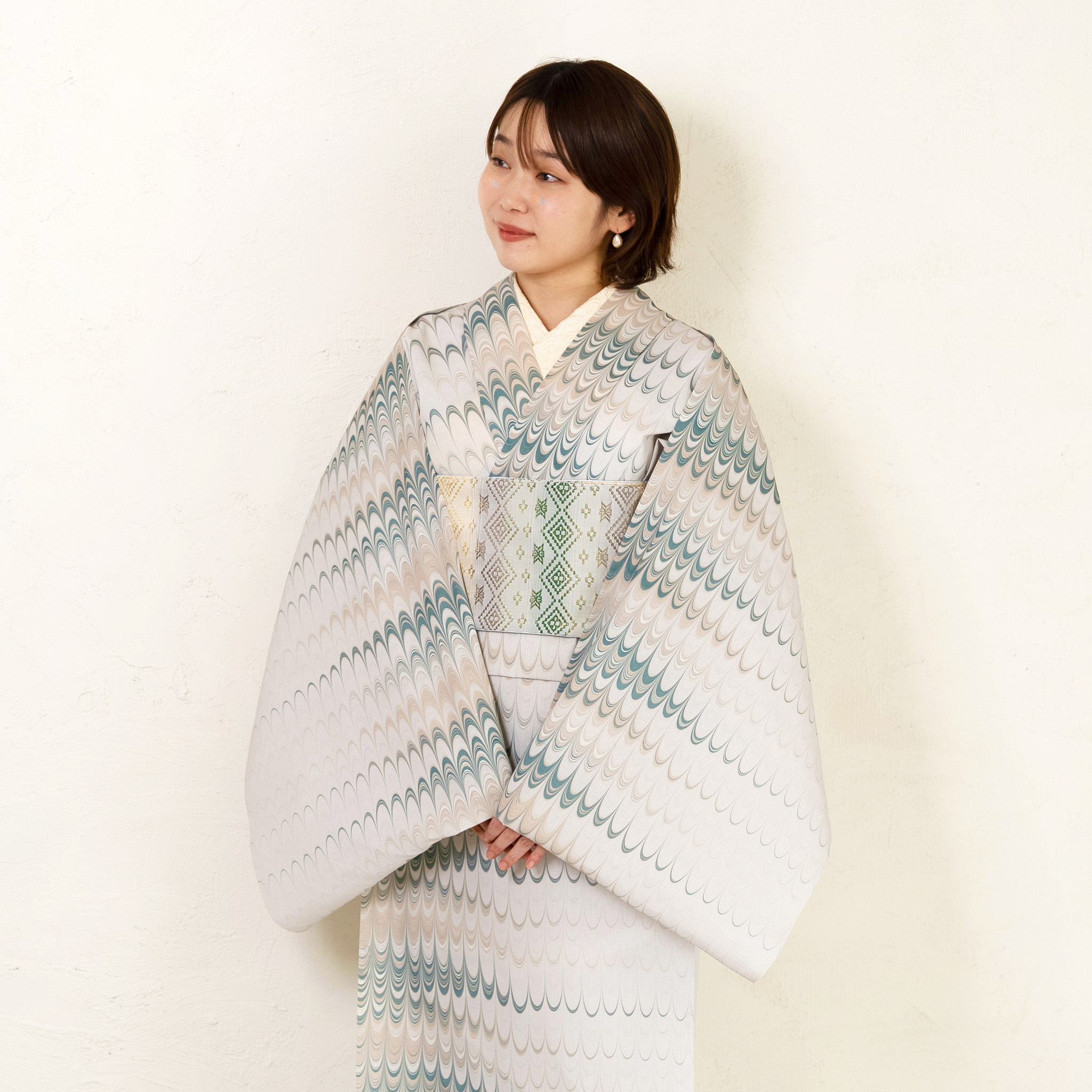 ピーコック柄を基調に、余白を大切にしながら描かれた静かな表情が特徴です。