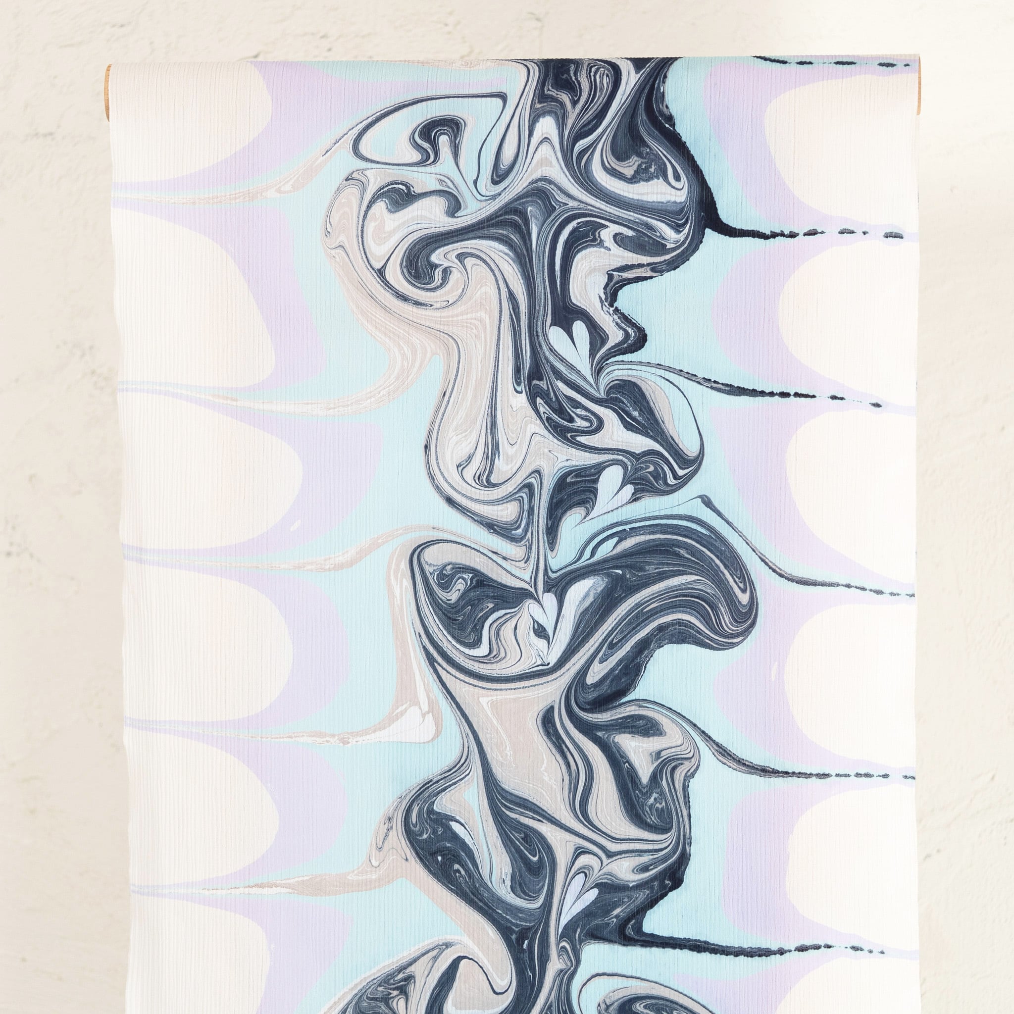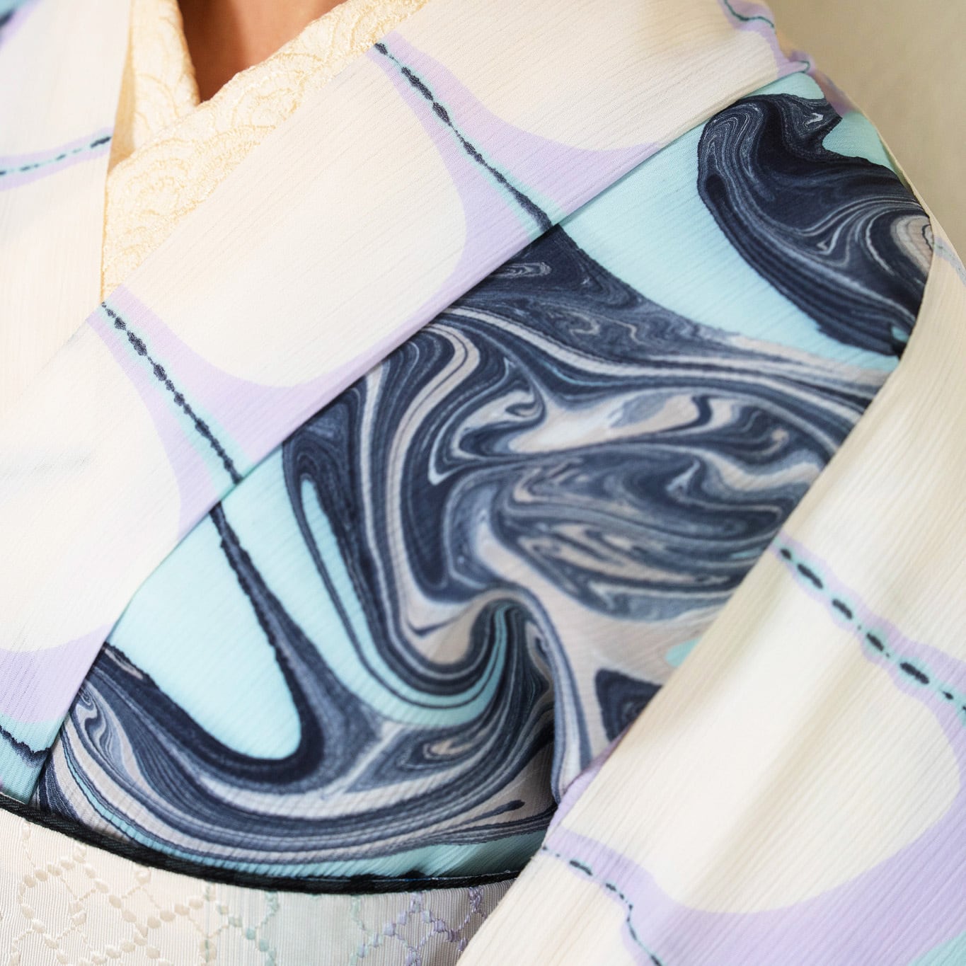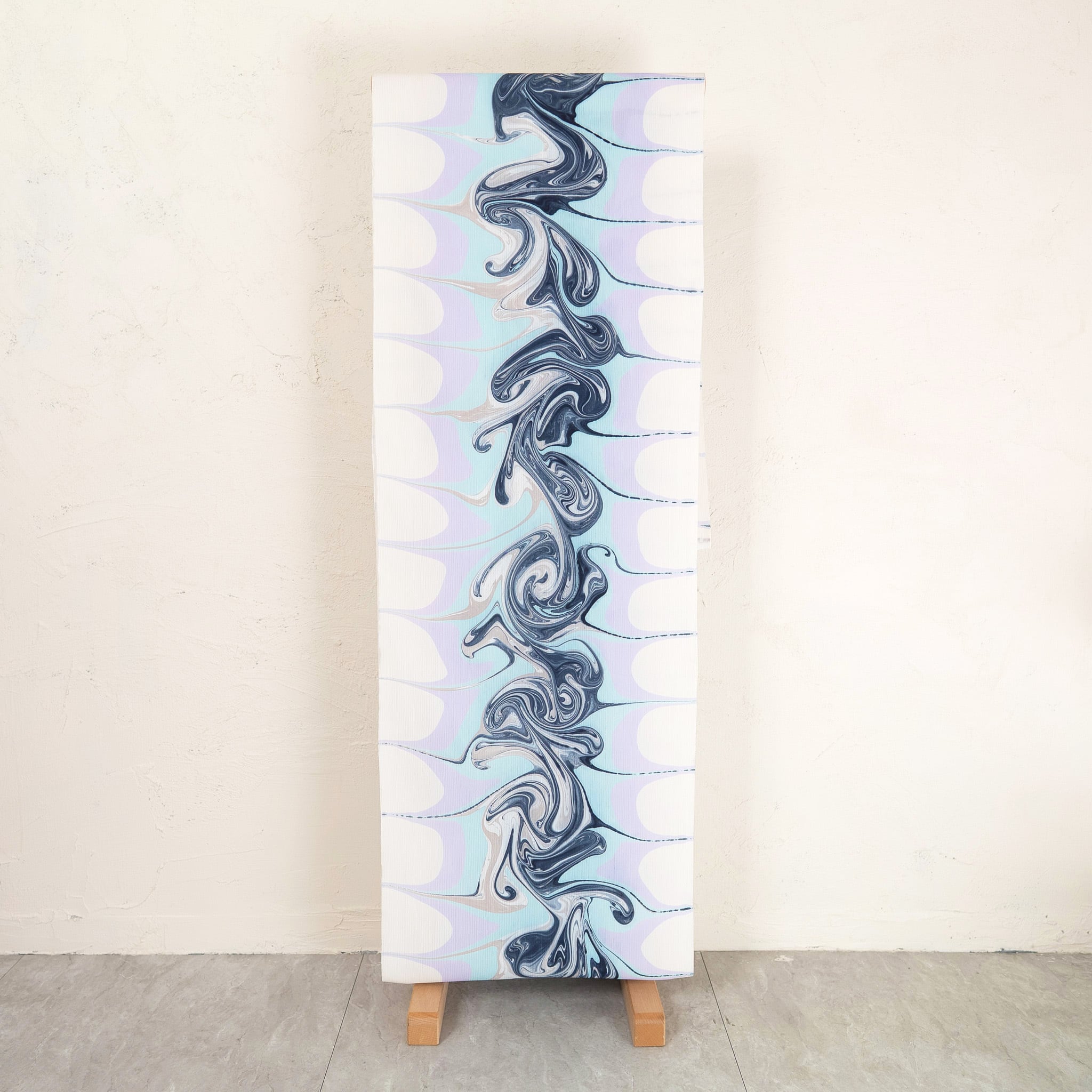 そのすべては、墨流し特有の偶然性と、作家の繊細なコントロールの積み重ねによって生まれたものです。近くで見るほどに、線の揺らぎや色の重なりの豊かさを感じていただけます。