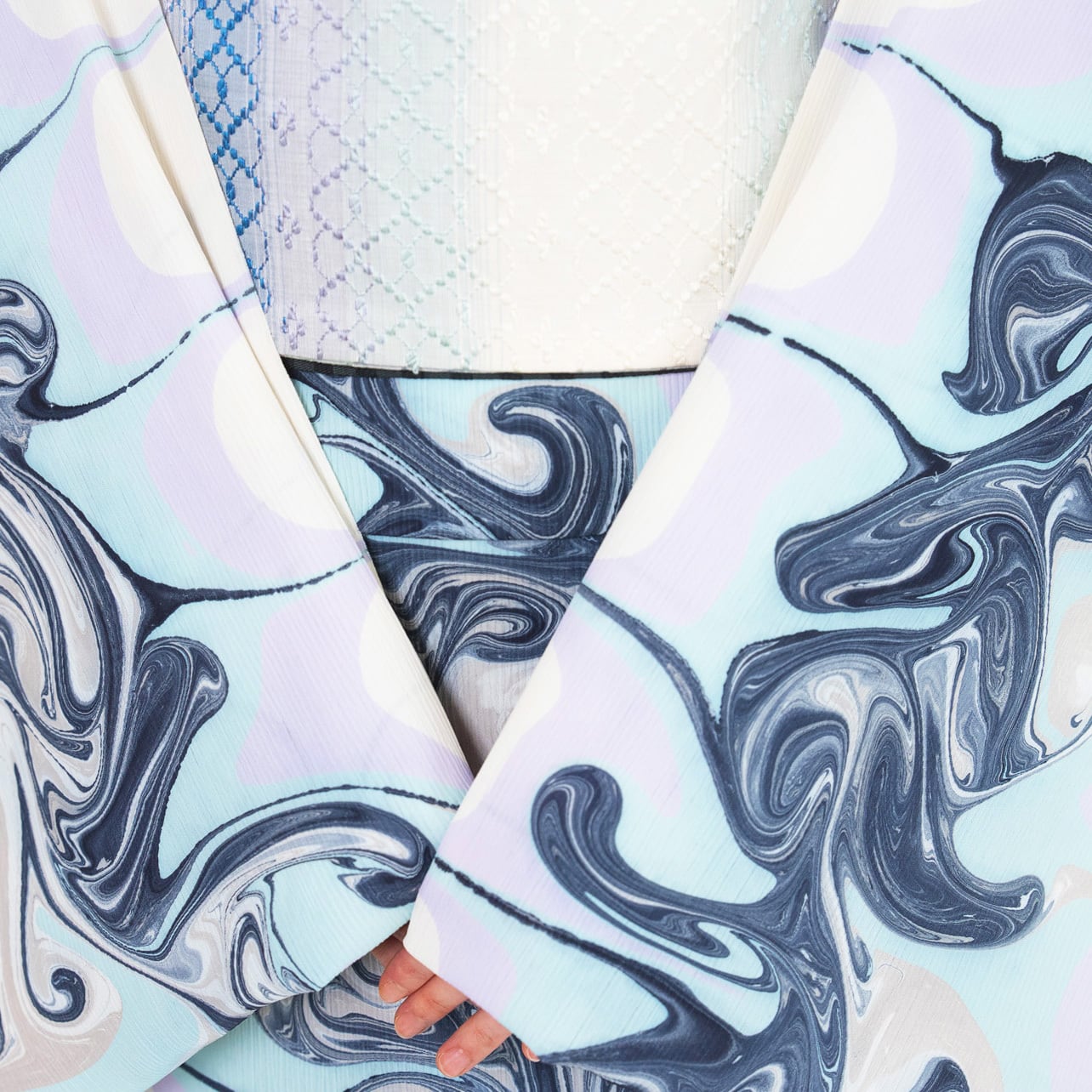 中央に寄せた蝶のようなマーブル模様は、羽ばたく気配を感じさせる構成。流れる線の重なりが、凛とした空気をまといながらも、どこか夢の中の景色のようなやさしさを漂わせています。
