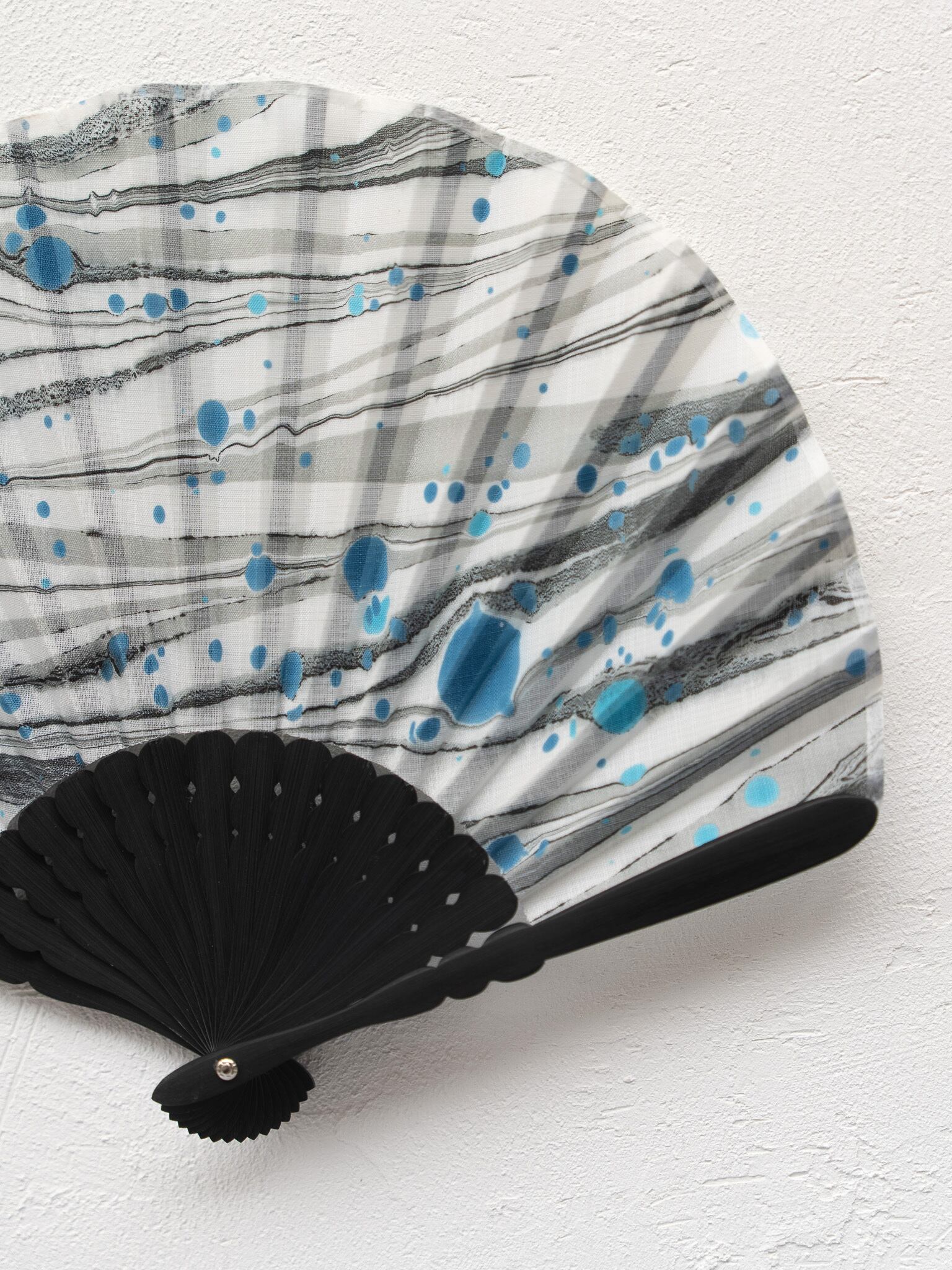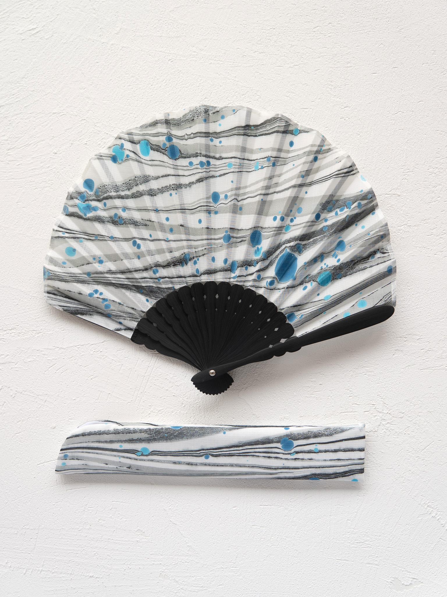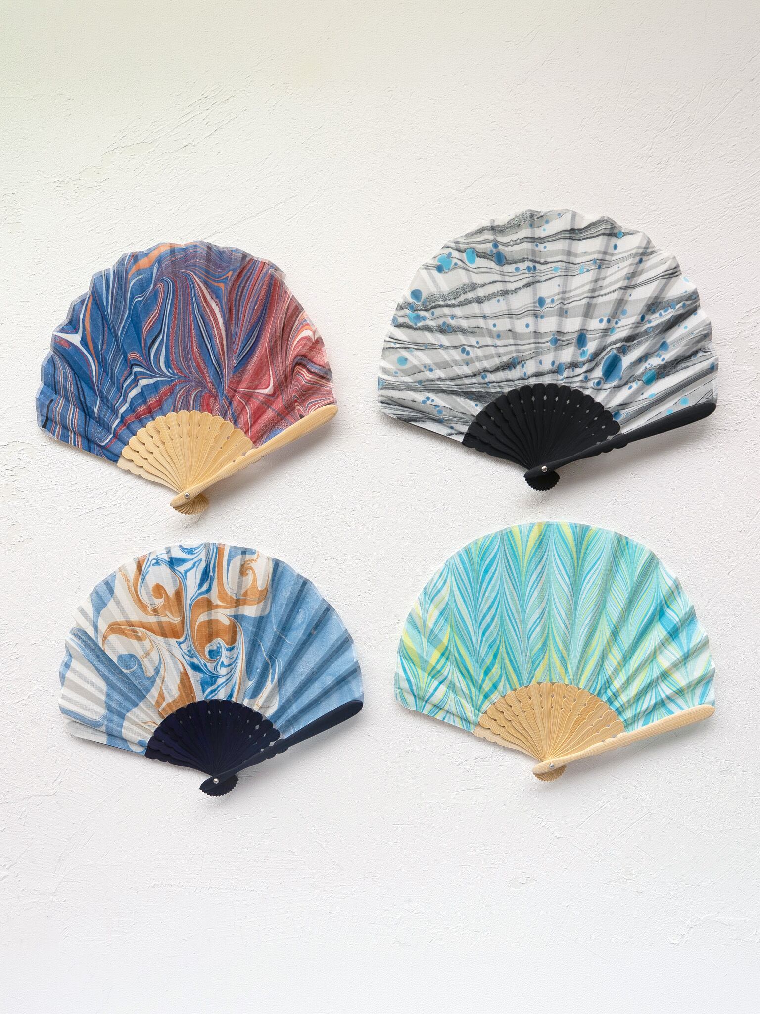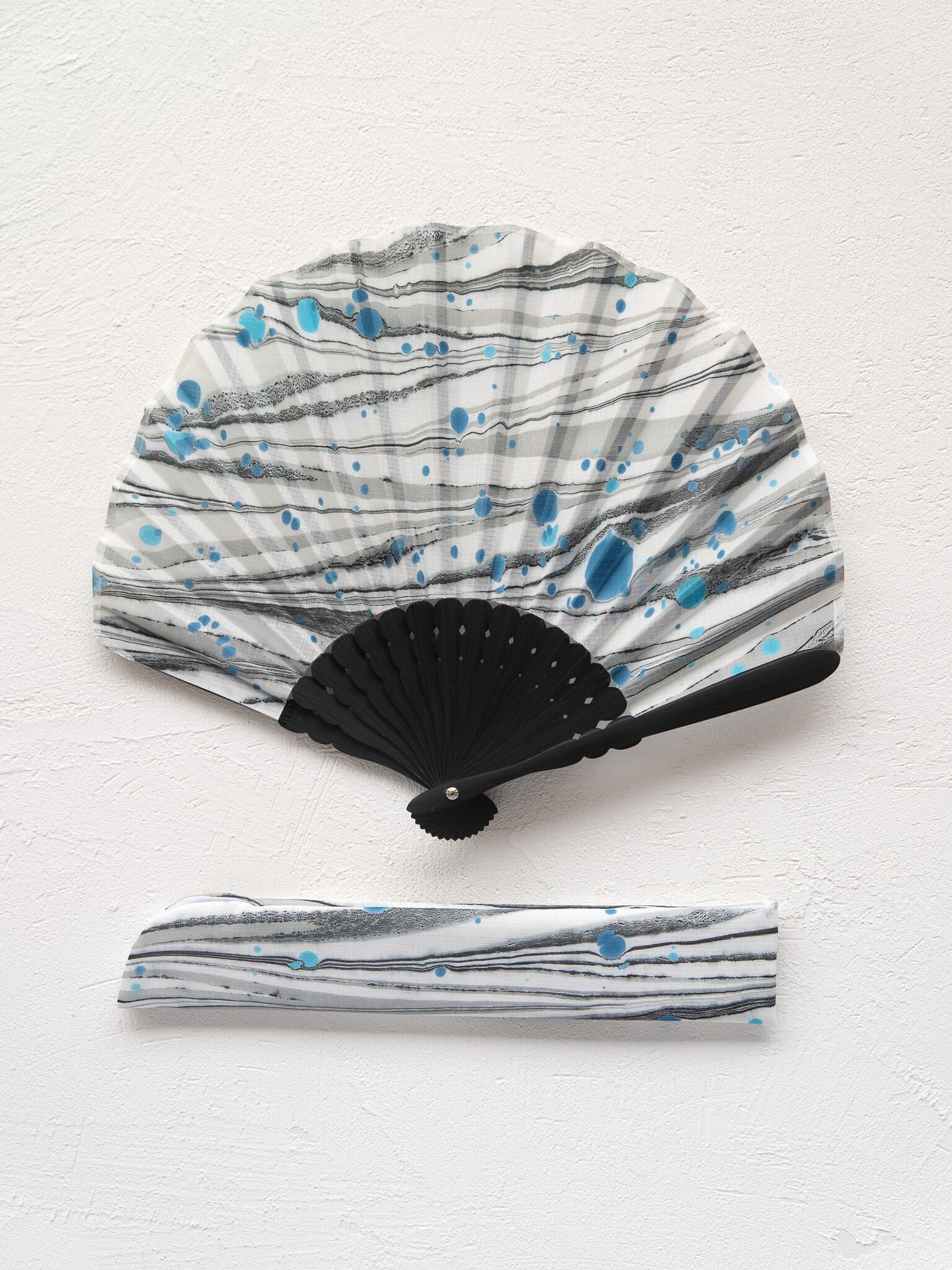 「末広がりの縁起物」である扇子に、「苦労を流して幸せを運ぶ」といわれる墨流しを組み合わせた、吉祥の意を込めた作品です。