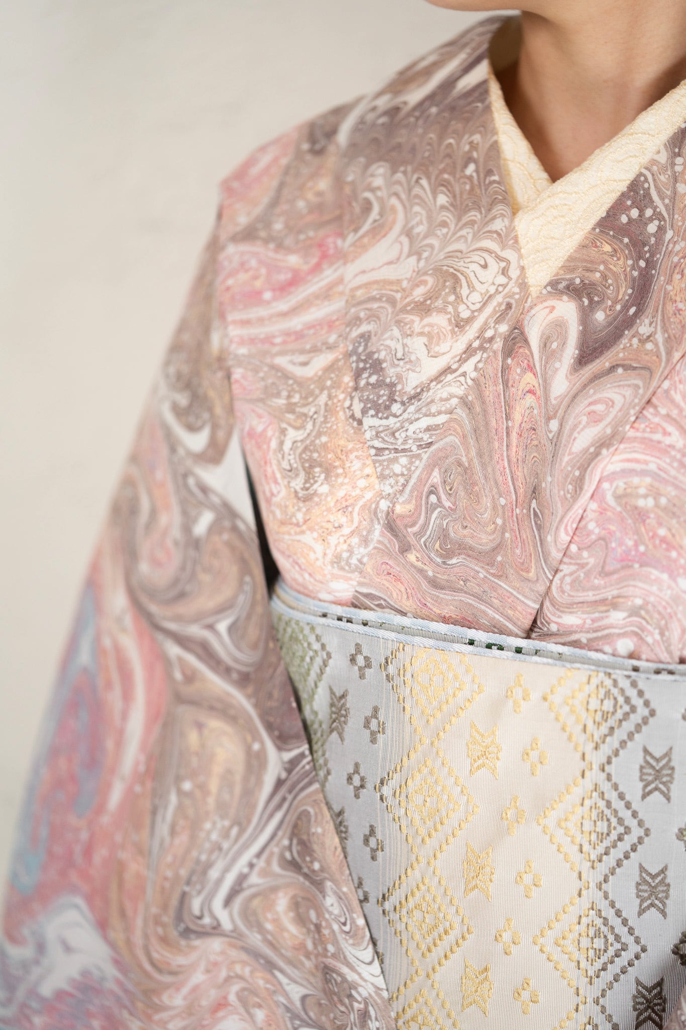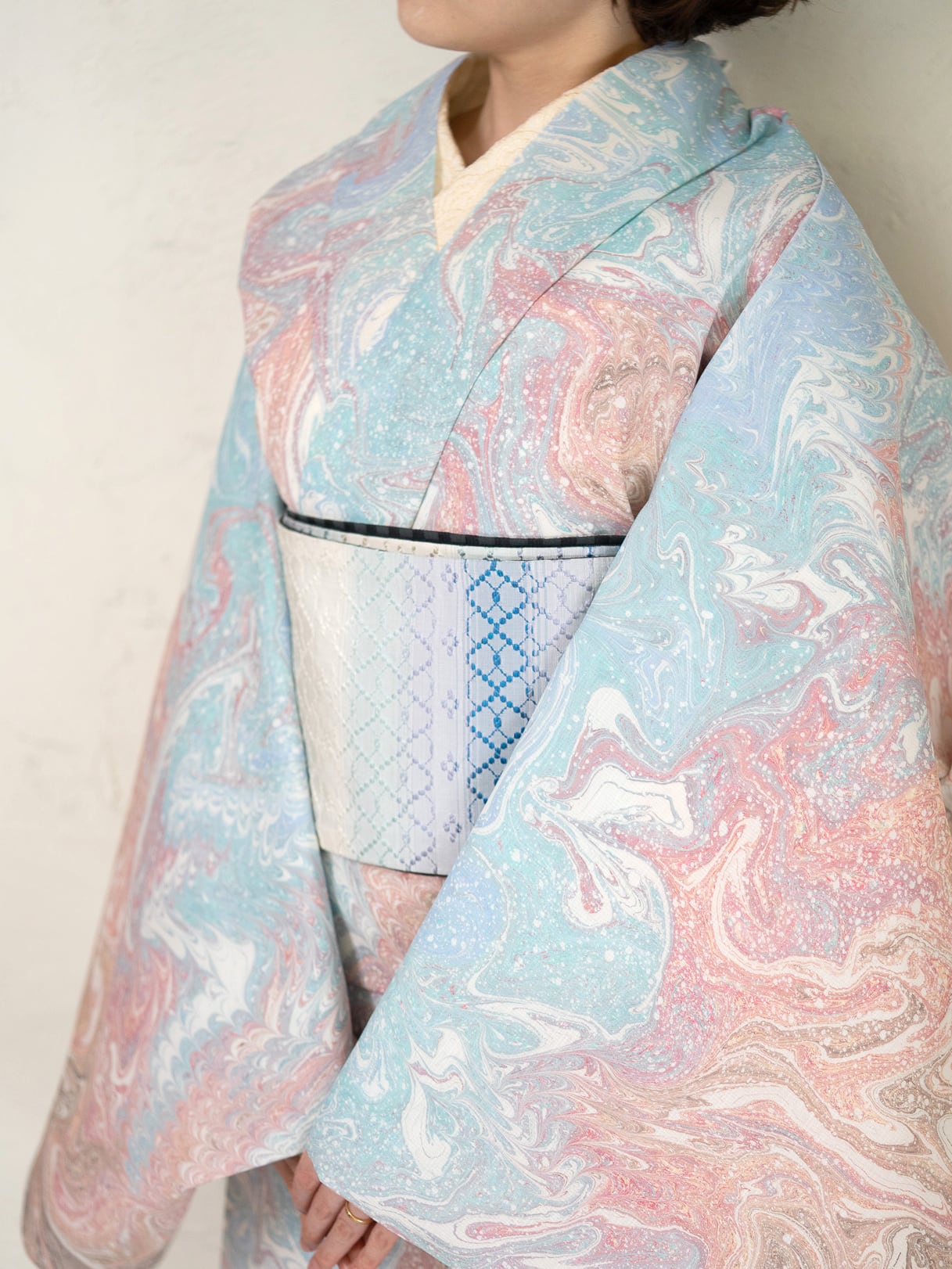 水色、ミント、くすみピンク、ブラウン、クリーム、苔を思わせるような深いニュアンスの重なりが、しっとりと落ち着いた大人の表情を描き出しています。
