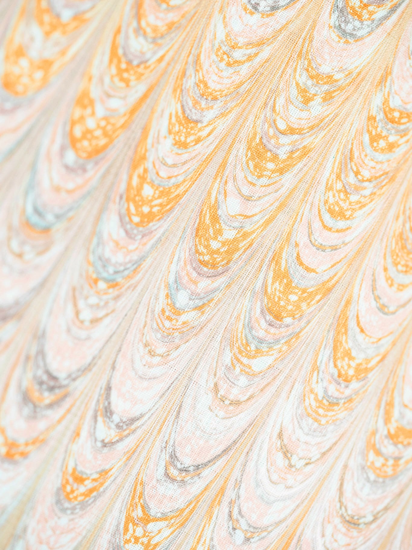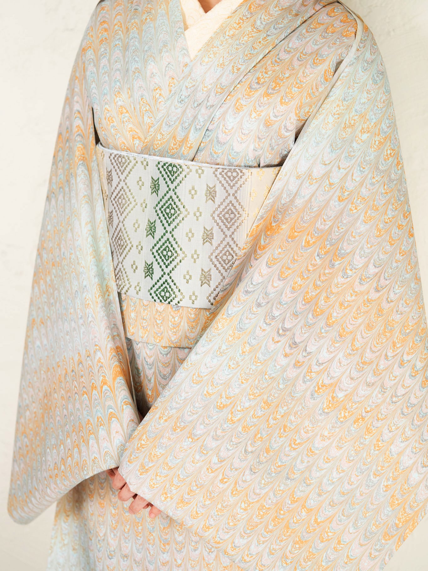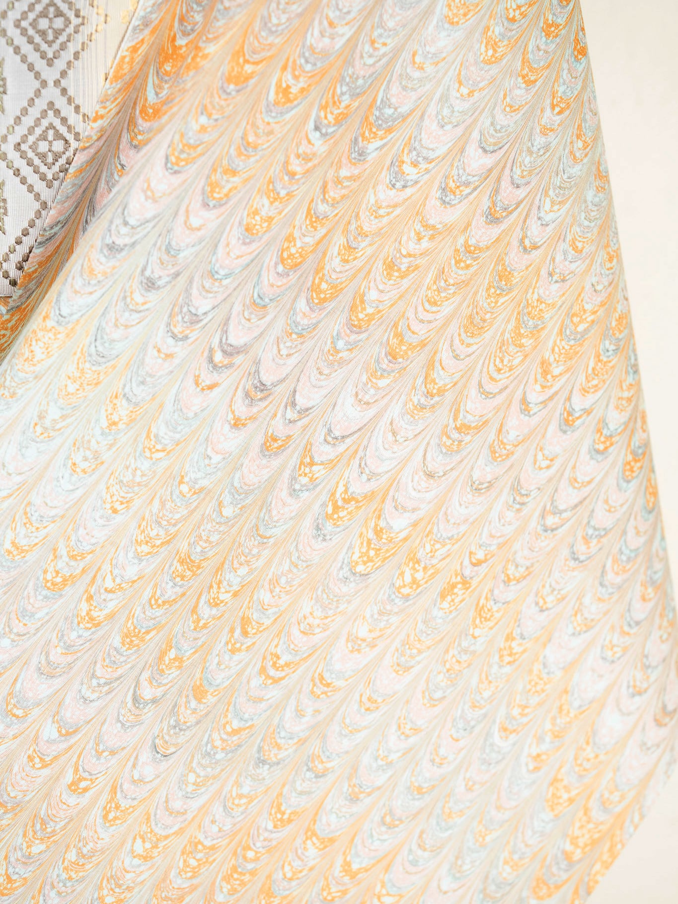 一見すると落ち着いた色合いながら、近くで見ると、オレンジ、ミント、淡いピンク、ほのかなグレーが繊細に重なり合っています。