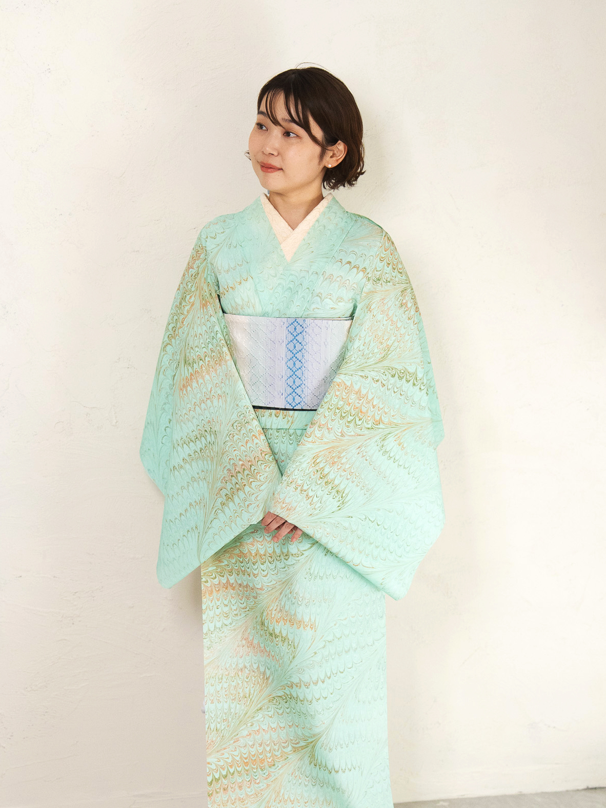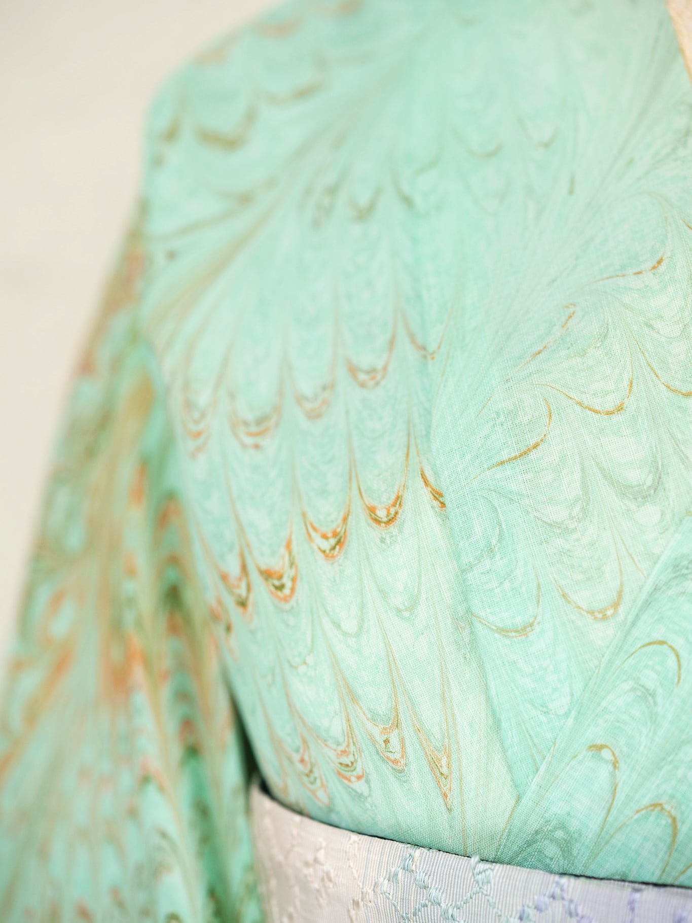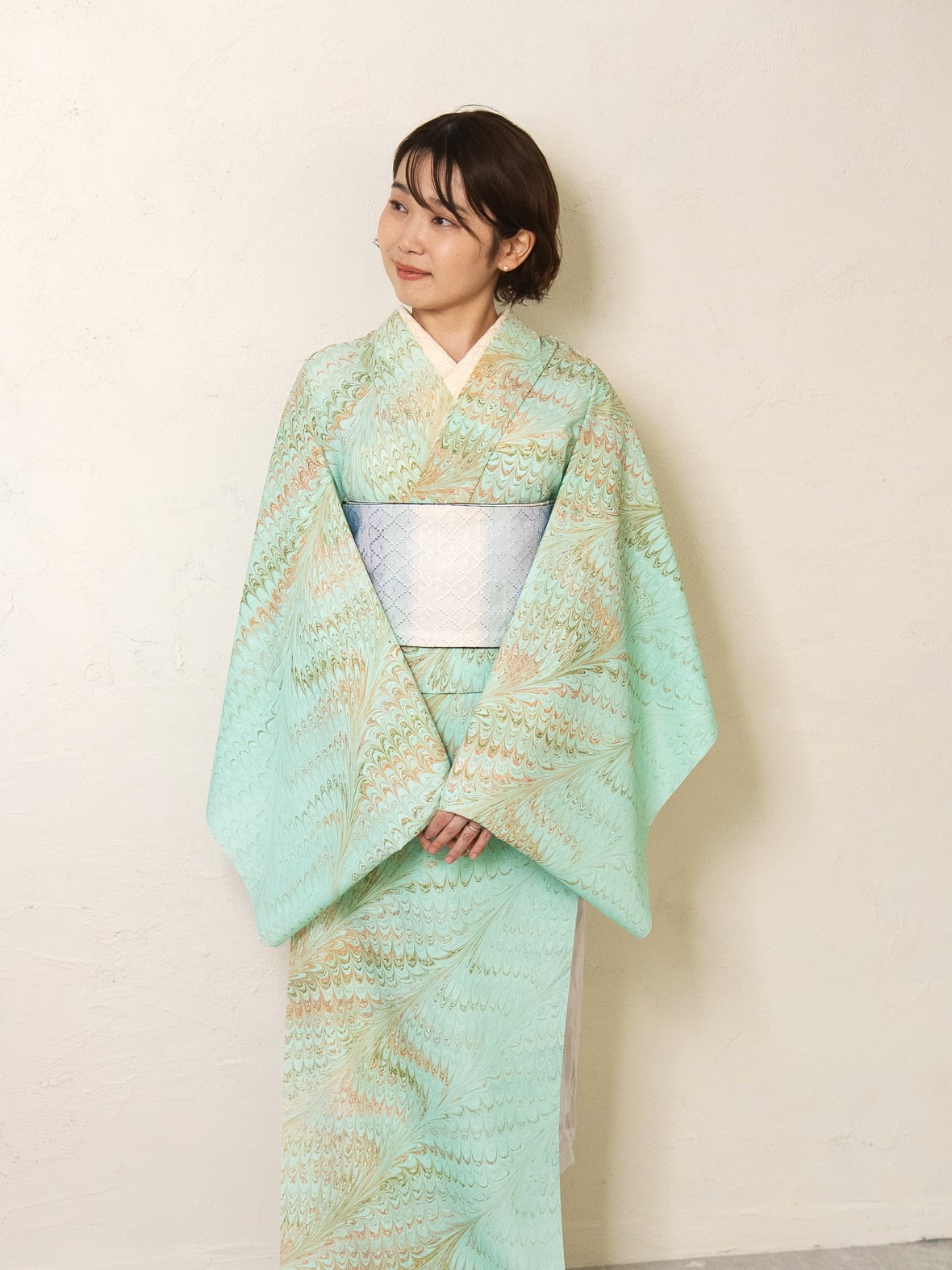 染め分けの表情も美しく、衿元にミントを配置すると上品で爽やかな印象に。