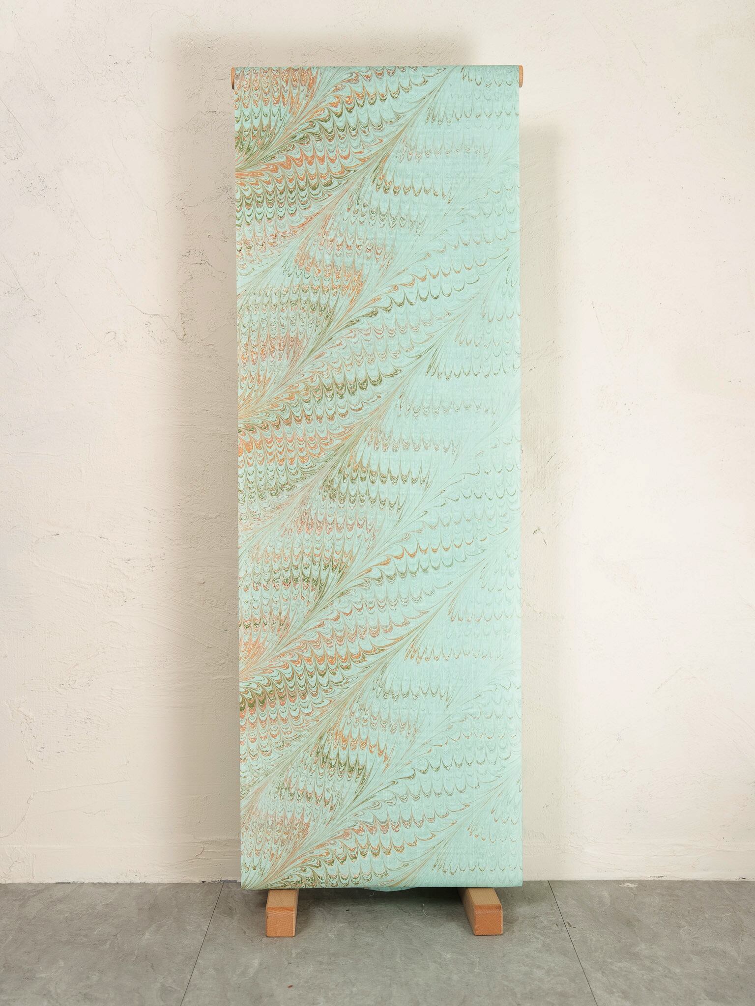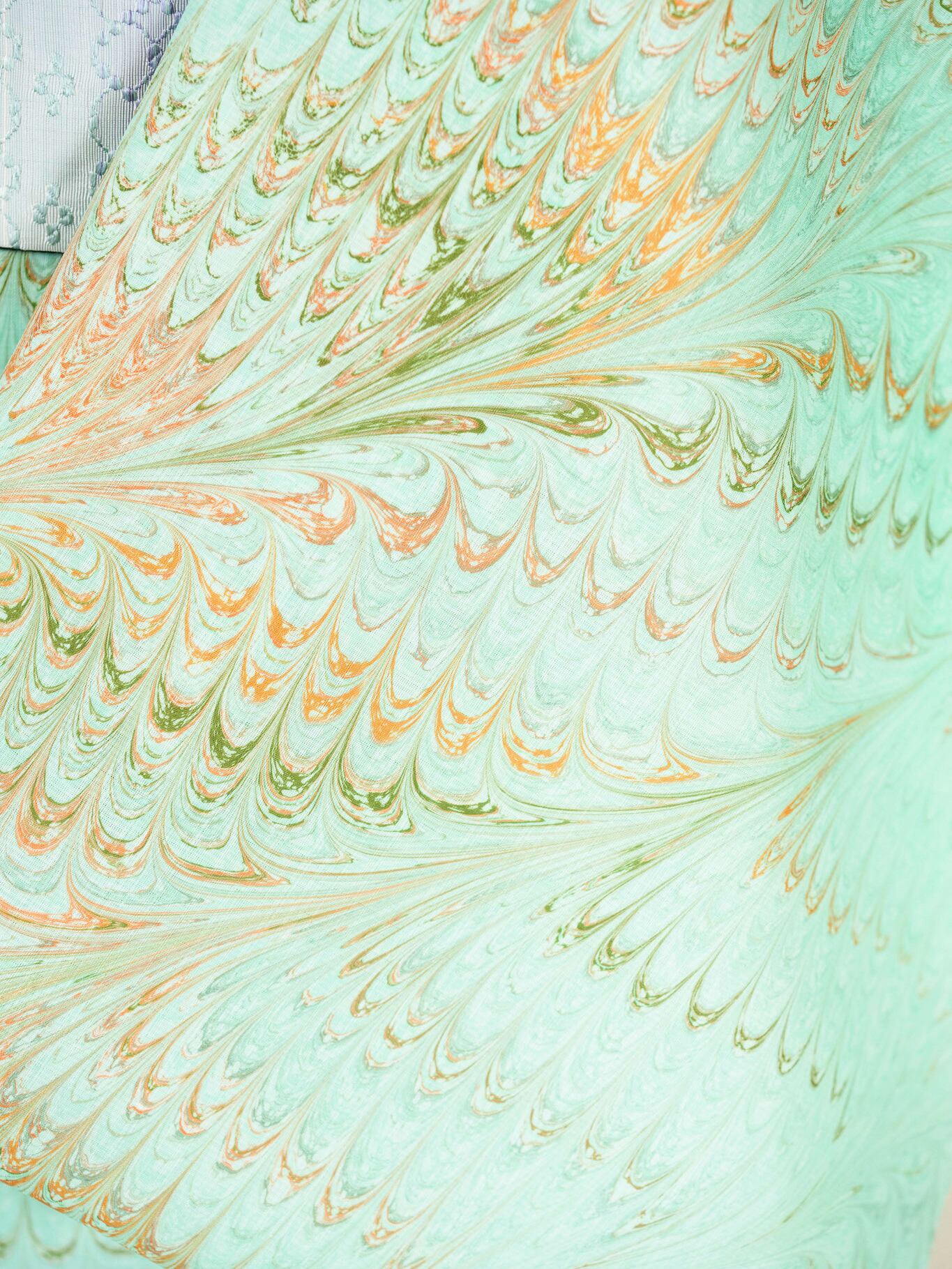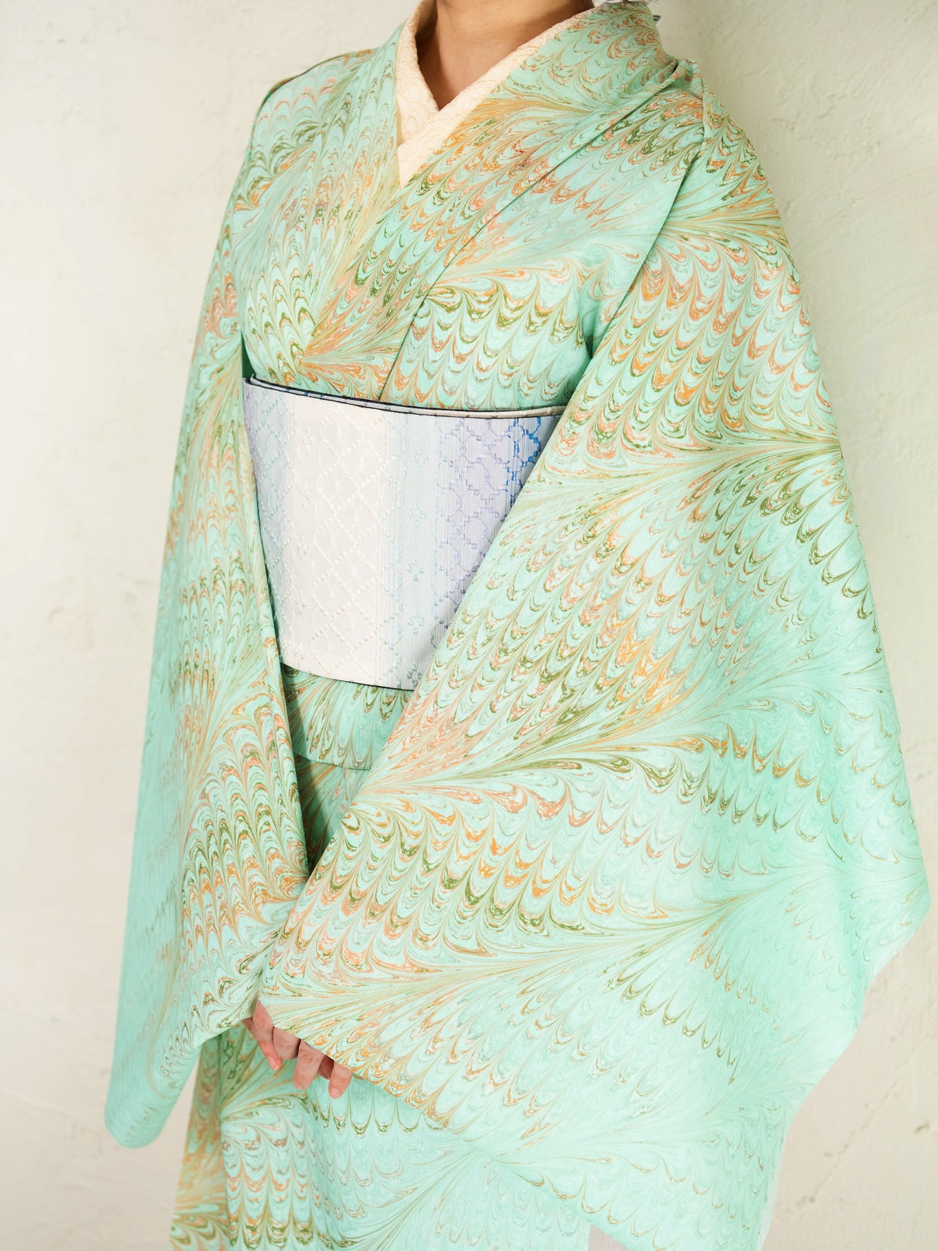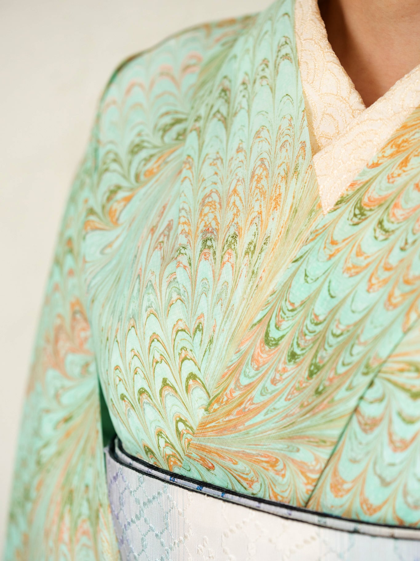モスグリーン、ミント、オレンジ、ほのかなグレー、そしてサーモンピンクが繊細に重なり合う一反。