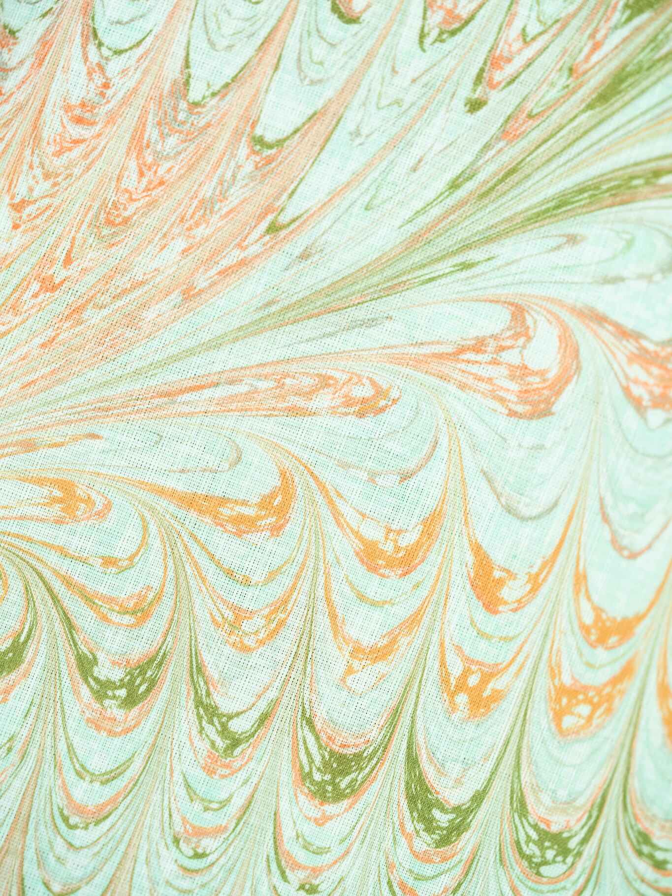 流れるような模様の中に、爽やかさと、どこか南国を思わせる色のアクセントが重なり、大人のおしゃれ心をくすぐる作品です。