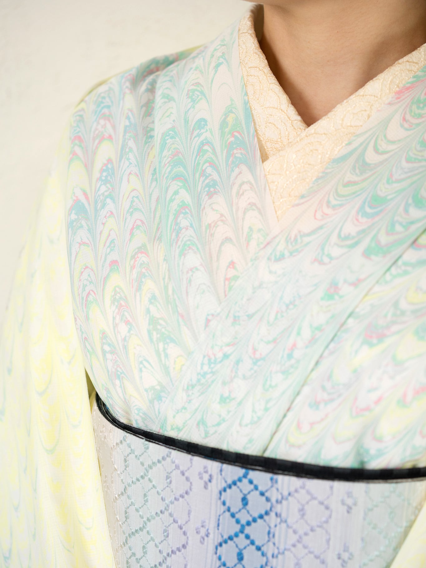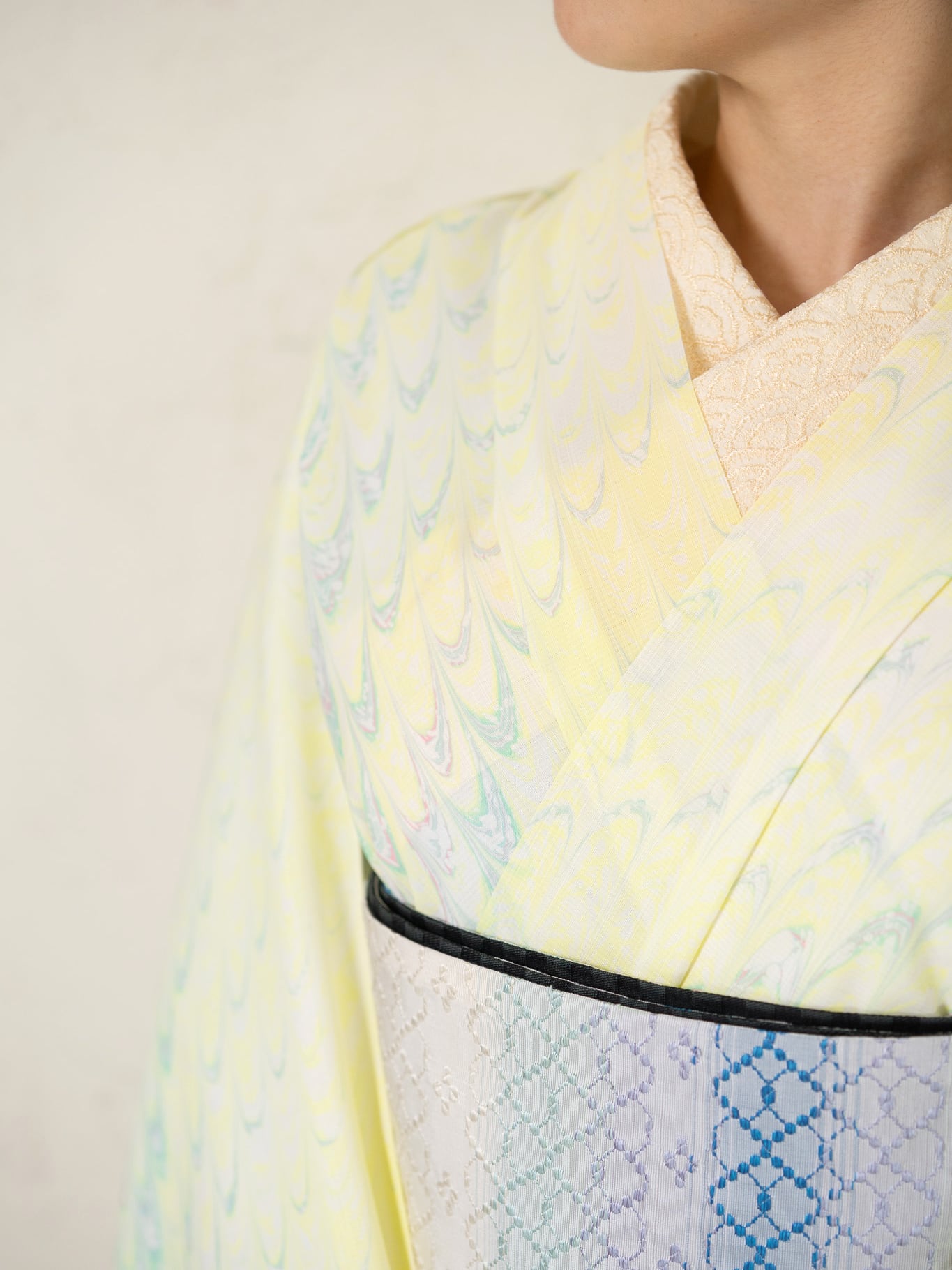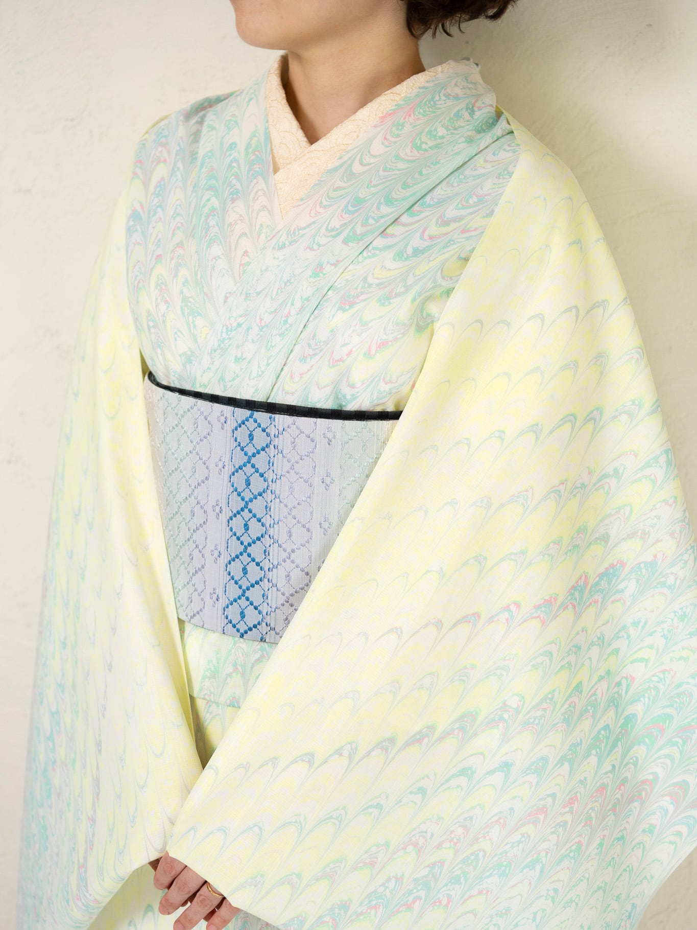 レモンシャーベットのようにやわらかく、明るい日差しを思わせる淡い黄色をベースに、ミント、水色、ほんのりとしたピンクが重なり合う一反。