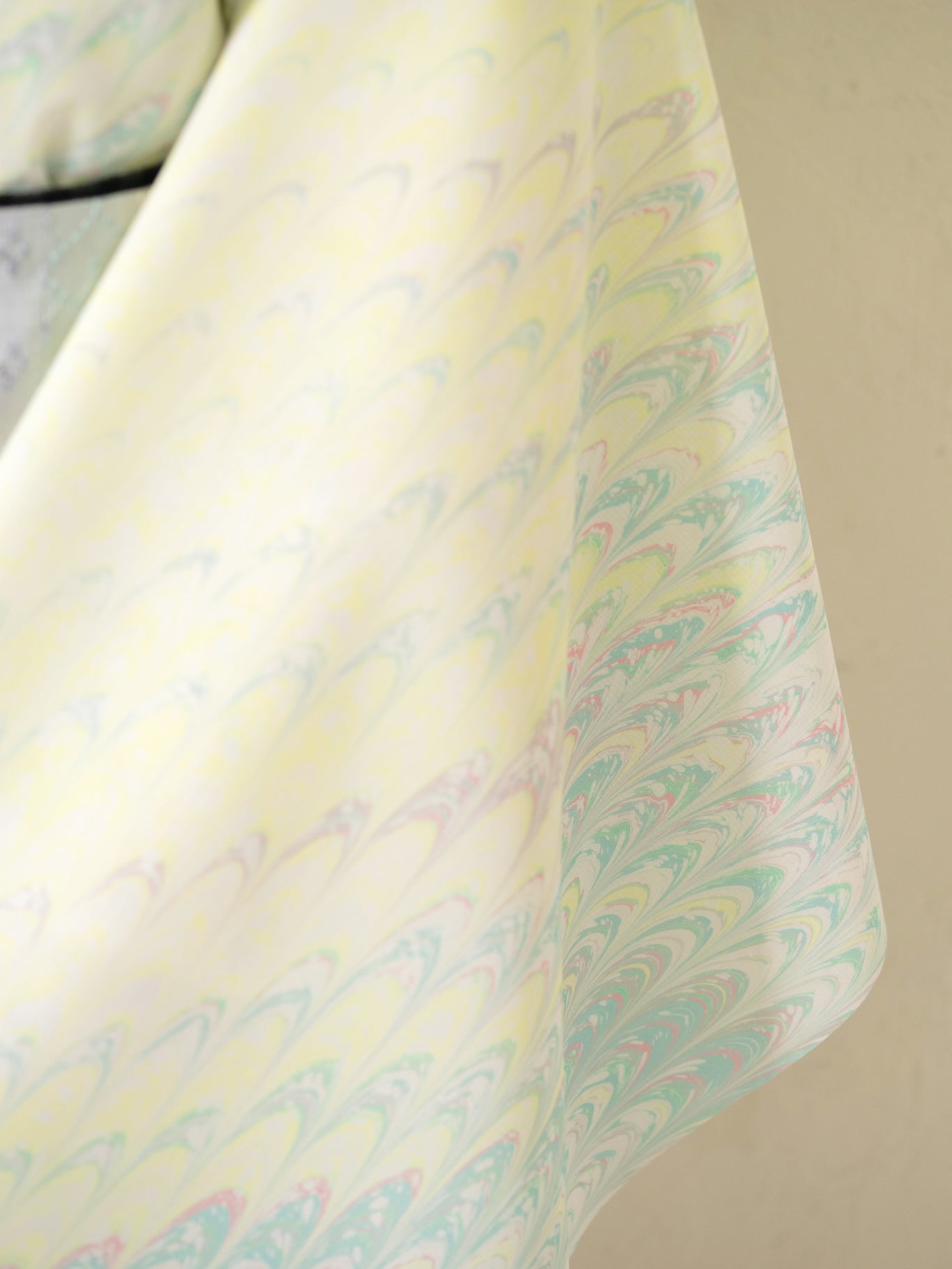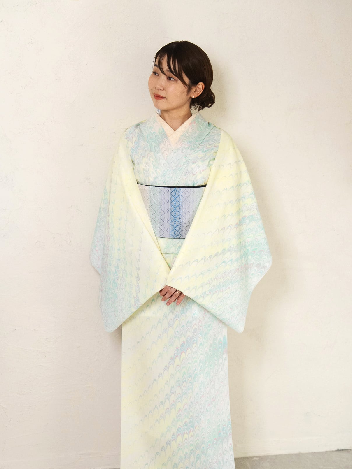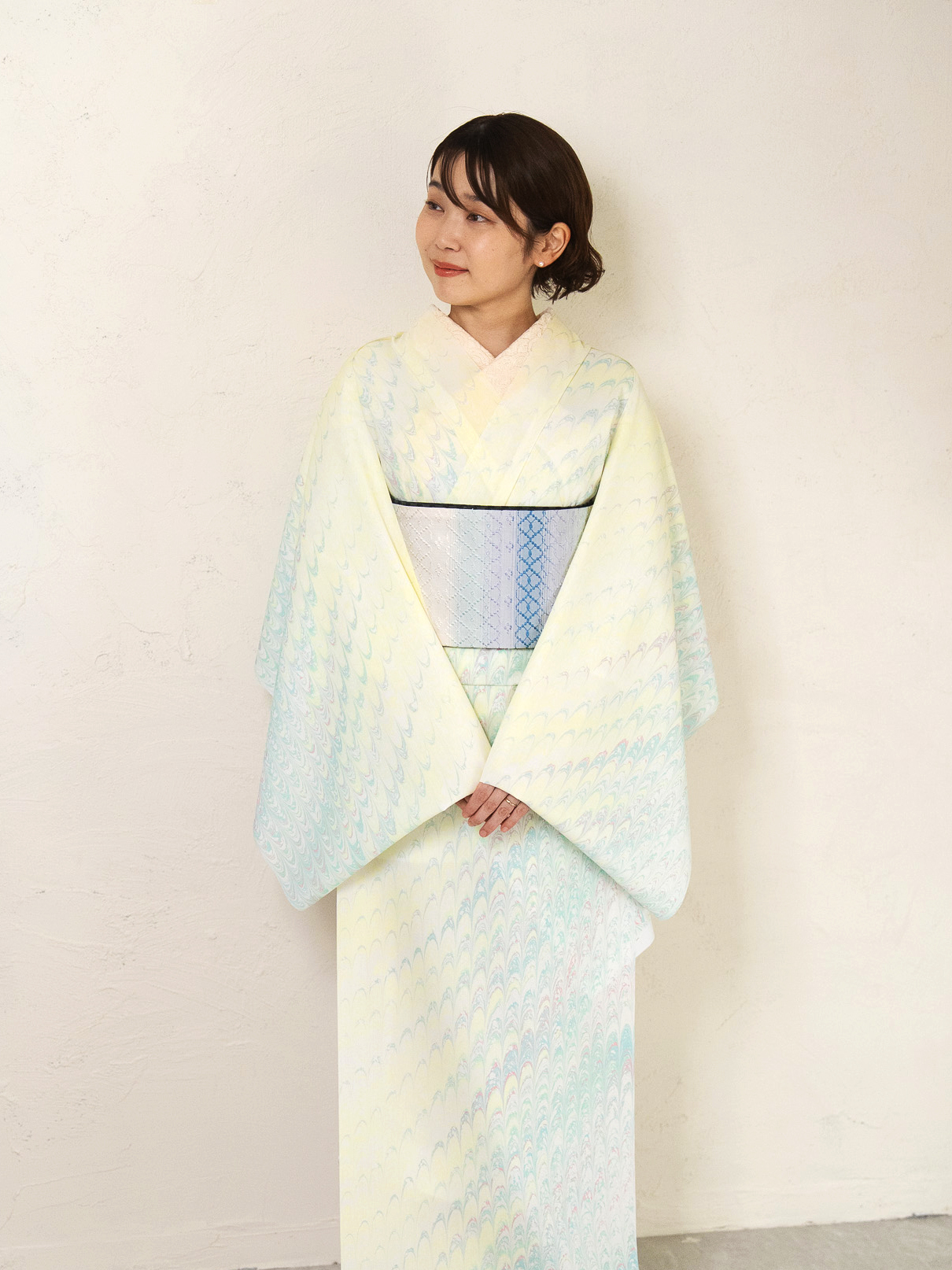 レモンシャーベットのようにやわらかく、明るい日差しを思わせる淡い黄色をベースに、ミント、水色、ほんのりとしたピンクが重なり合う一反。