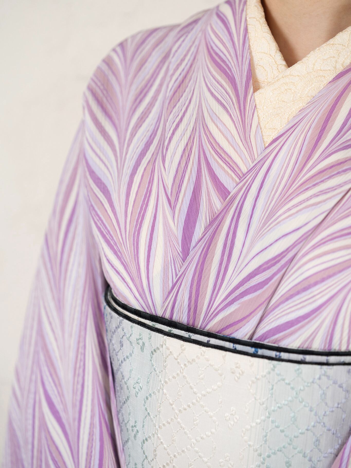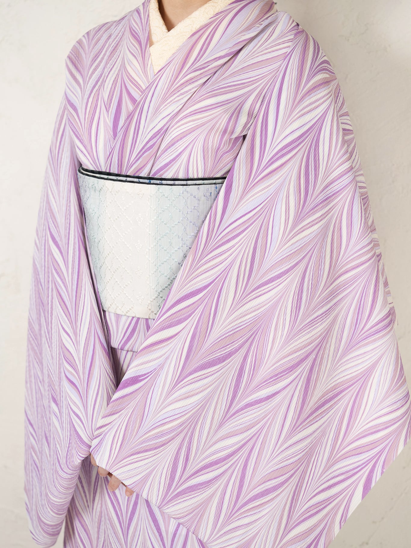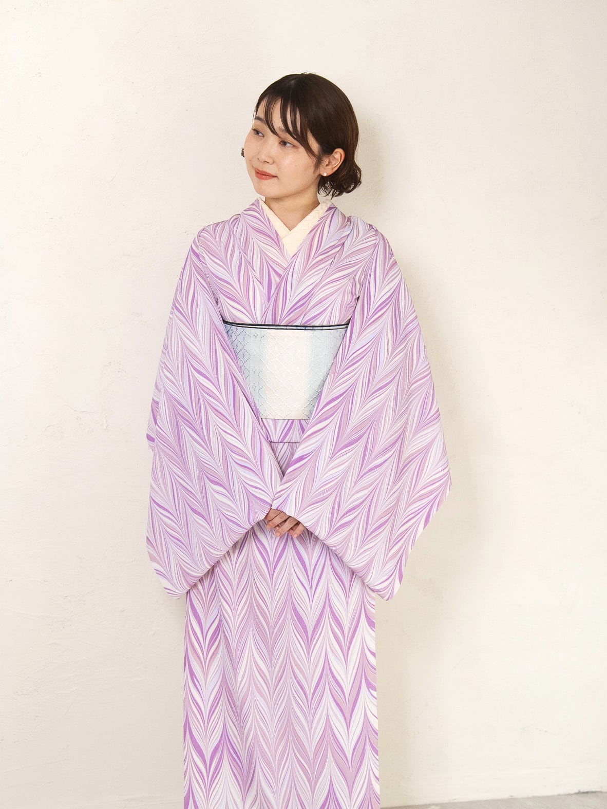 柄は矢羽柄。流れるように重なるラインが、軽やかな動きと奥行きを生み、装いにさりげない華やかさを添えます。