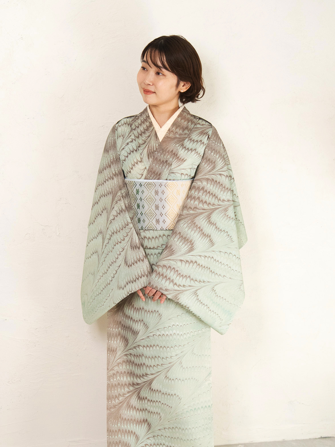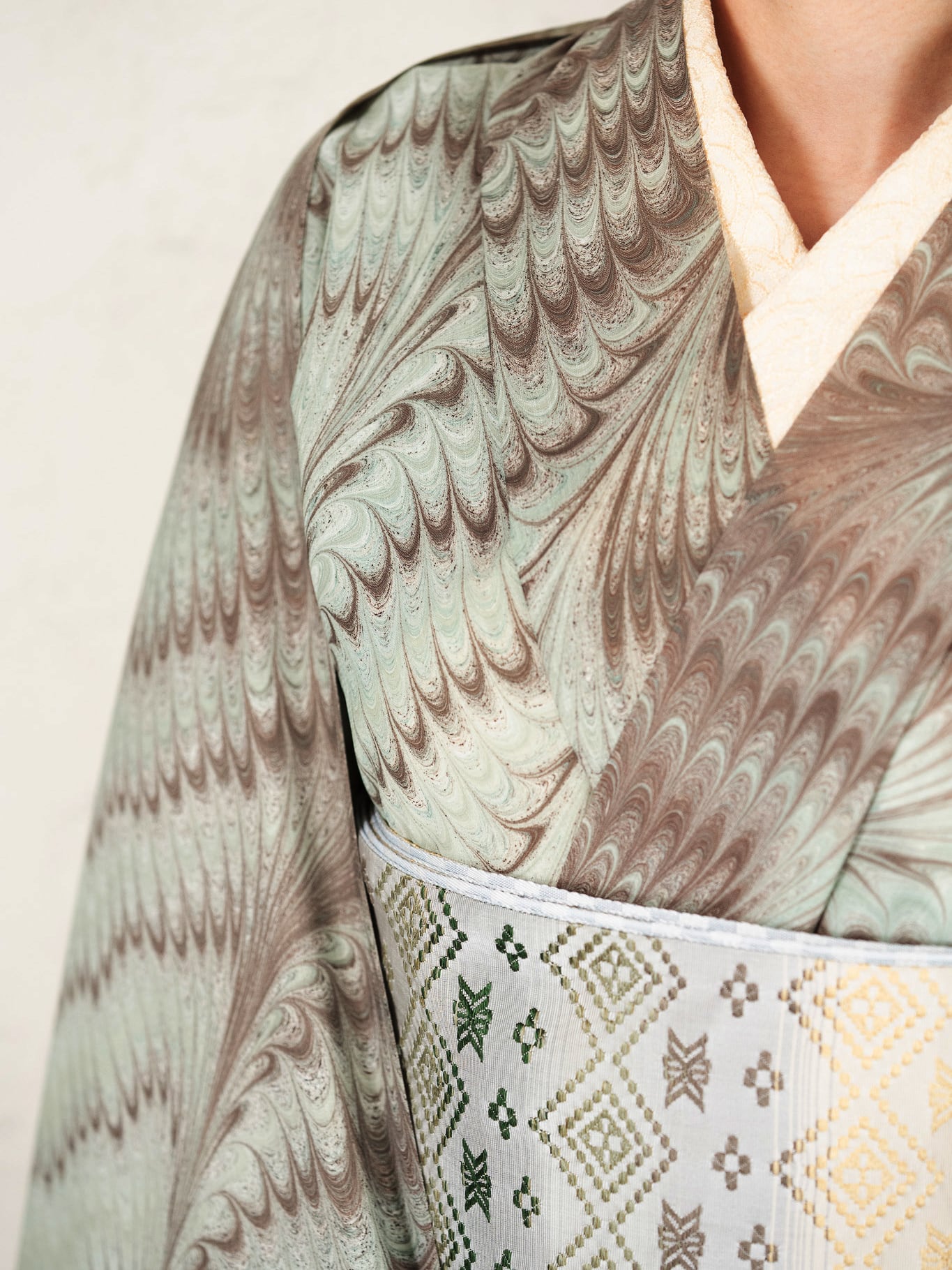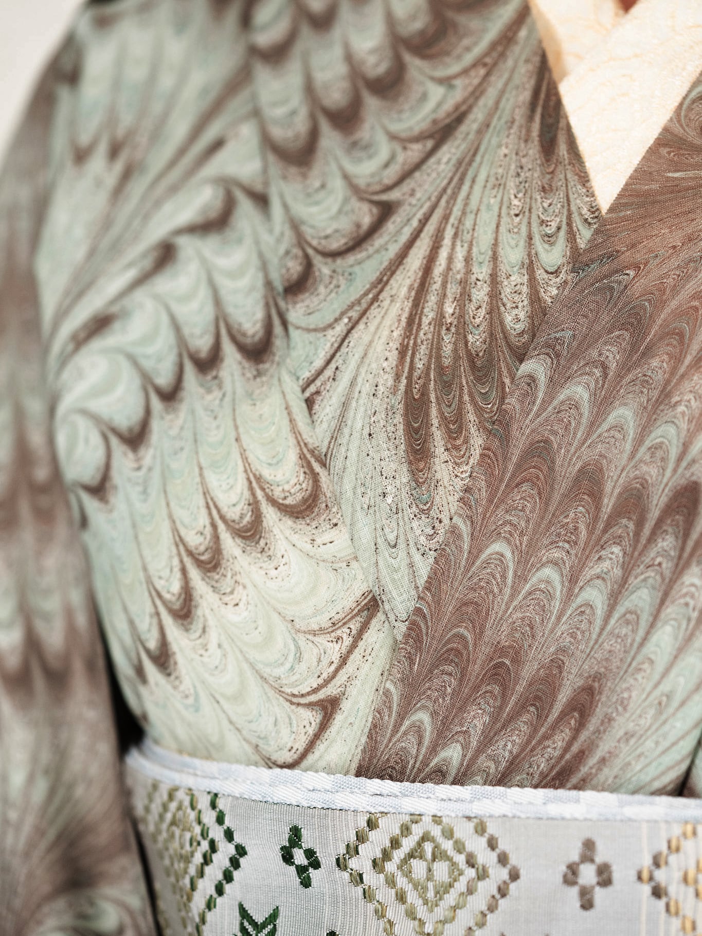 お仕立ての配置によって、衿元や身頃の印象が変わり、同じ反物の中でも異なる表情をお楽しみいただけます。