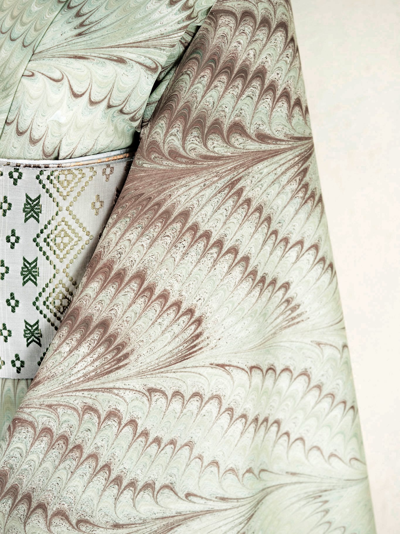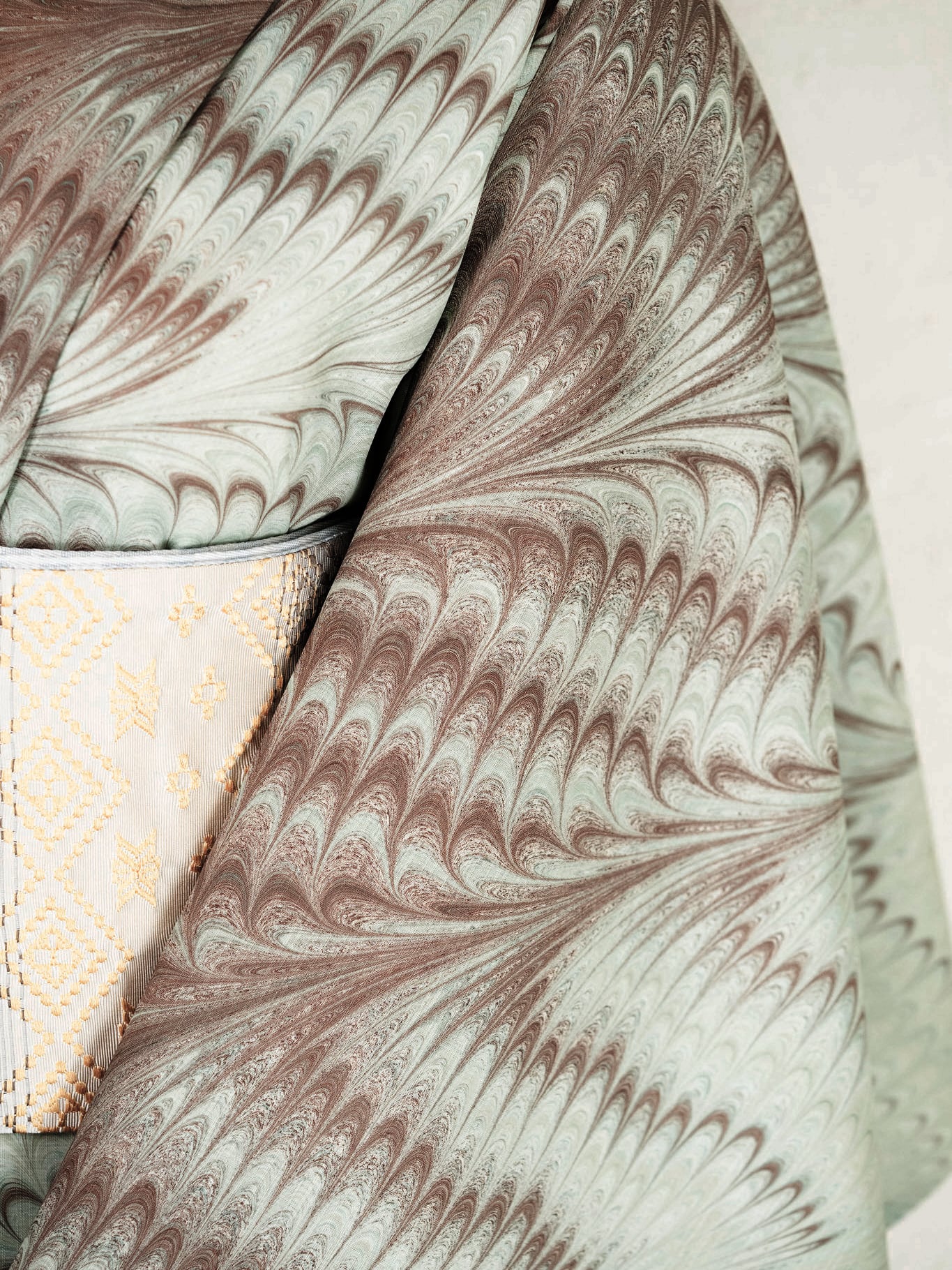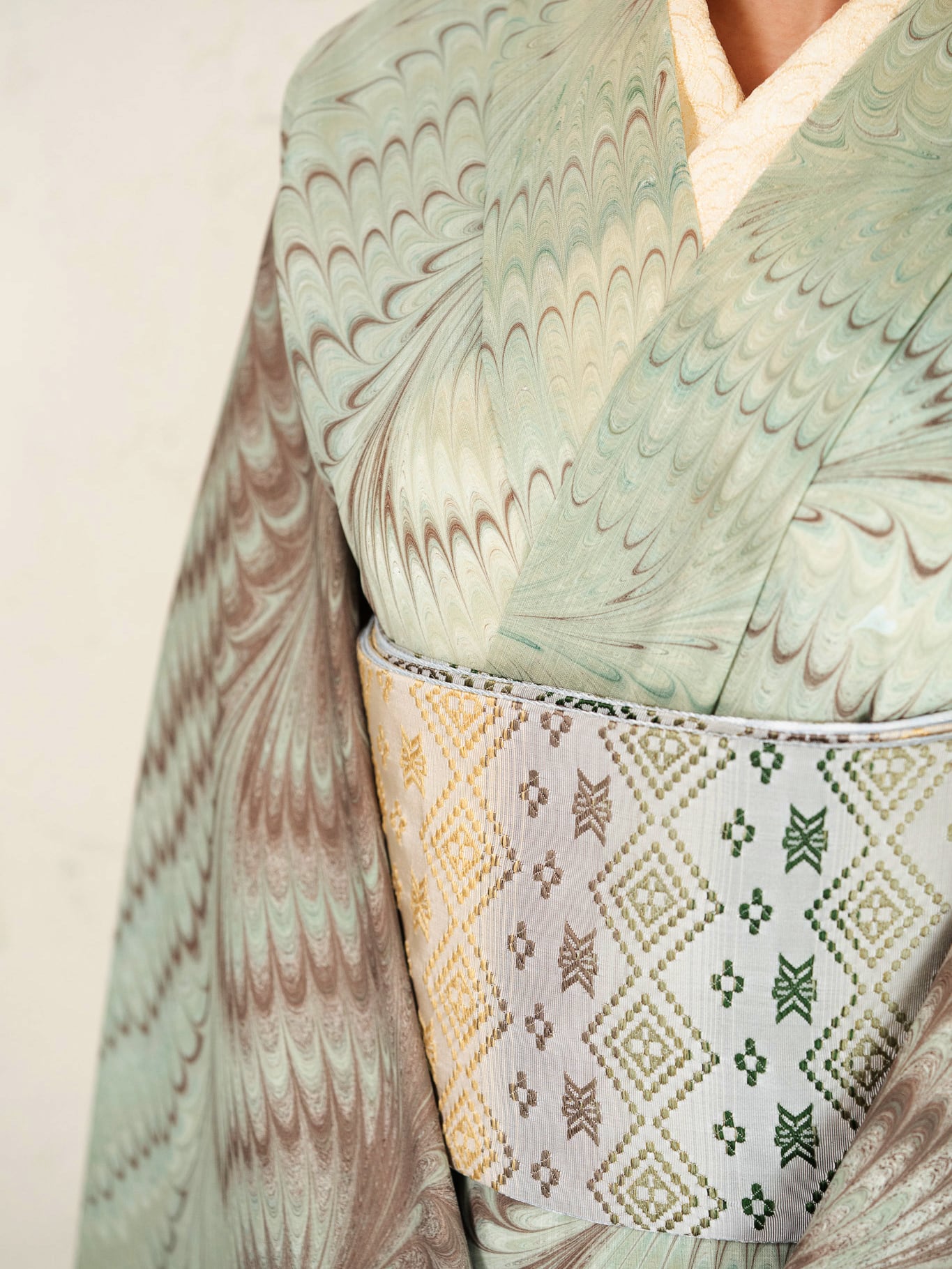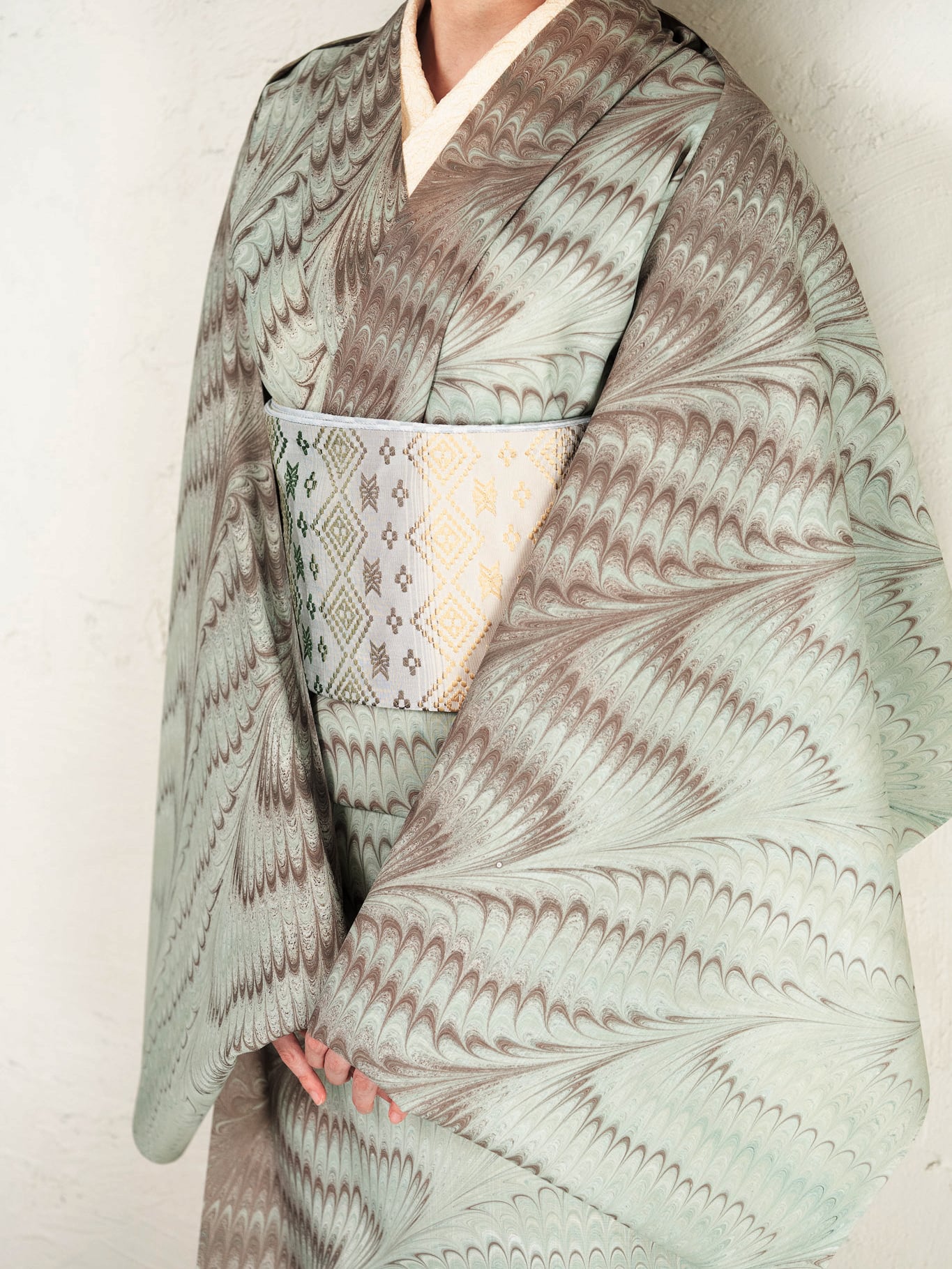 お仕立ての配置によって、衿元や身頃の印象が変わり、同じ反物の中でも異なる表情をお楽しみいただけます。