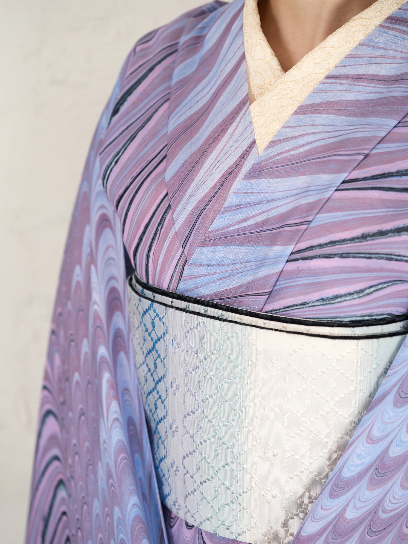 藤色を基調に、水色や淡い紫、深いネイビーのラインが重なり合う一反。