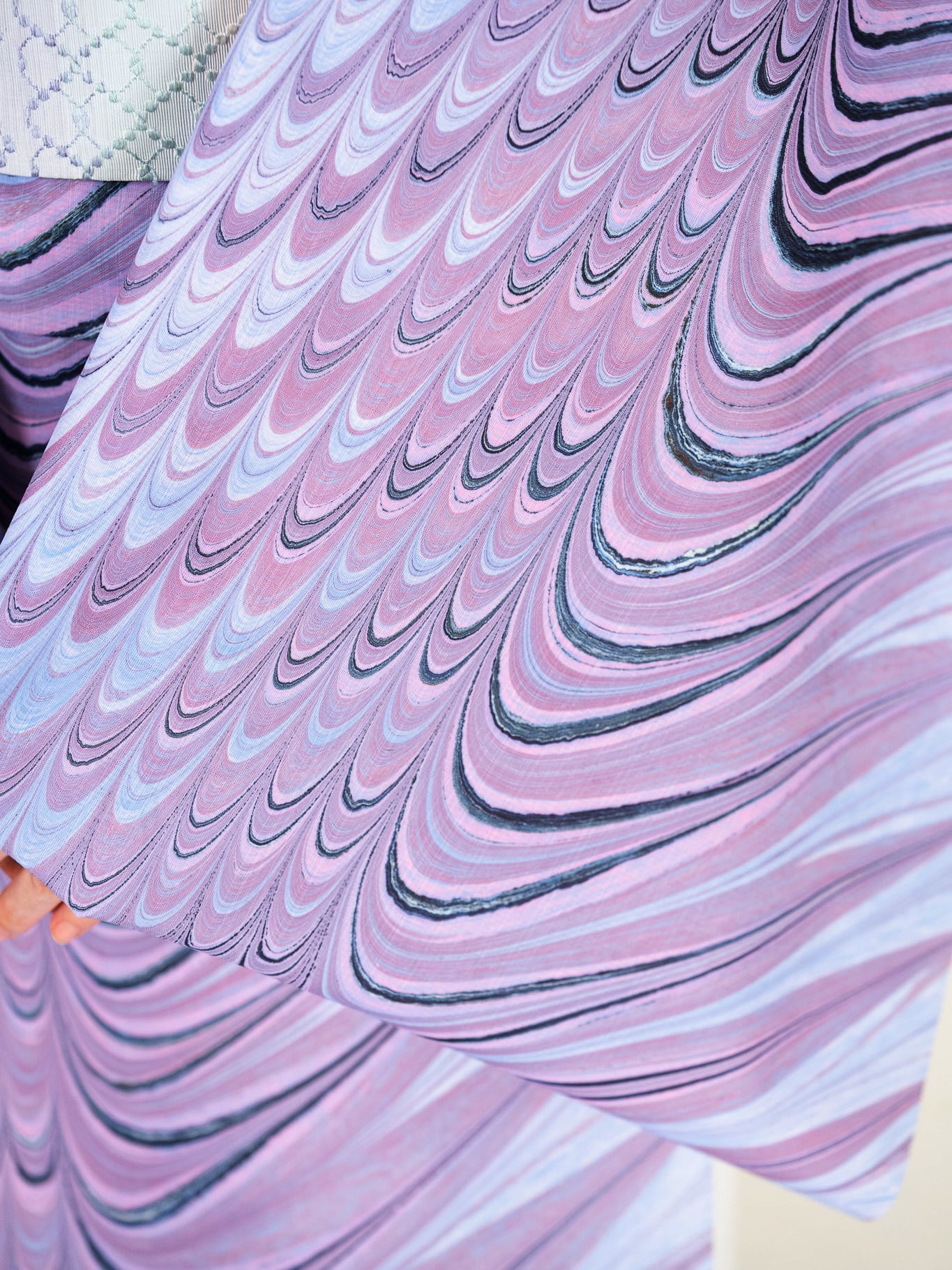 ピーコック柄のやわらかな広がりと、シャープなゆらぎが反物幅の中で染め分けられ、夜の海辺のようにどこか凛とした印象を感じさせます。