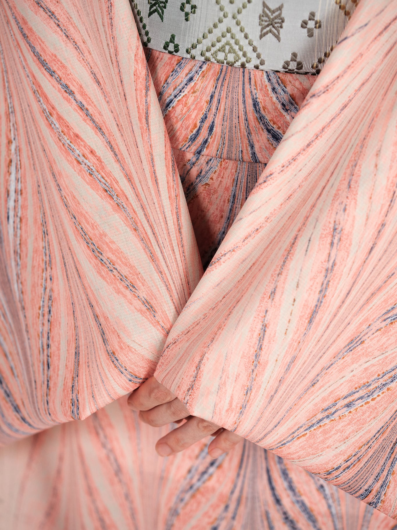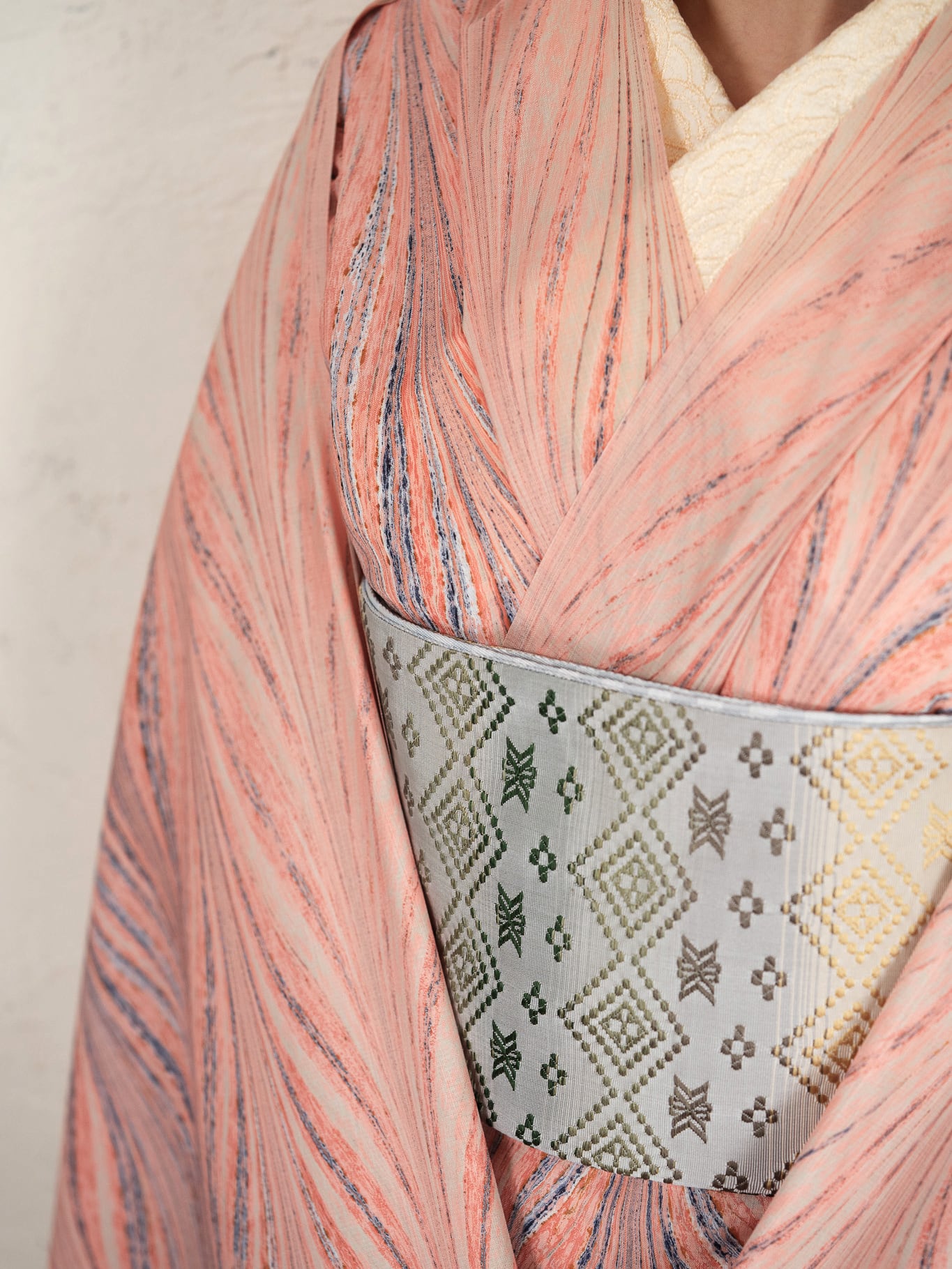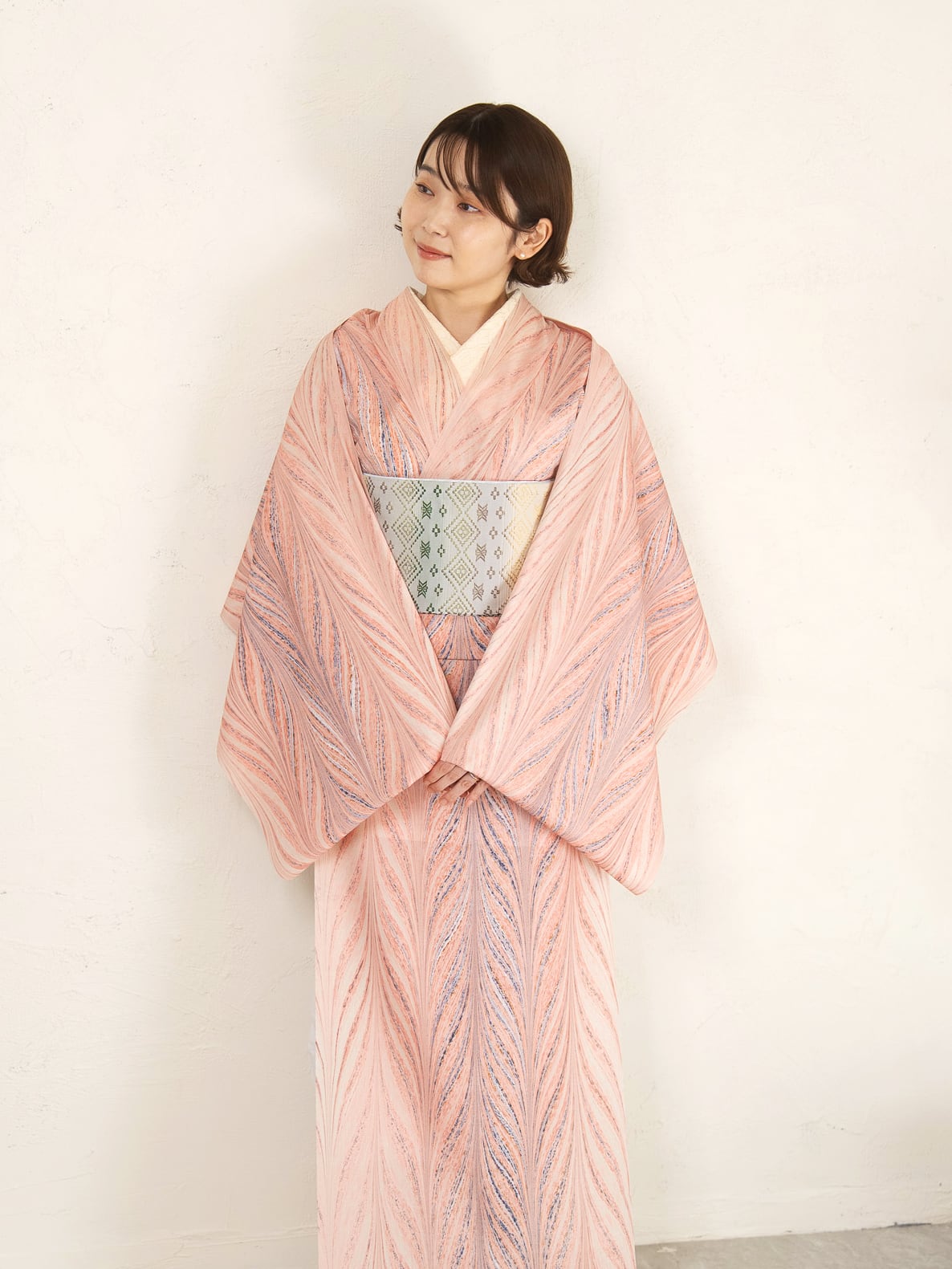 大矢羽柄の流れるような構成は、装いにすっきりとした縦の動きを生み、自然体でありながら、どこか洗練された印象に。