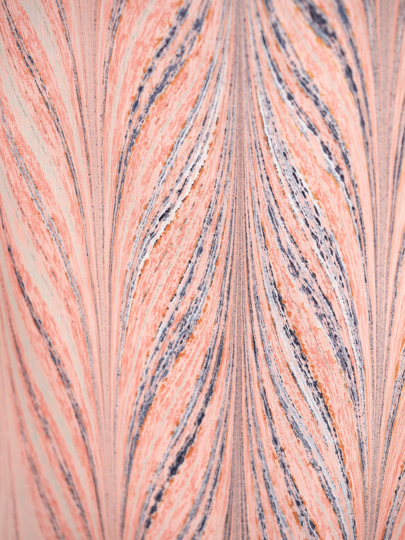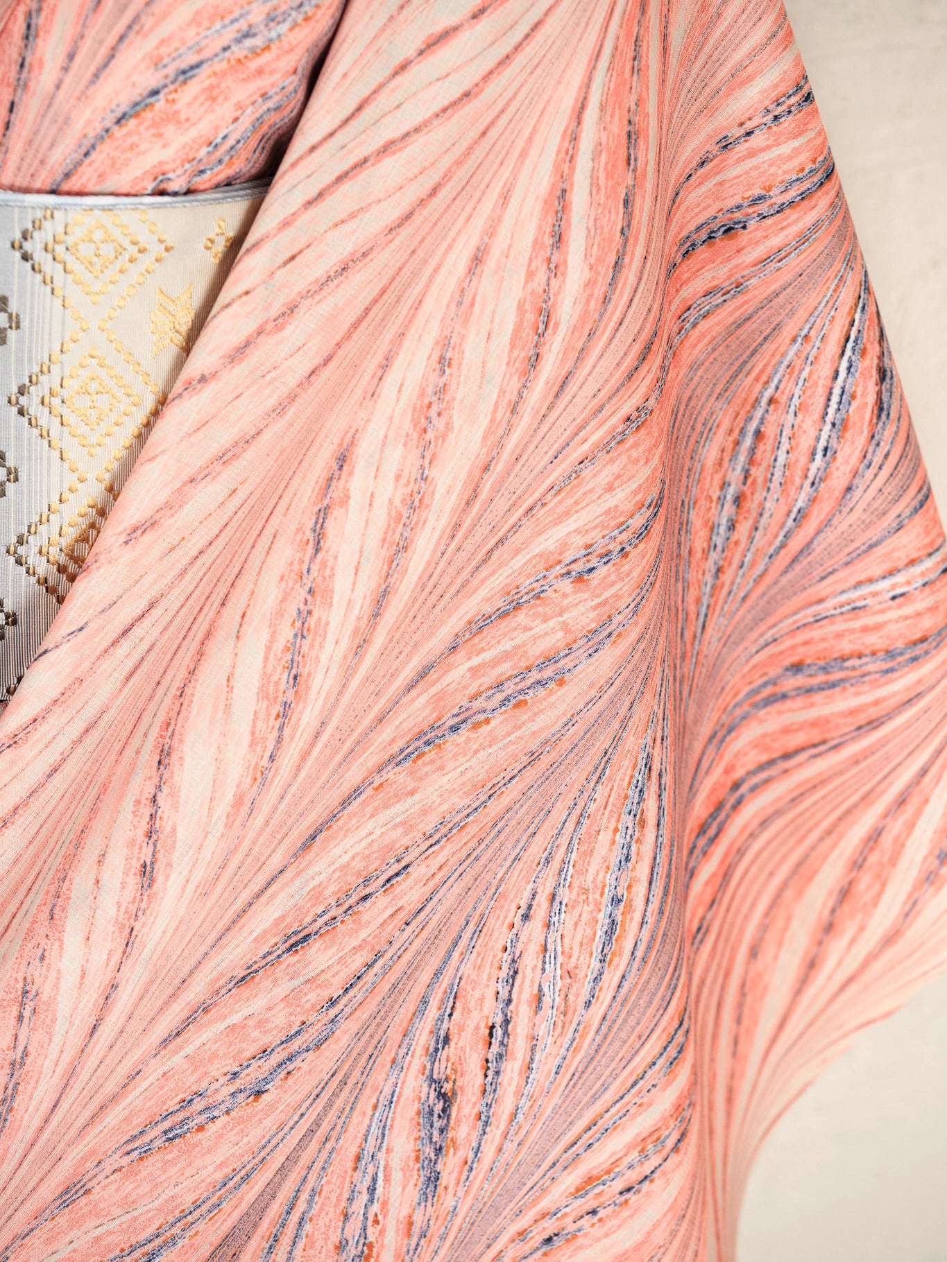 やわらかなオレンジとベージュを基調に、中心へ向かって重なるネイビーのラインが、軽やかな中にも凛とした表情を添える作品です。