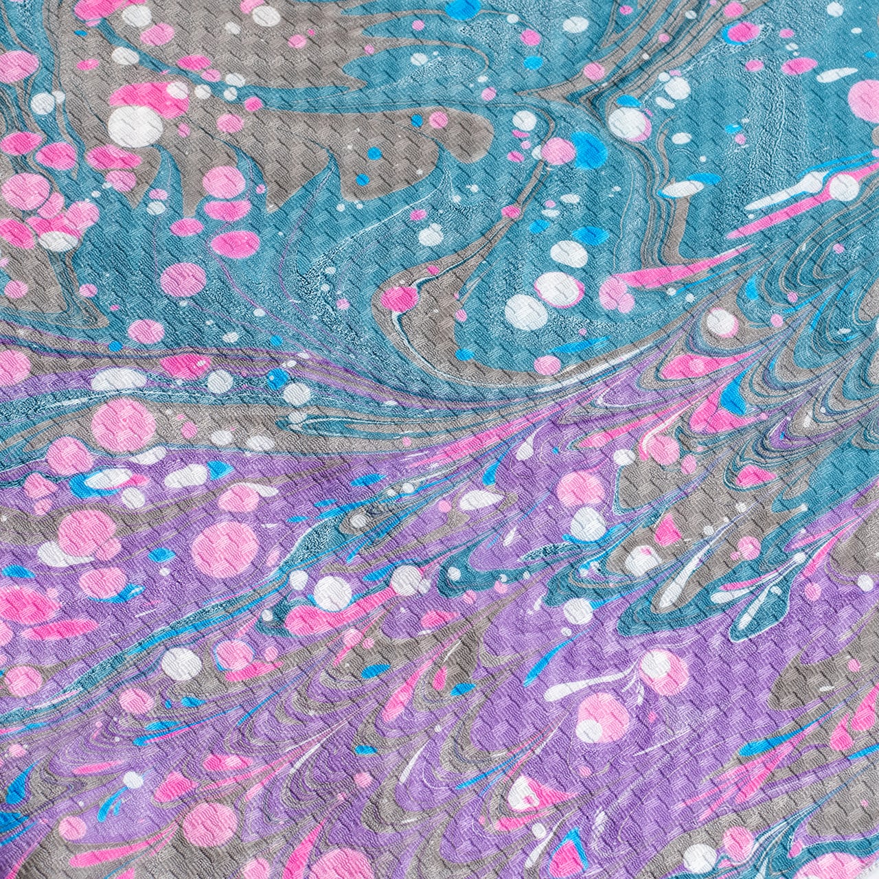 手とタレ部分に当たる両端を紫、お腹に当たる部分をブルーに染め分けをして、ピーコック柄、マーブル柄でリバーシブルでご使用いただけるデザイン。さらに!花びらのようなピンク、白、ブルーのドットを散らし、ところどころにハートを描きました。落ち着いた色合いで何にでもよく合う配色ですがカラフルなドットにより洒落感がアップします。