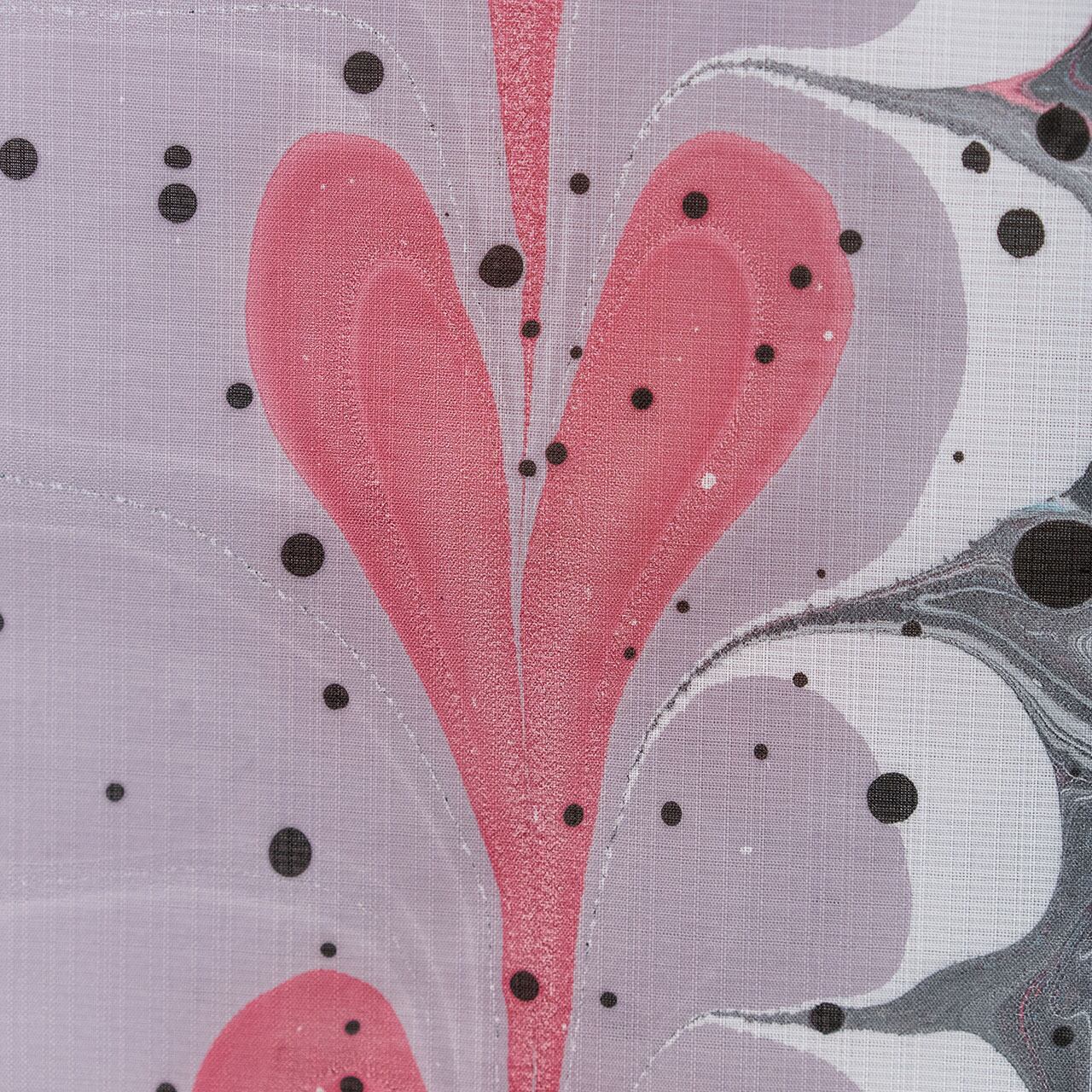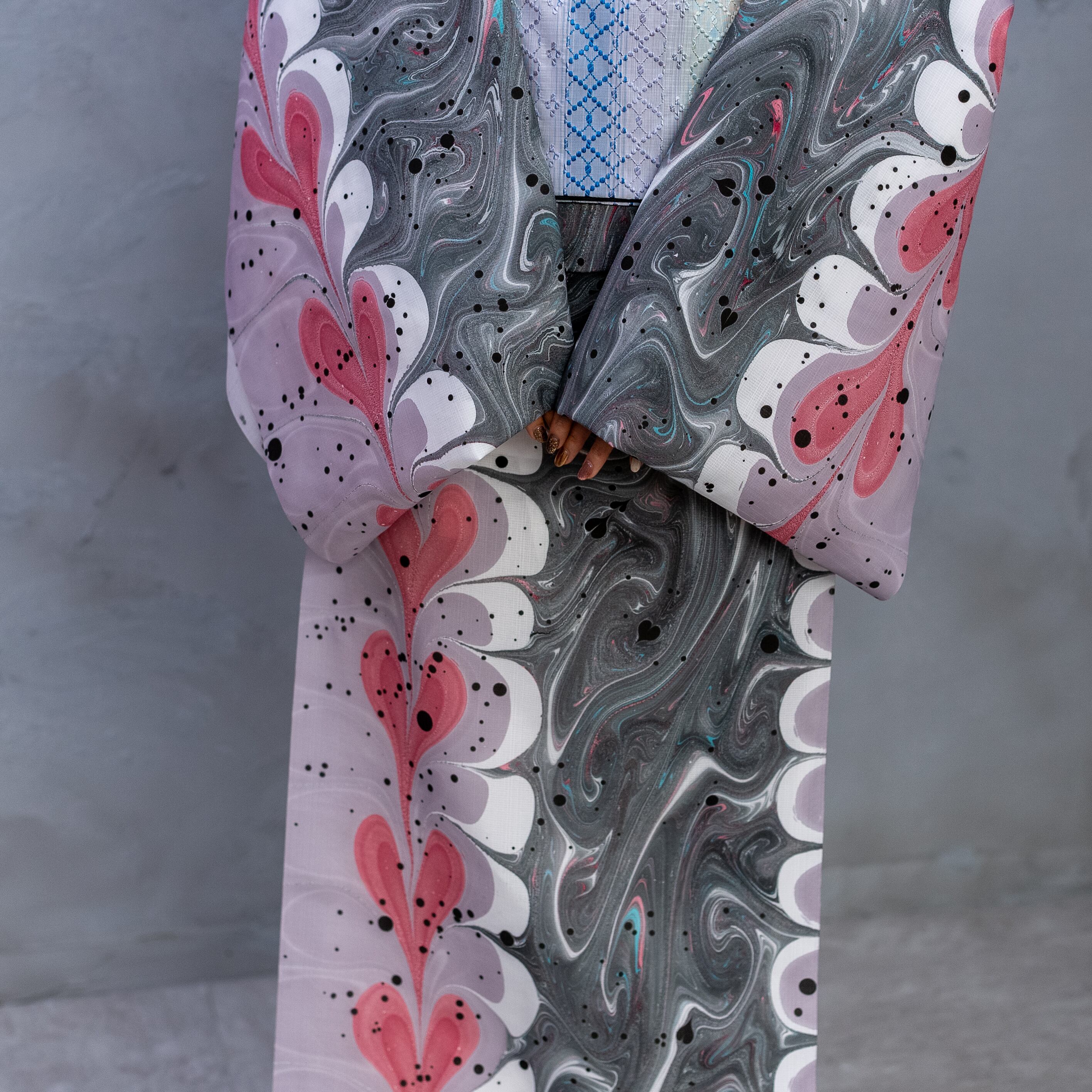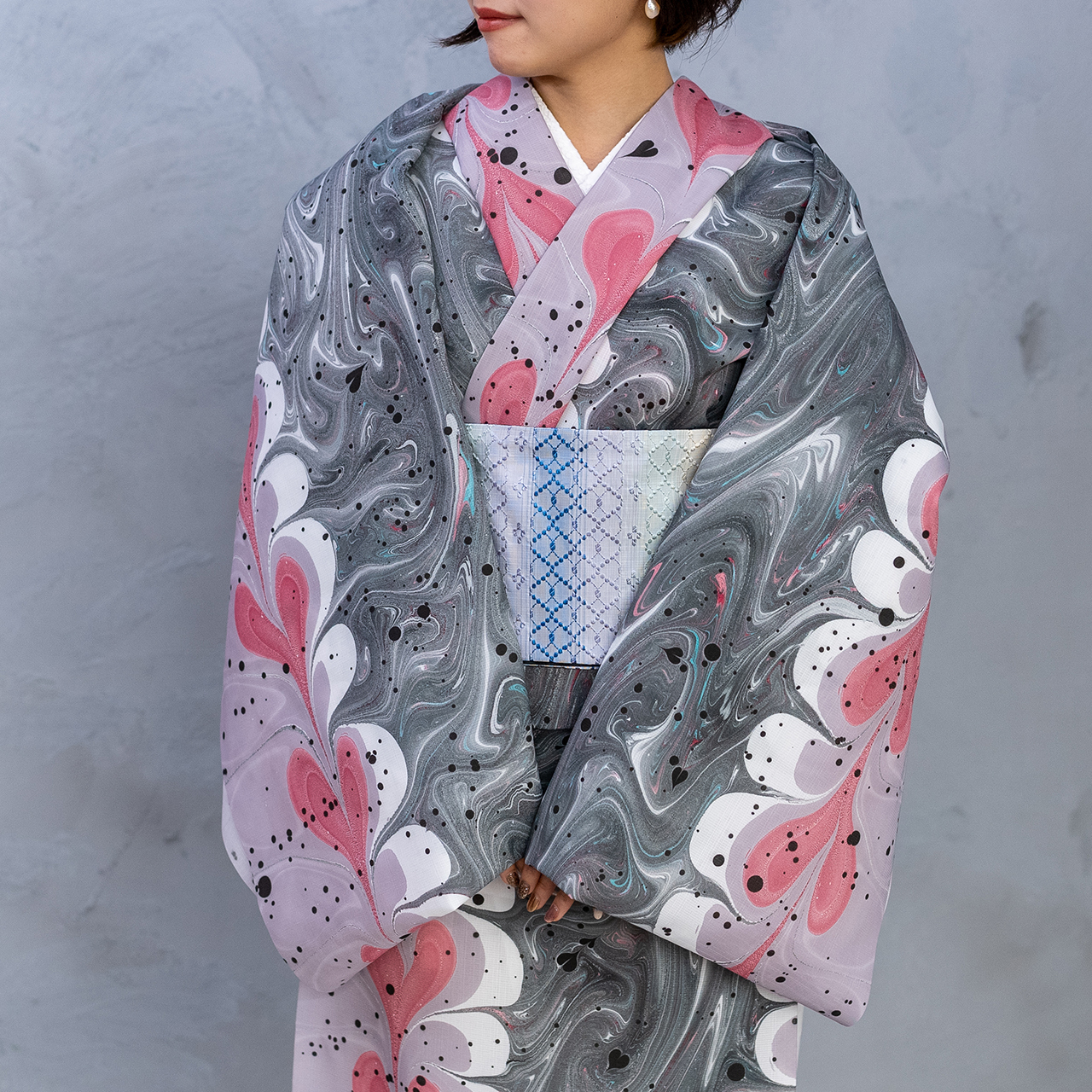 「一捻りあるハート柄メインのデザイン」の着物を作りたく、通常の恭平墨流しの染色のセオリーとは異なり、水面上で遊ぶように動かしてイメージに近づけました。