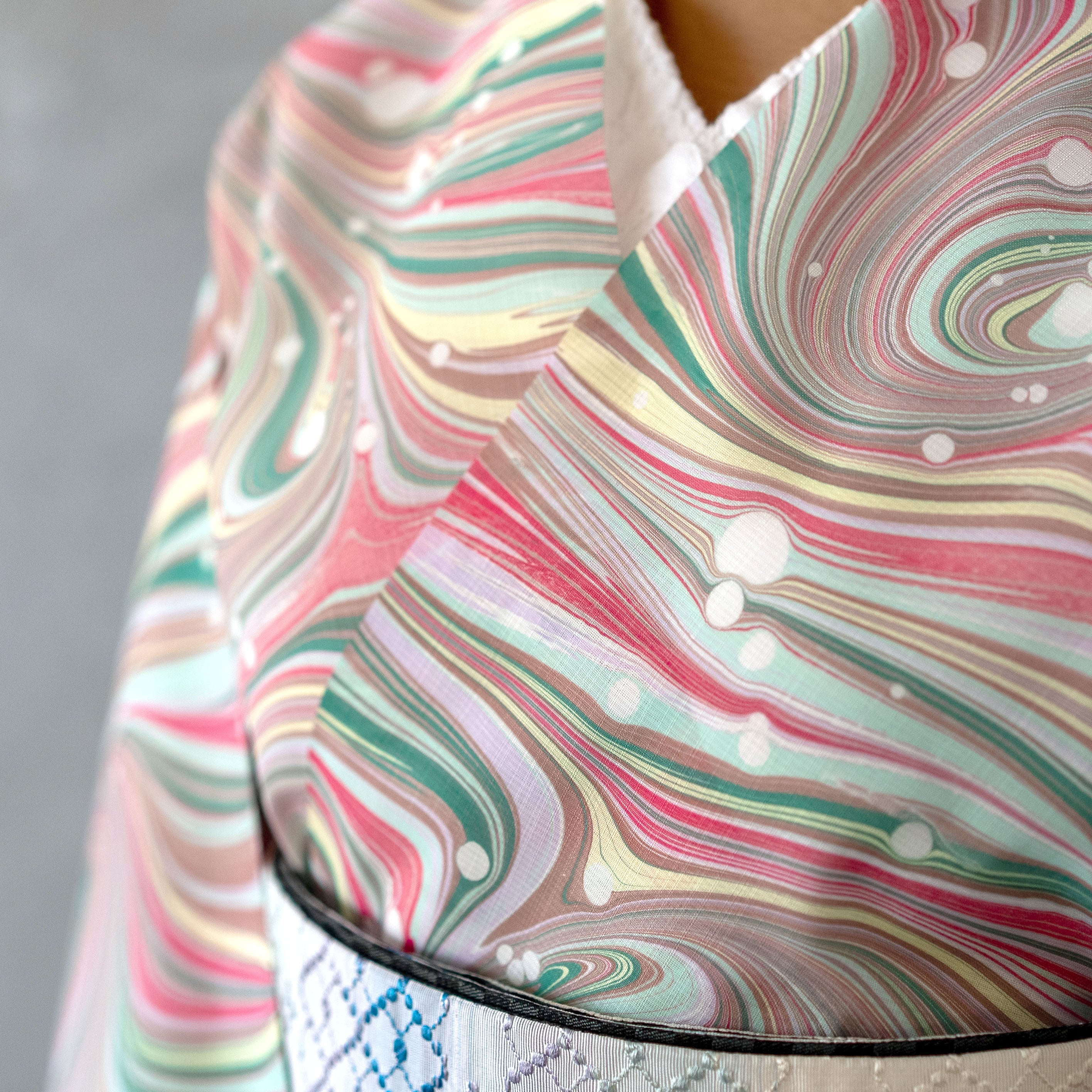 これまで多色の墨流しは細やかな柄に仕上げる傾向がございましたが、遠目でみても写真に映っても墨流しの大きな動きを感じる柄を制作したい思いで、本作品をデザインしました。