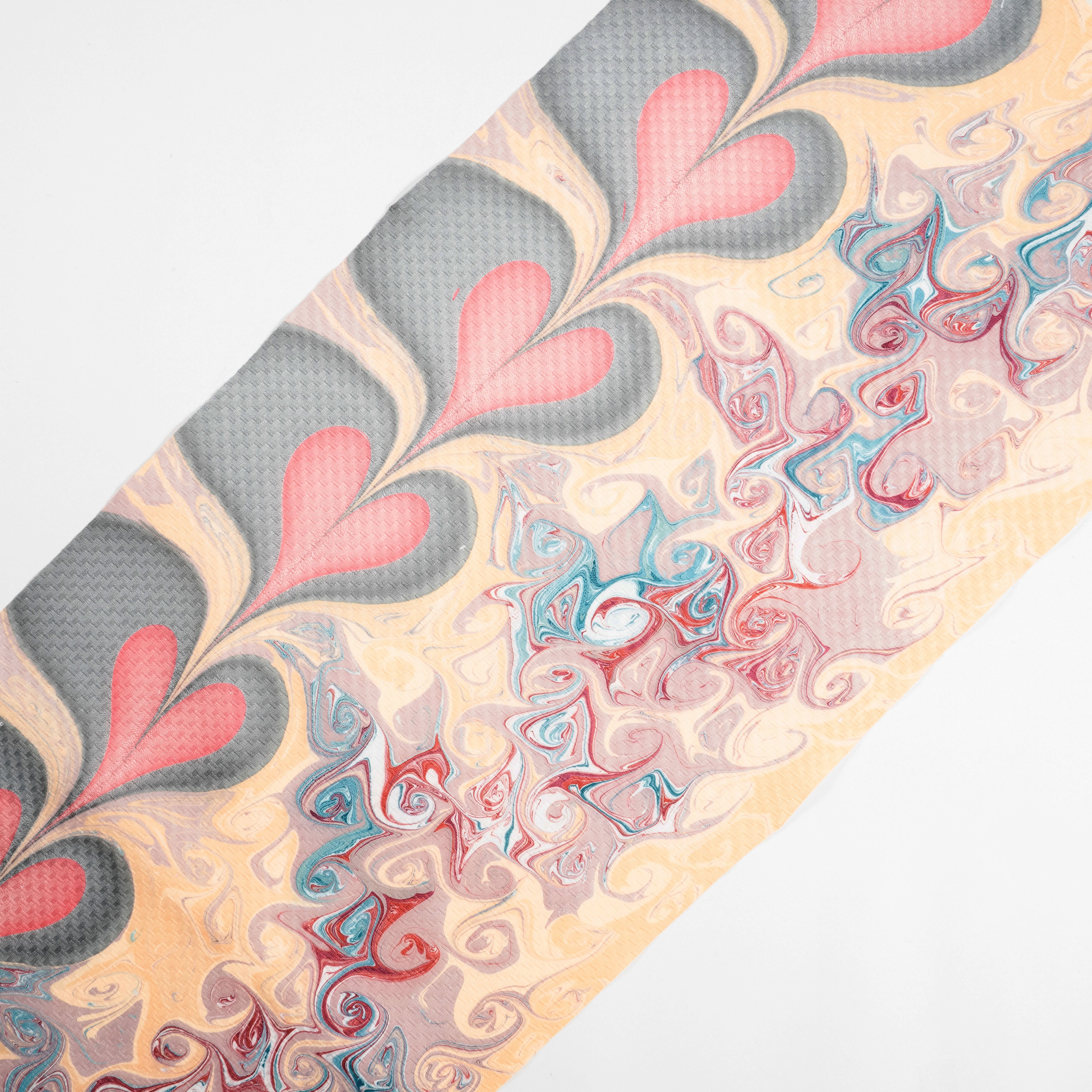 立体的なハートモチーフがチェーンのように繋がっているデザインが目を惹く作品。ハッピーなムード溢れる配色に、薔薇の花束のようなマーブル柄が遊び心たっぷりの作品。