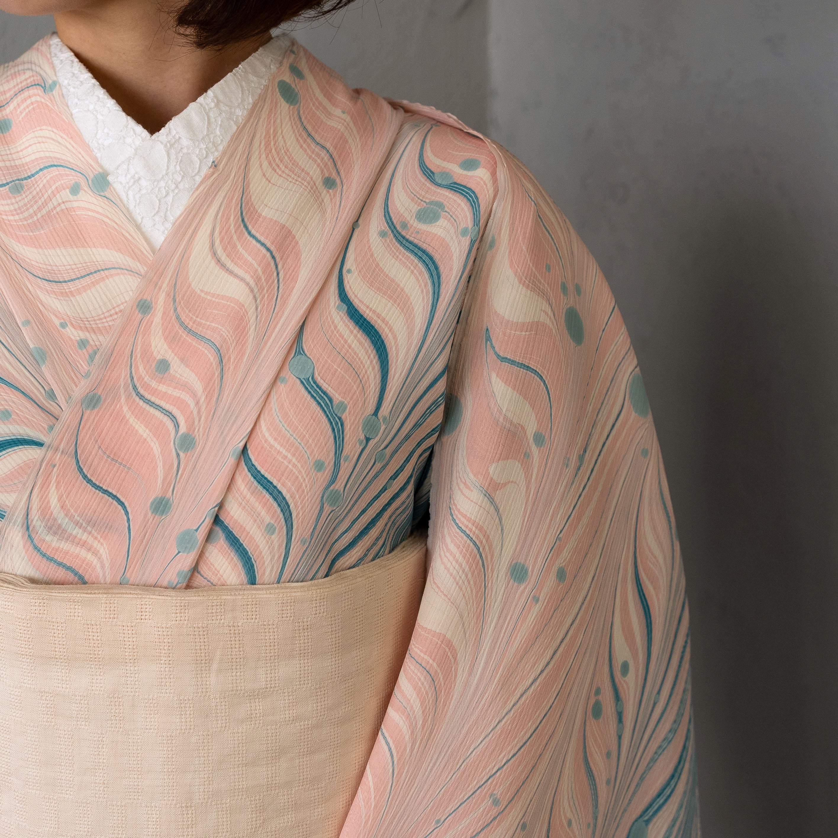 ピンク色に染まる空や海の美しさを表現した色合いの大矢羽柄にブルーのドットが爽やかで幻想的。反物巾で染め分けているため仕立てる際の色配置でも遊べます。