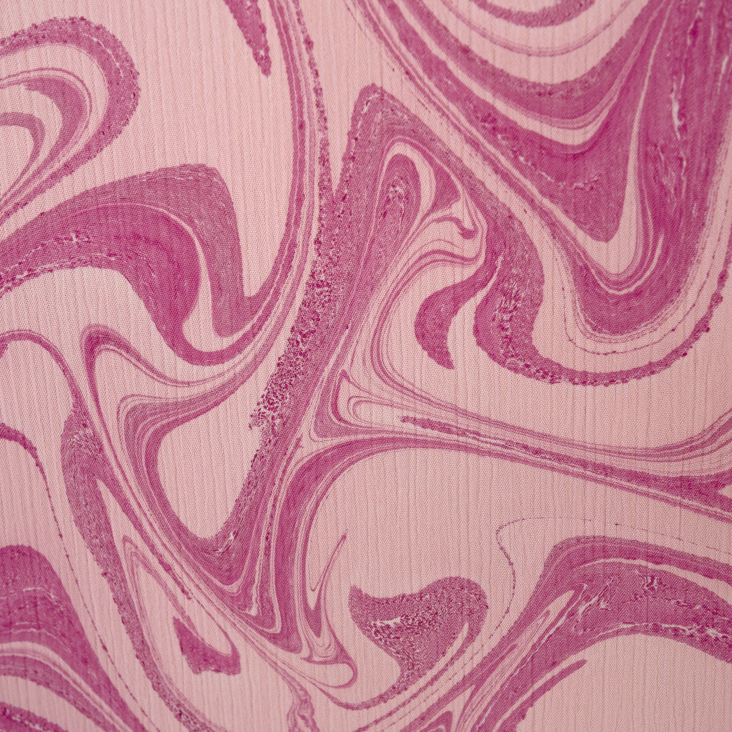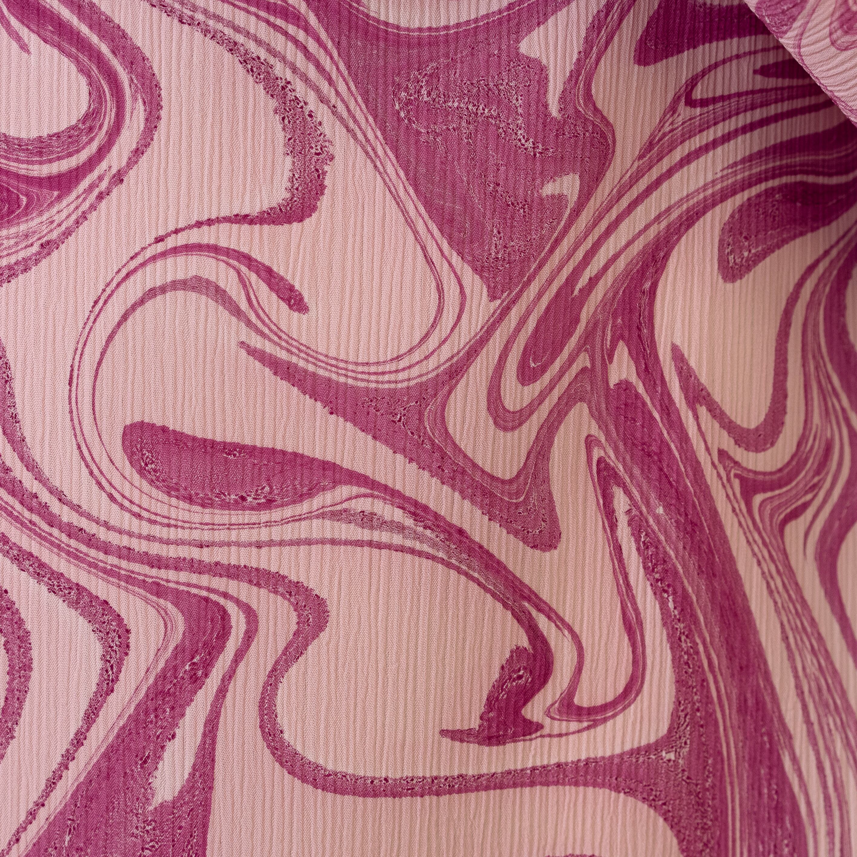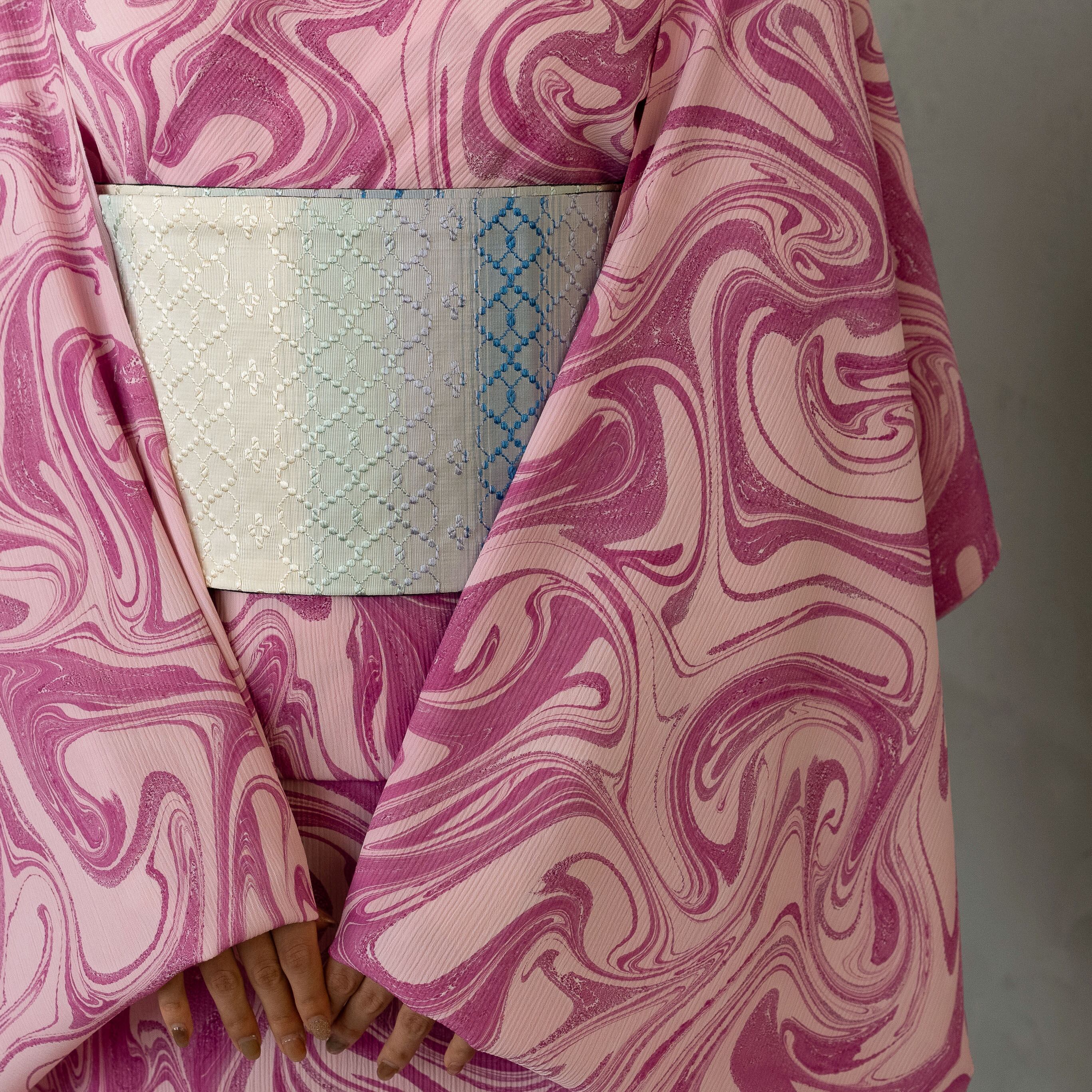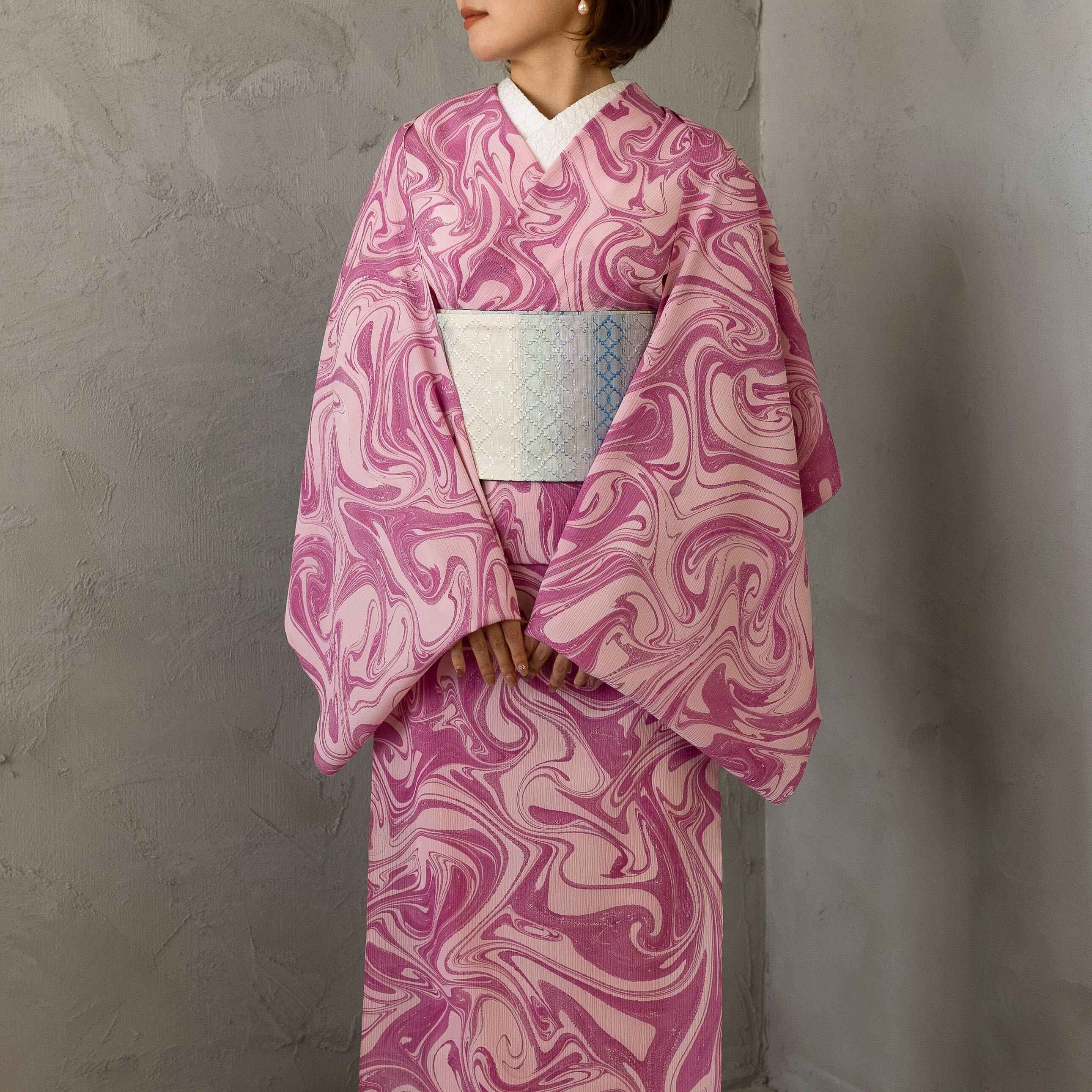 墨流し技法で濃く鮮やかな色を表現するのは至難の業です。白場を一切残さず染め上げられたこの作品は、作家・恭平の卓越した技術の賜物です。見事に発色した牡丹色が、優雅で洗練された一着に仕上がっています。