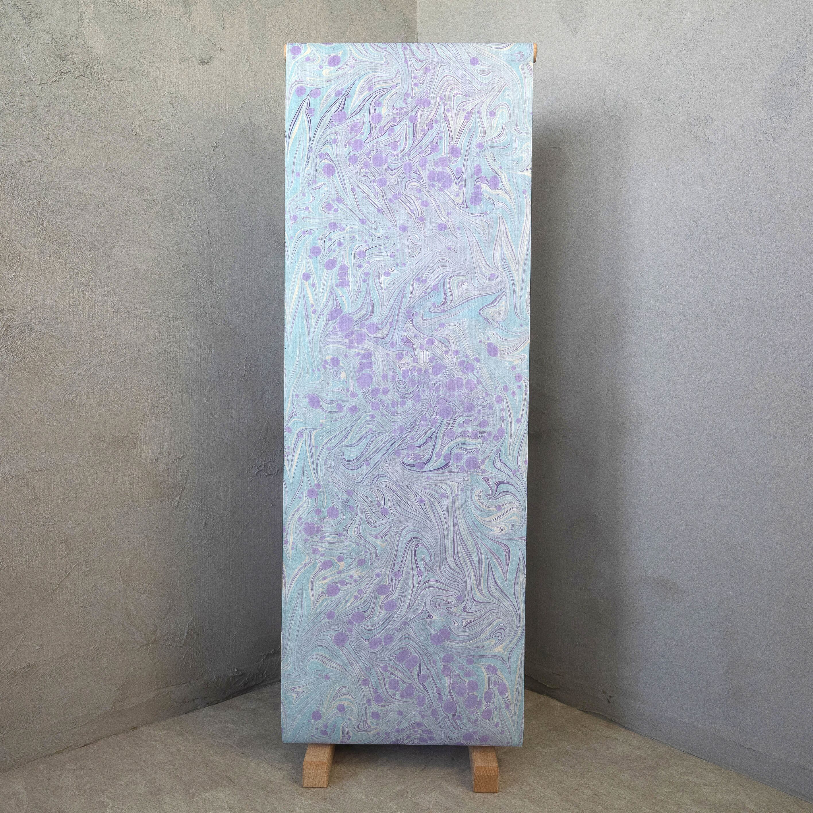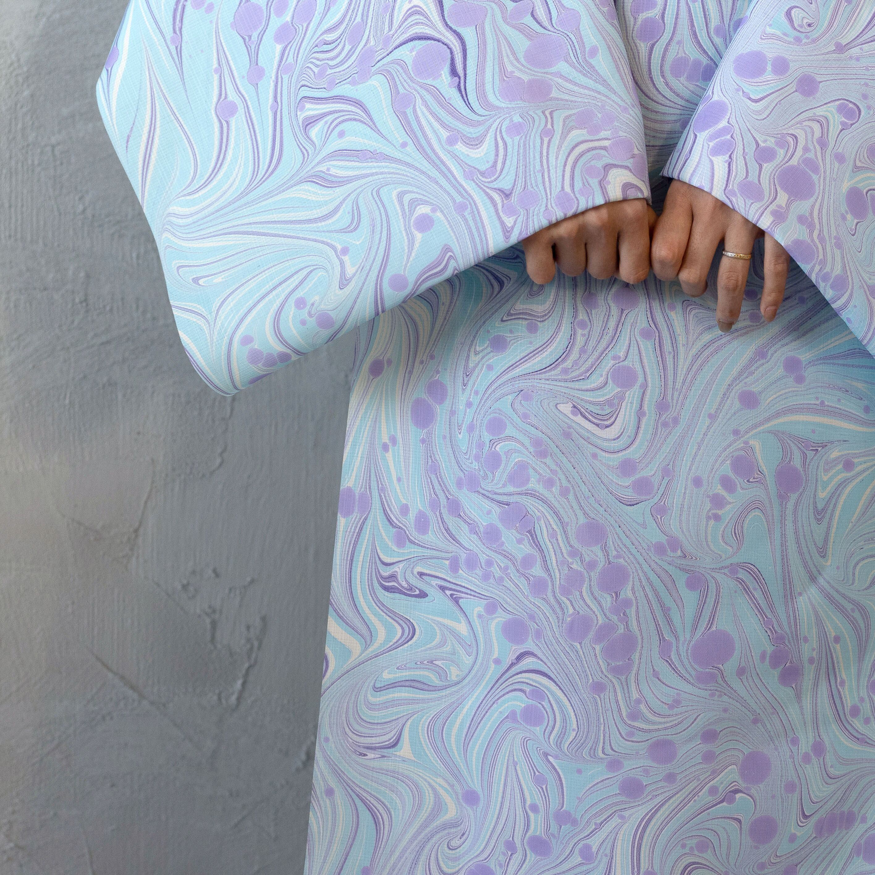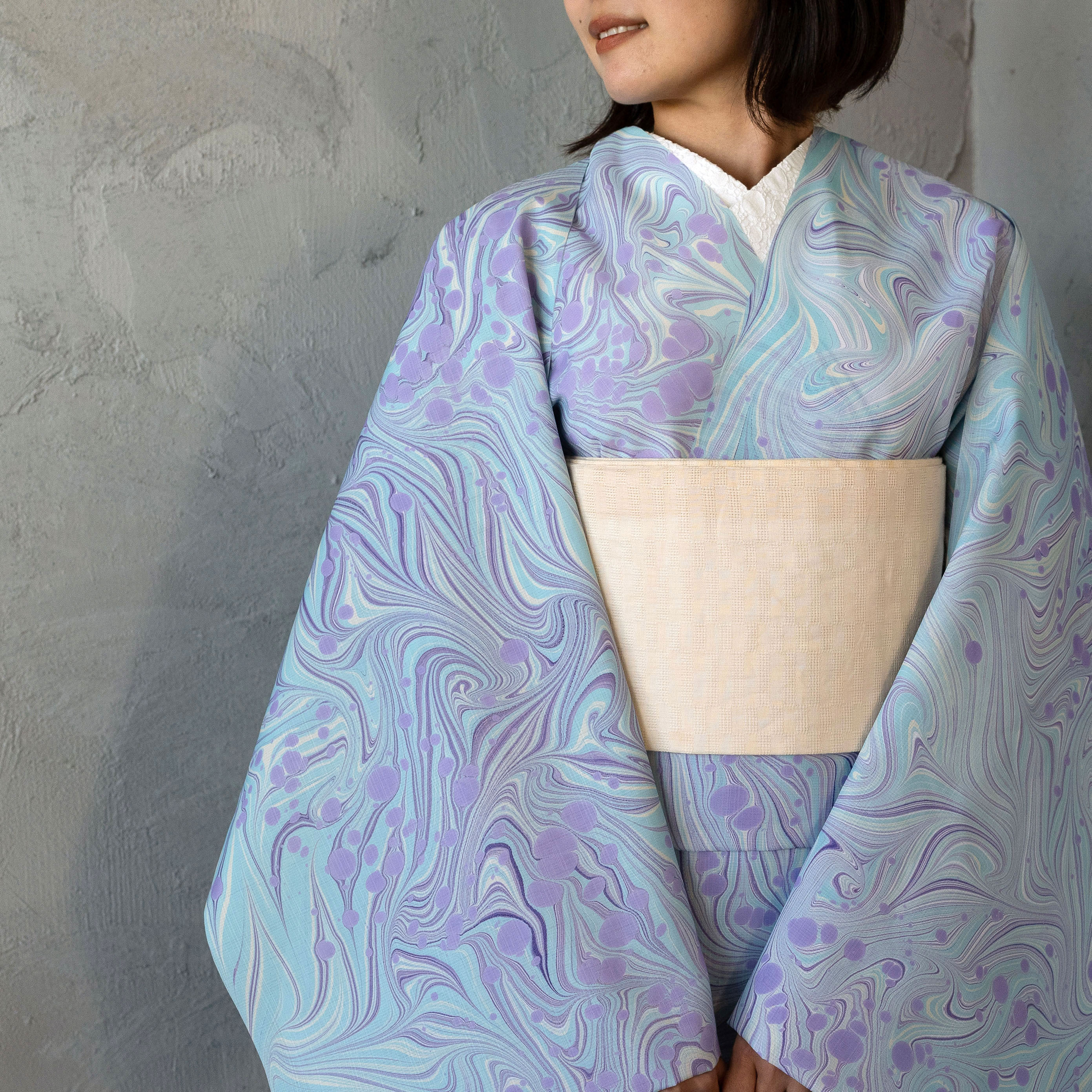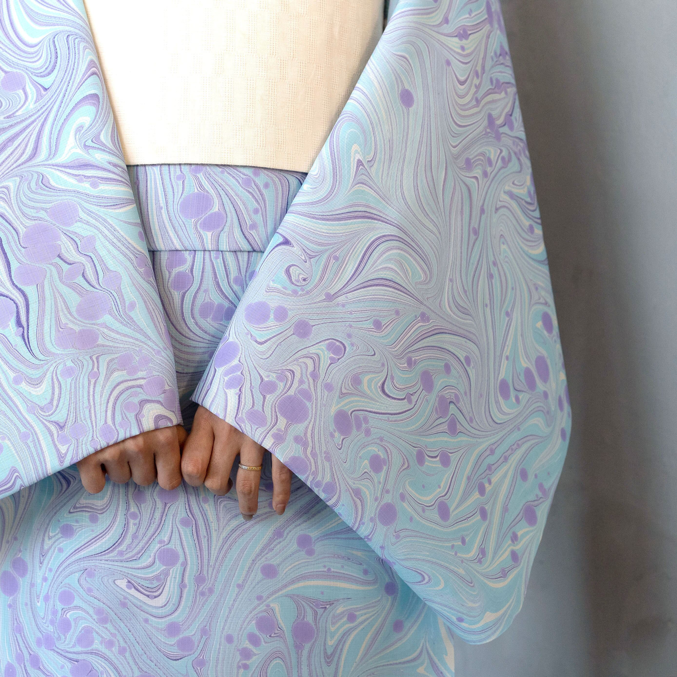 透明感のある美しい水色と紫色が目を惹く作品。水中で揺れている水草のような柔らかい動きを感じる柄と、不規則に施されたドットが夏の暑さを忘れさせる涼やかさを醸し出します。